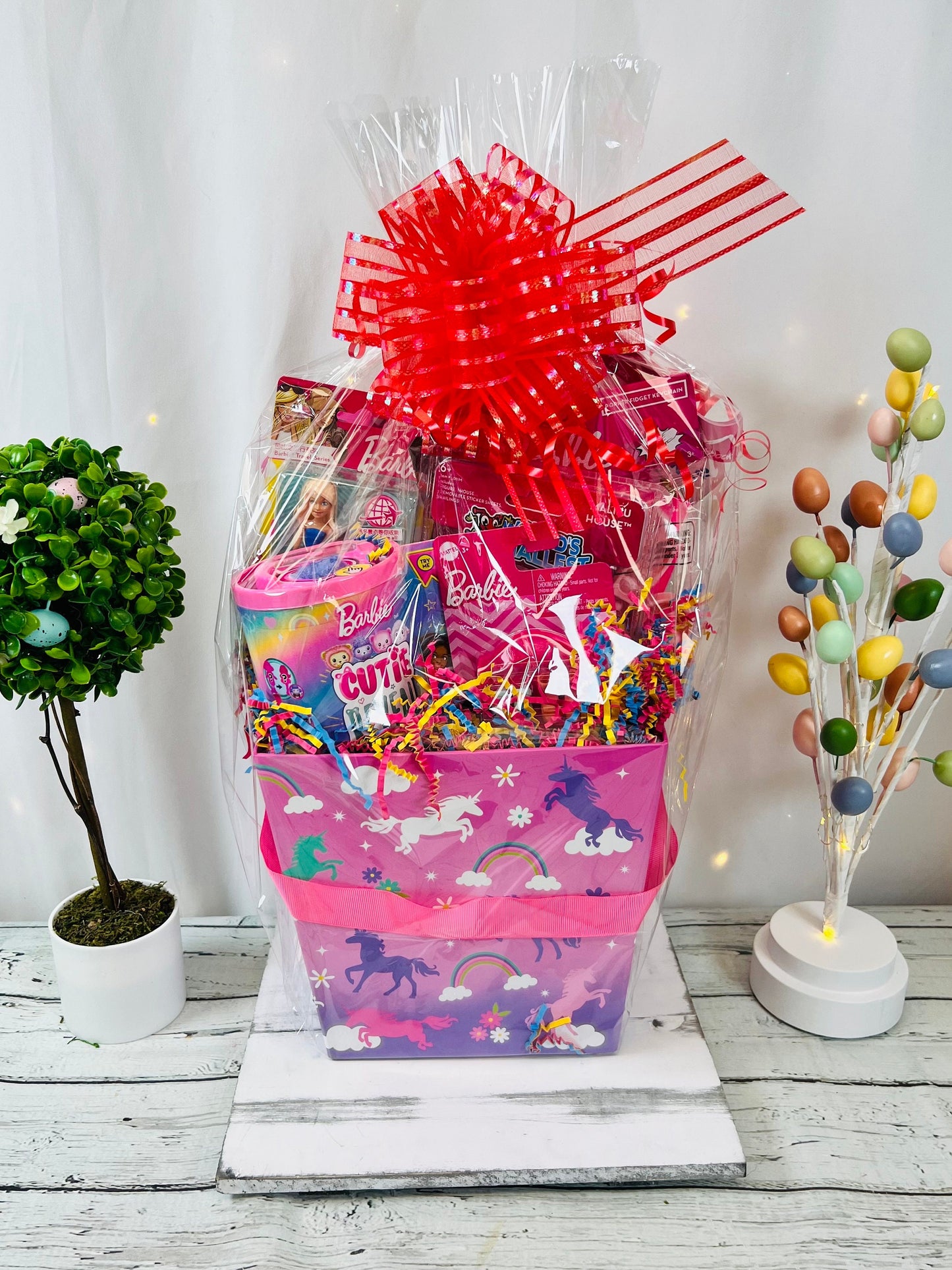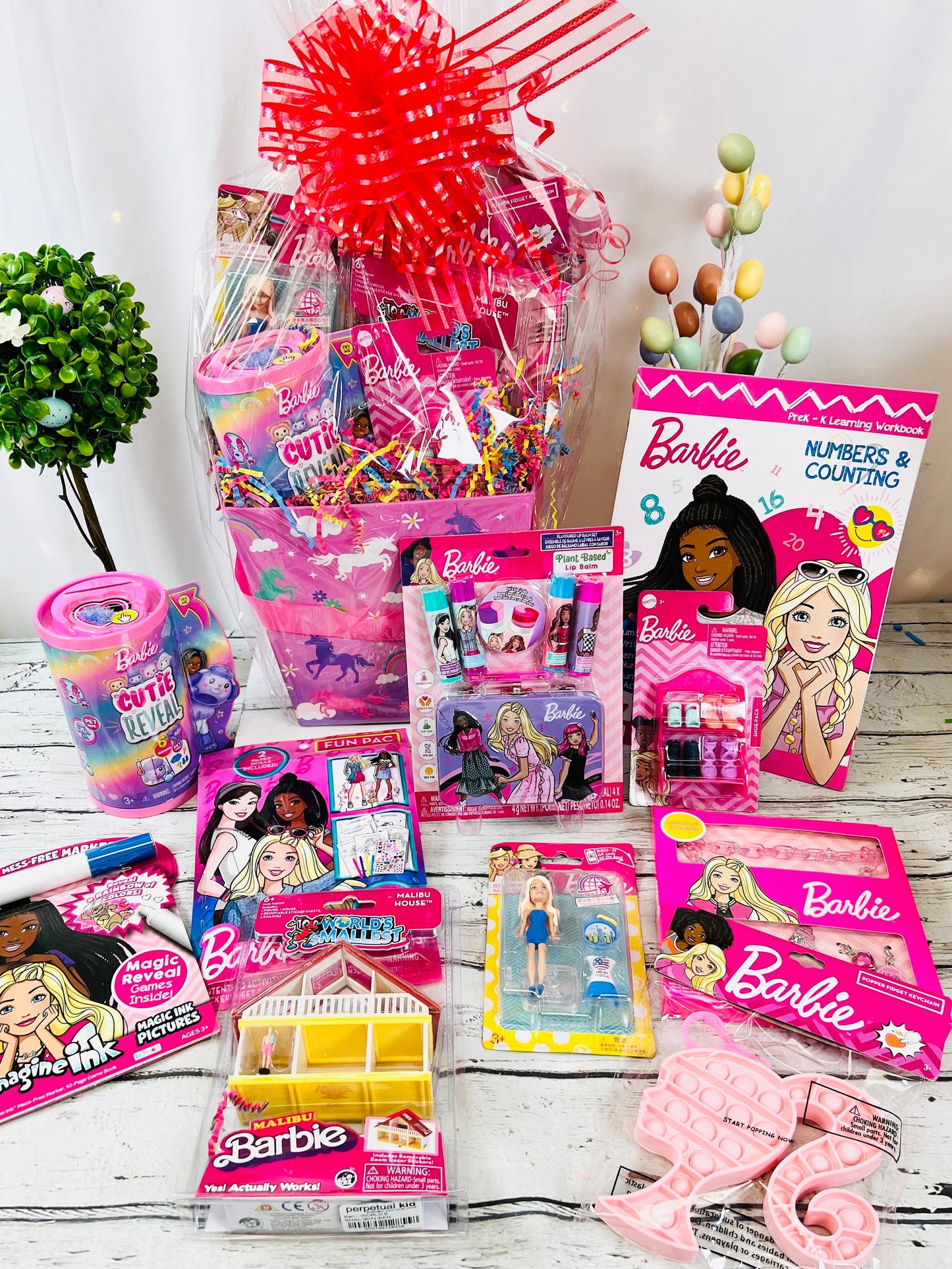 10 Piece Pre-filled Fashion Doll Themed Easter Basket. This basket is wrapped in clear cellophane and topped with a large bow. This basket includes: