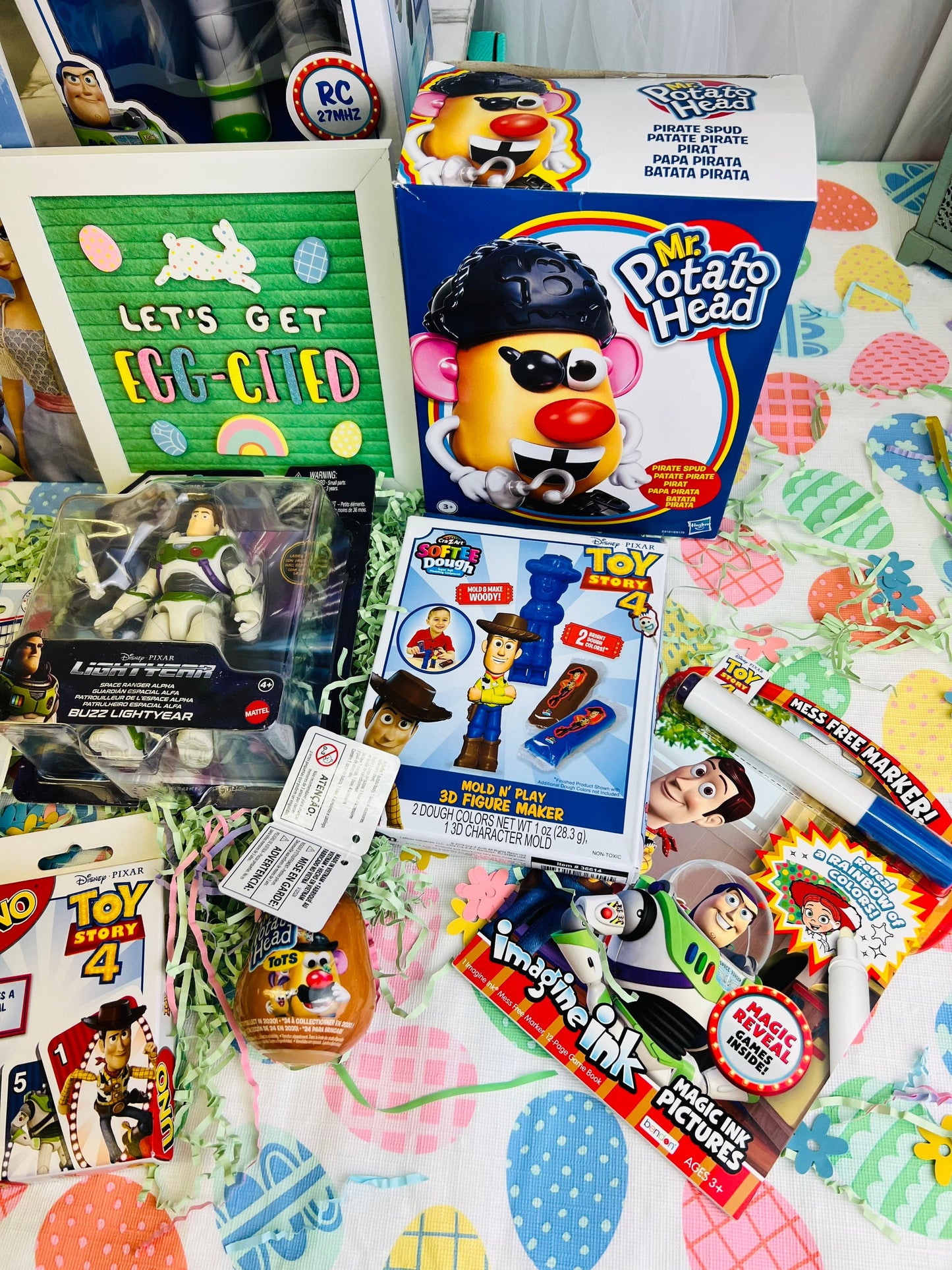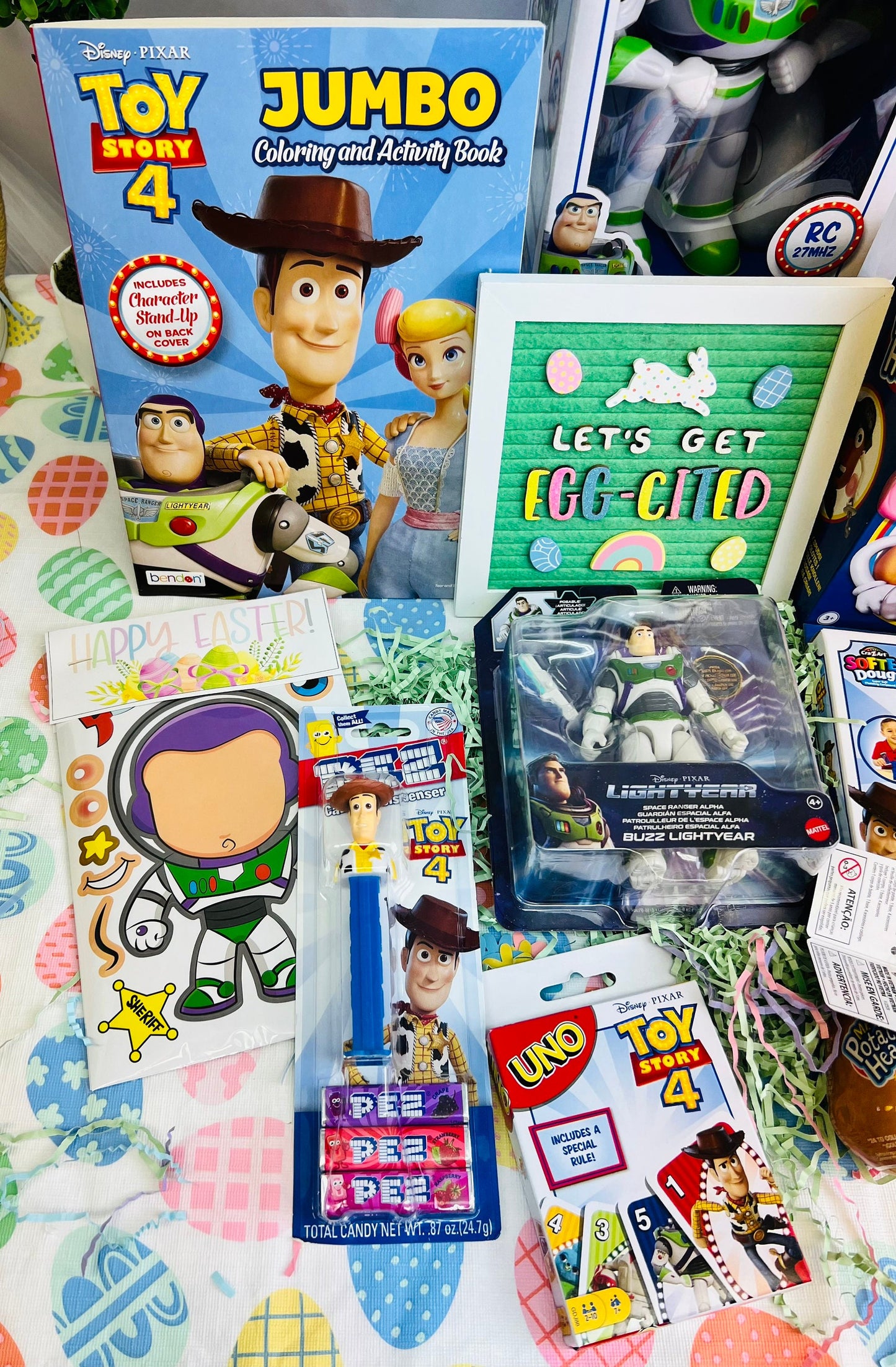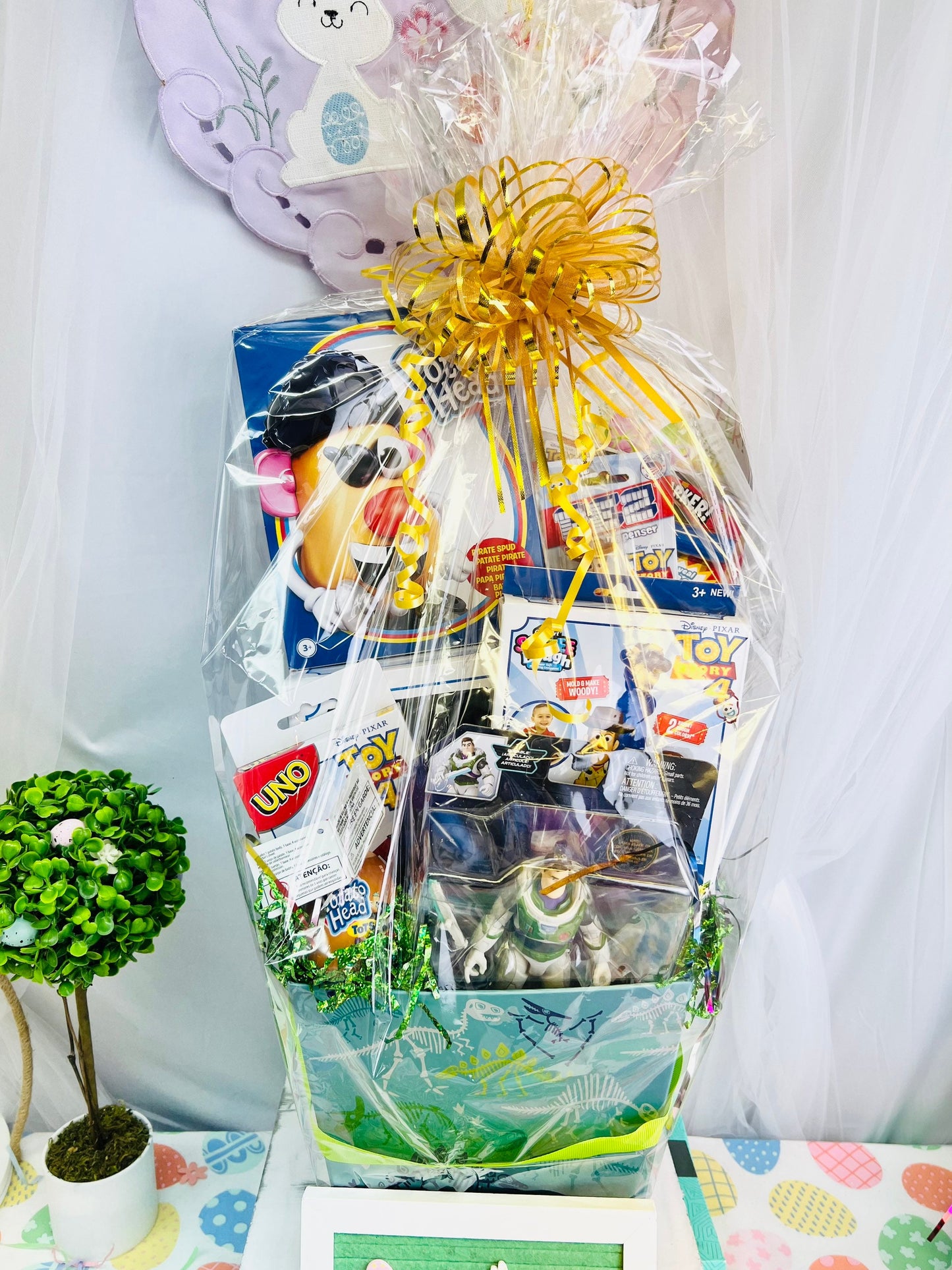Please Upgrade to PRIORITY for 3 day shipping. 10 piece prefilled Toy Story themed easter basket for kids. This basket is wrapped in clear cellophane and topped with a large bow. THis basket includes: