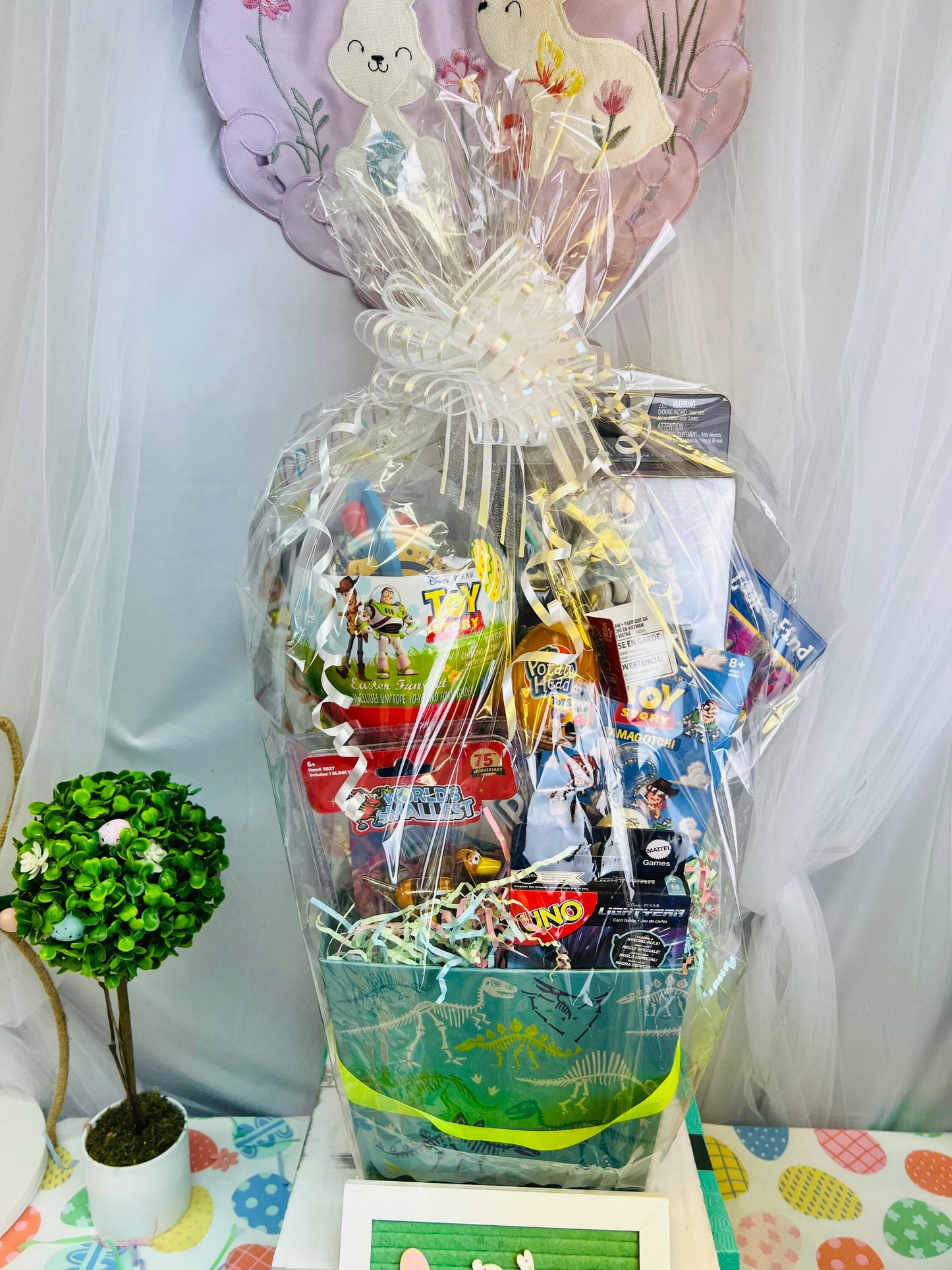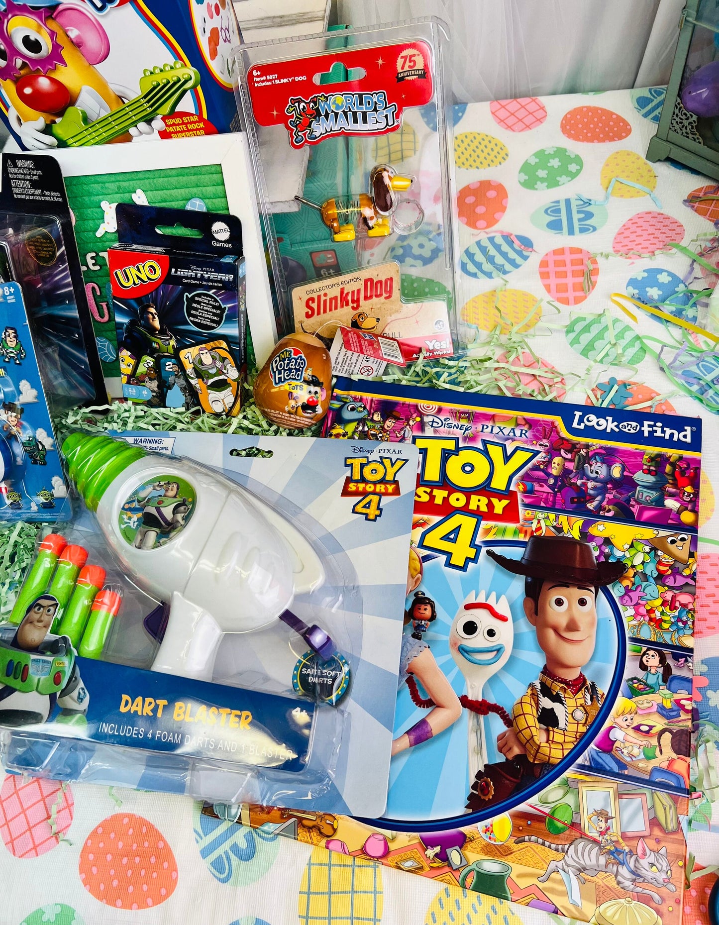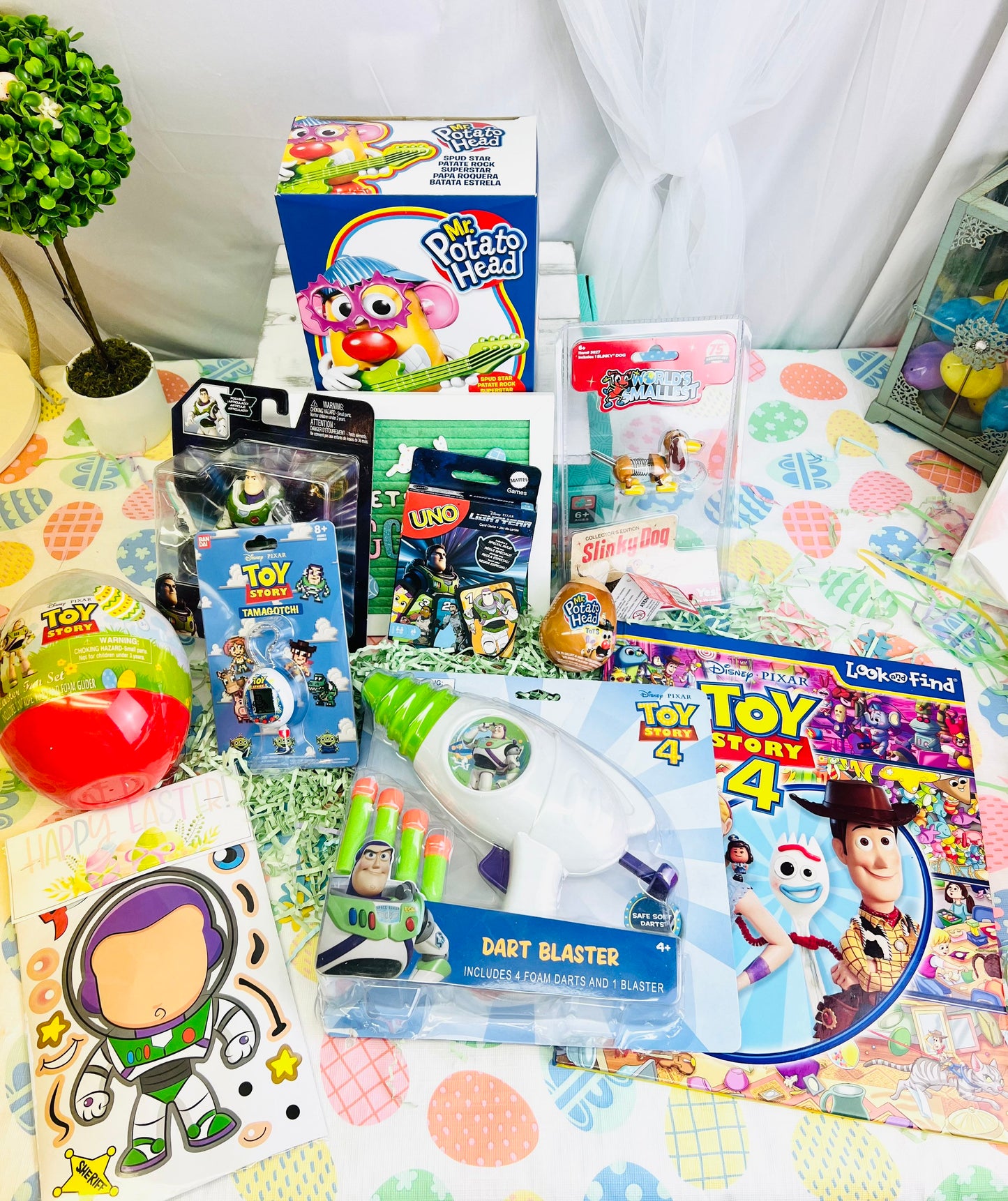 10 piece prefilled Toy Story themed basket for kids. This basket is wrapped in clear cellophane and wrapped with a large bow. This basket includes: