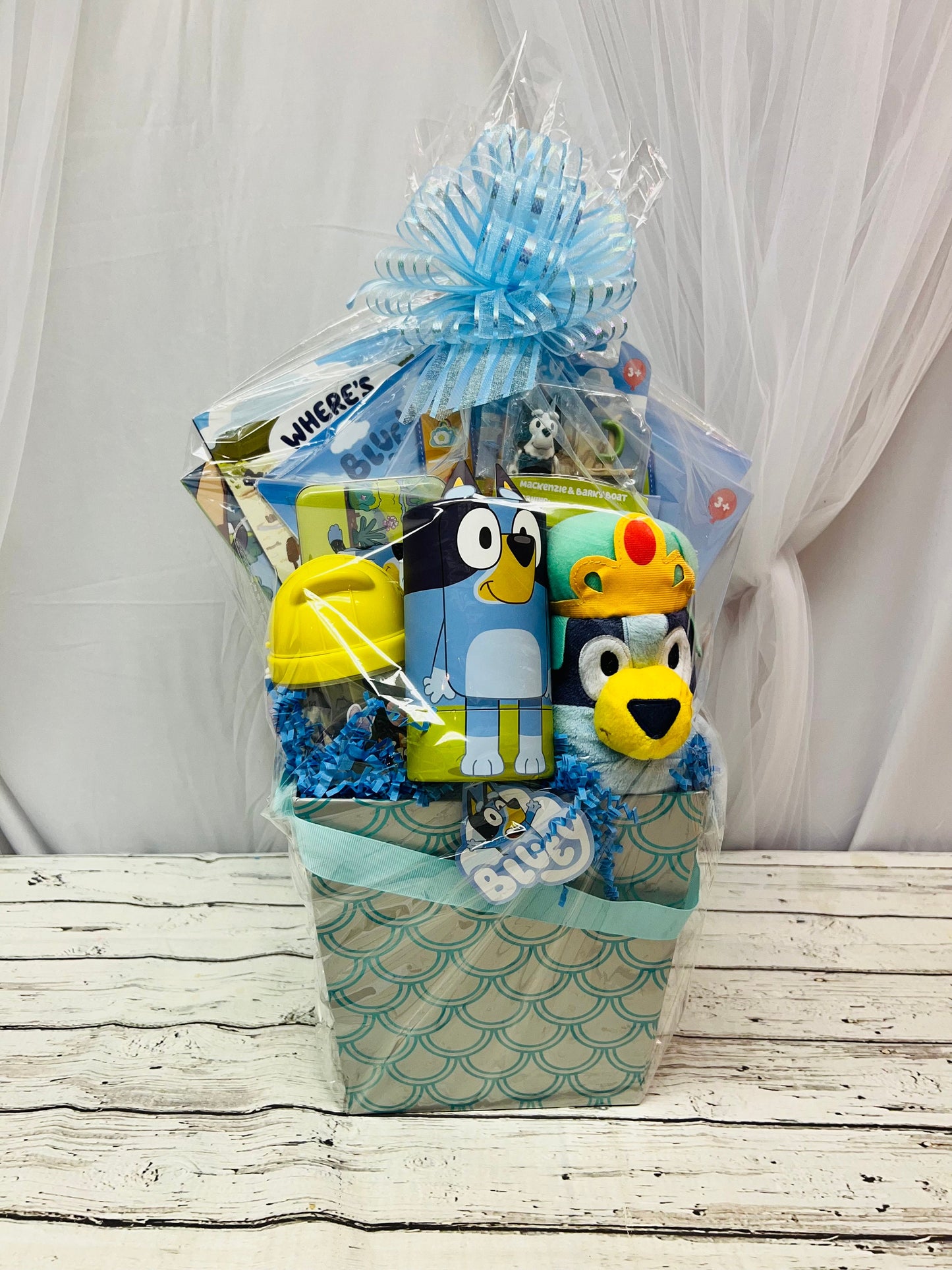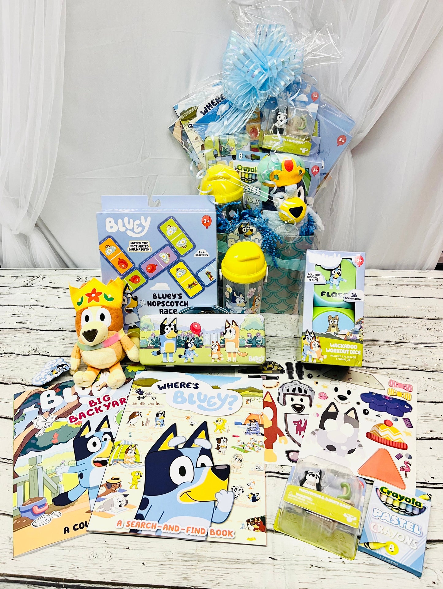 11 piece Bluey dog prefilled gift basket for kids. This is a wonderful gift basket for any Bluey/Bingo lover.