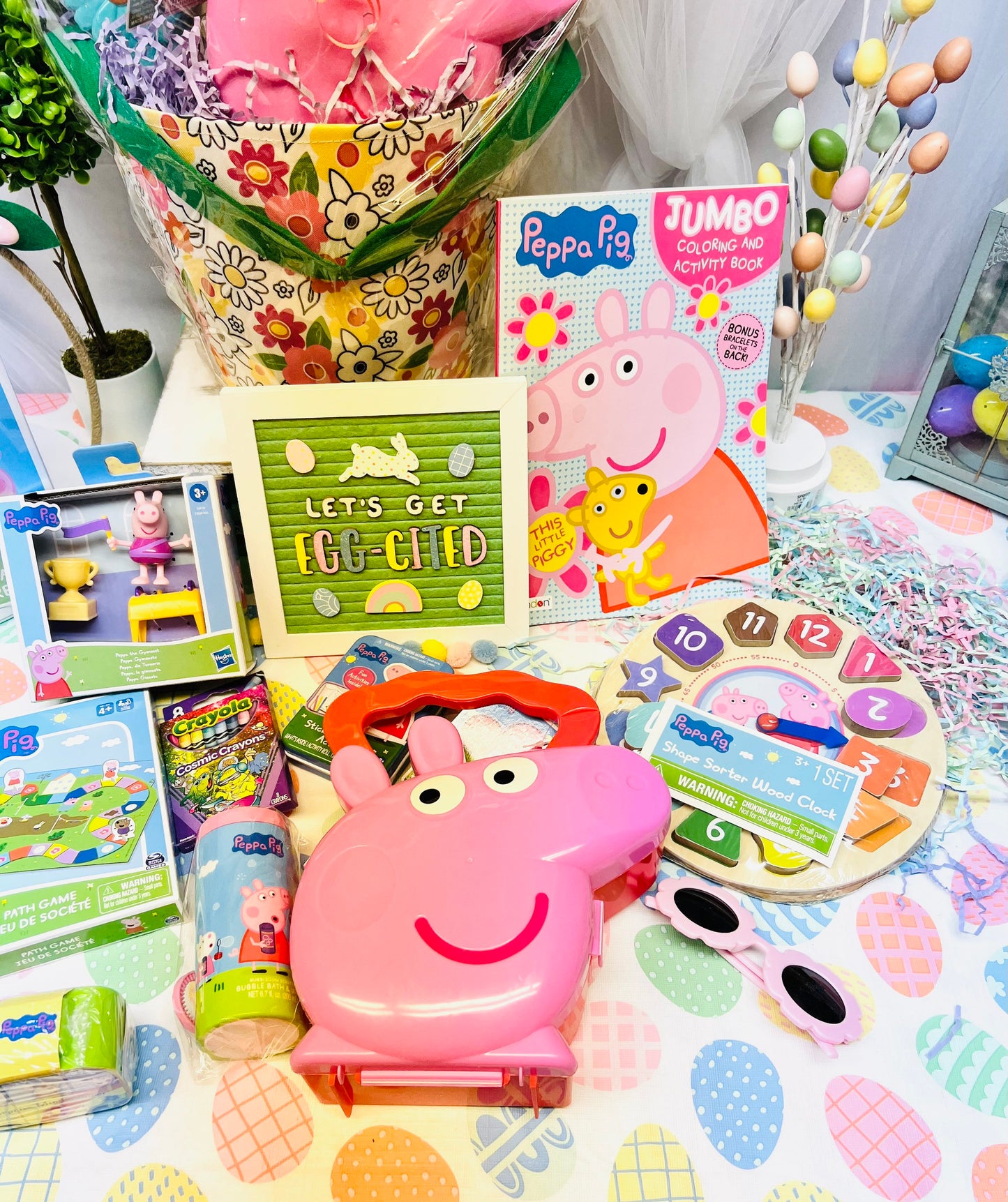 11 piece pre-filled Peppa Pig, Easter basket. This basket is wrapped in clear, cellophane and topped with a large bow. This basket includes a matching game, chunky wooden clock, puzzle, bubbles, miniature, figurines, playset, activities, coloring book, Peppa Pig travel container and more!