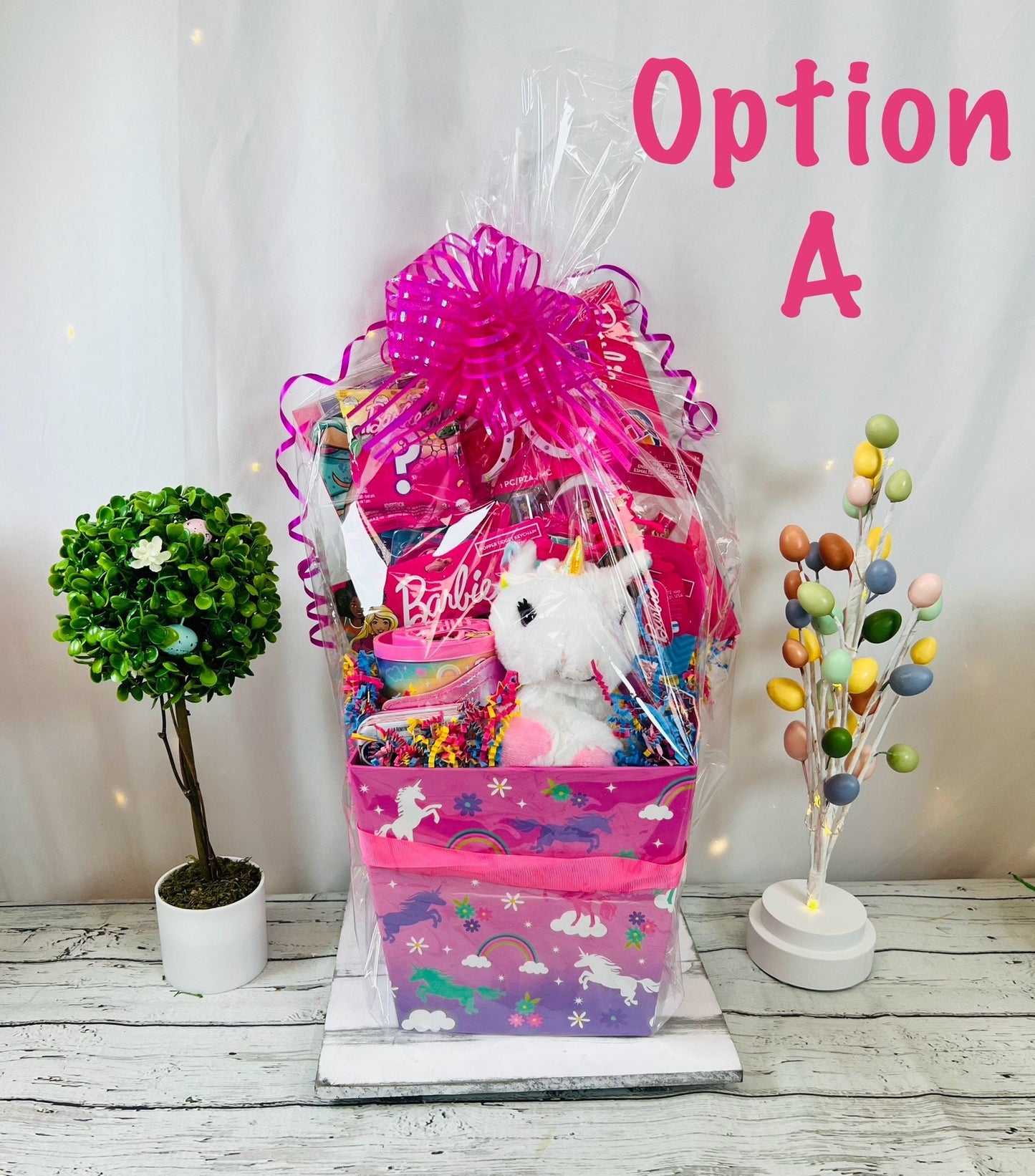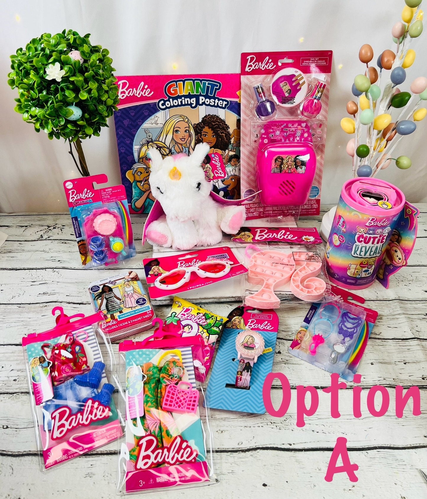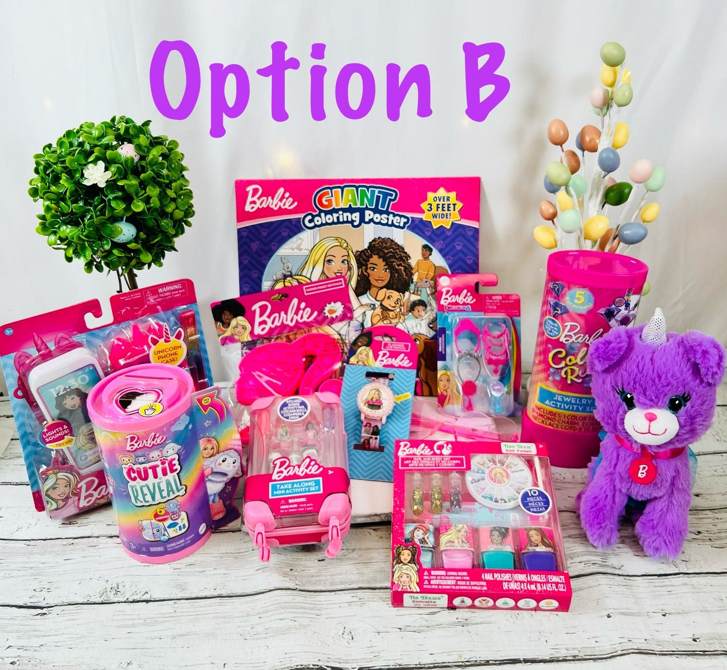 11 Piece Prefilled Fashion Doll themed Easter Basket. Choose your option- Option A or Option B. Each basket is wrapped in clear cellophane and topped with a large bow. Included in the baskets: