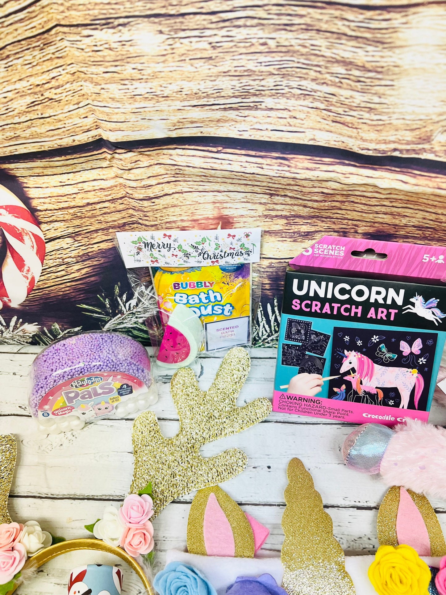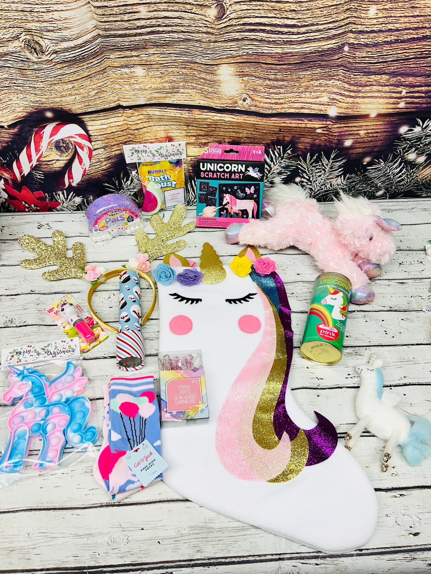 Don’t know what to get for your little unicorn lover for the holidays? This listing is perfect for you! This pre-filled unicorn stocking comes with 12 unicorn themed goodies.