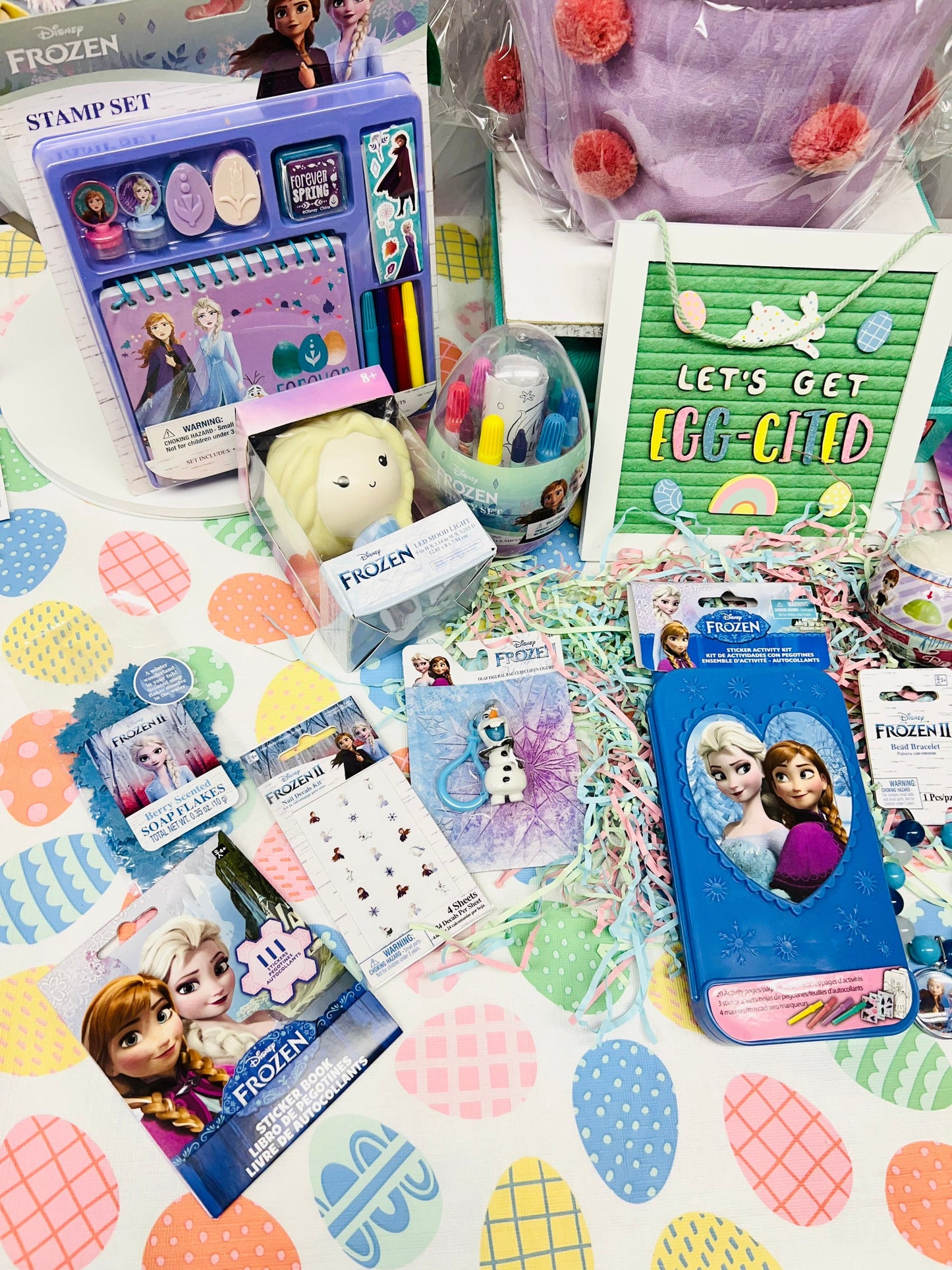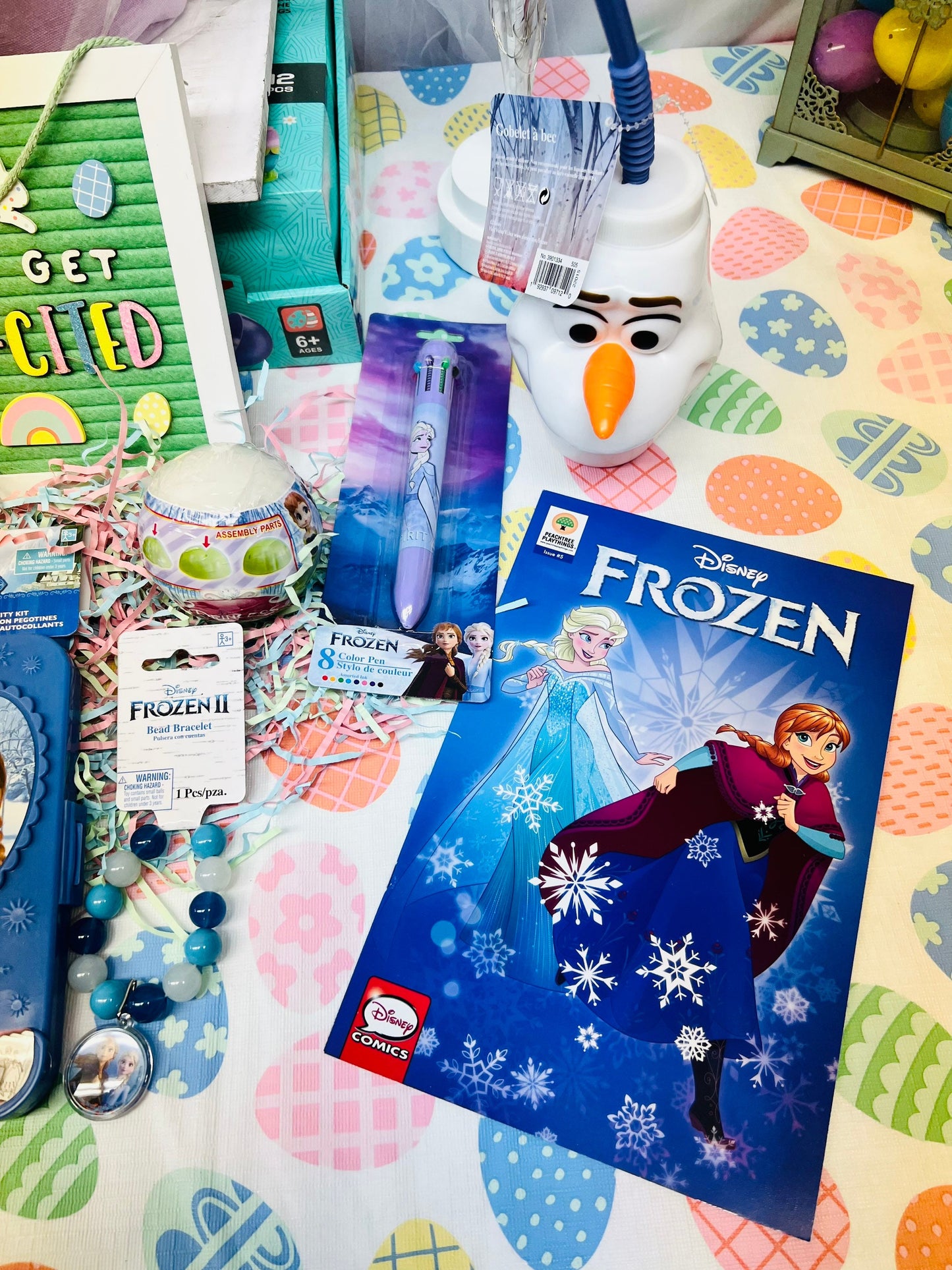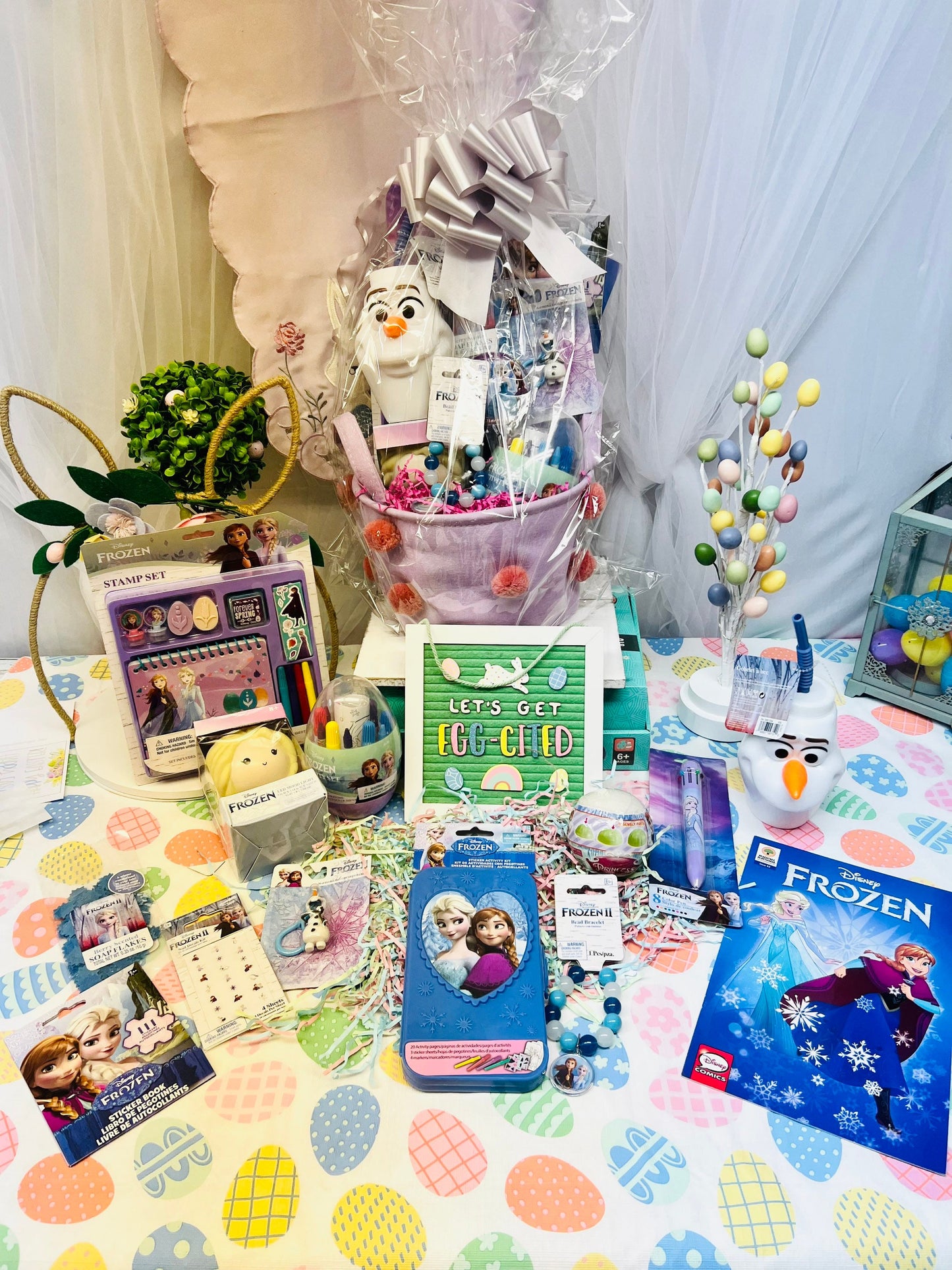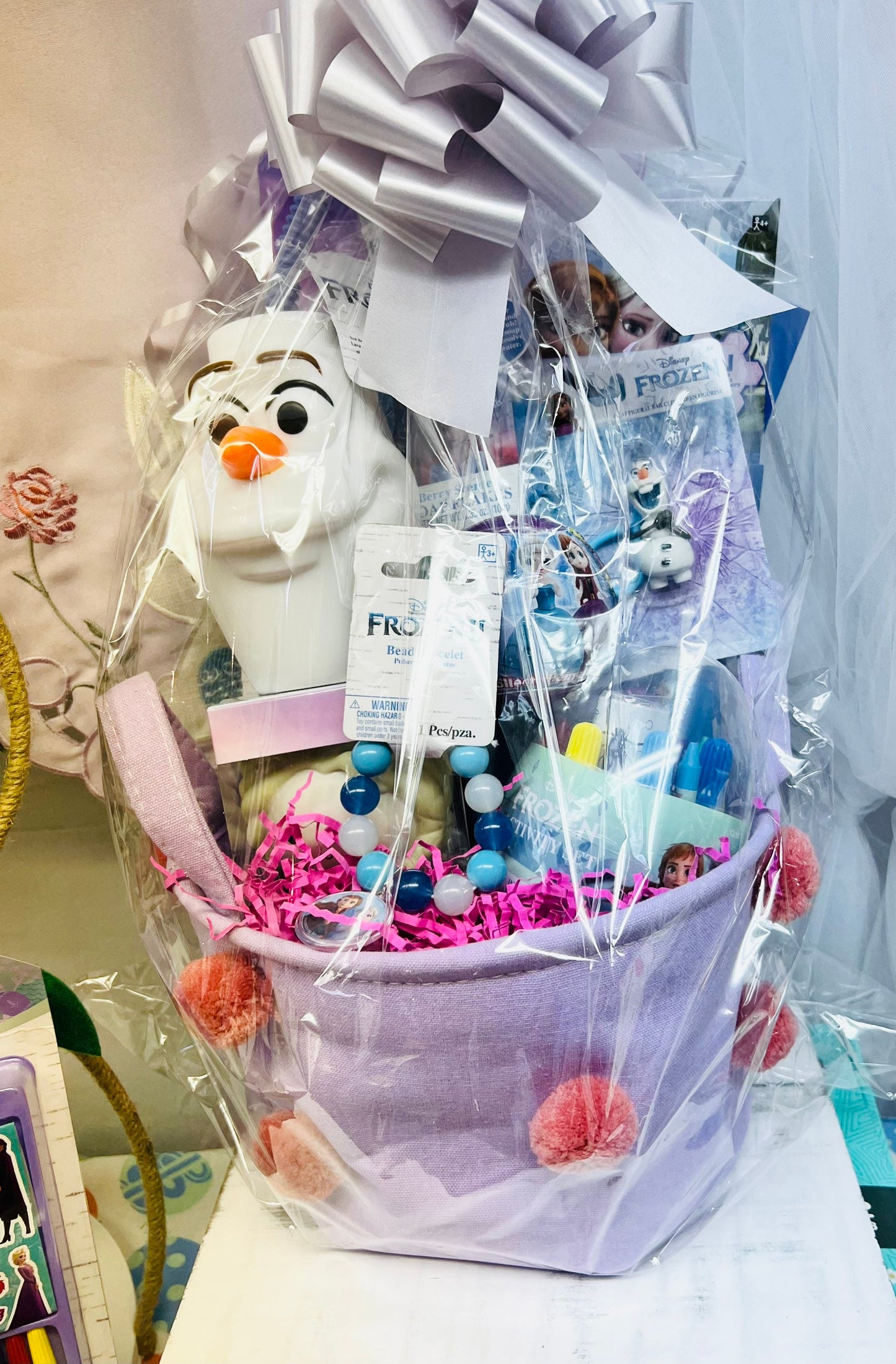 13 piece pre-filled Disney, frozen themed basket. This basket is wrapped in clear cellophane and talked with a large bow. This basket includes items like a figurine, mood, light, activities, magazine, bracelet, Olaf, drinking cup with straw, stickers, and so much more!