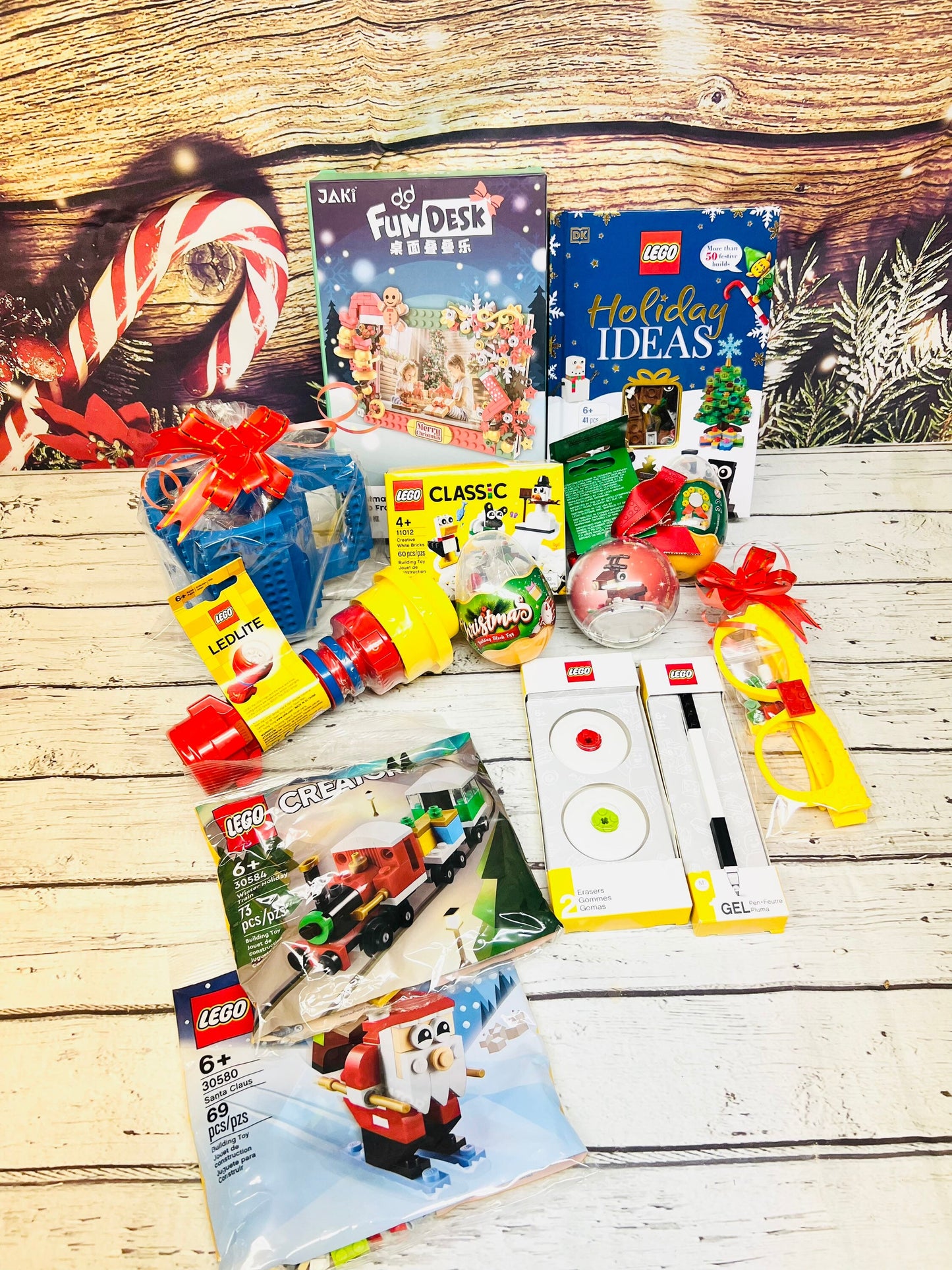 Calling all LEGO lovers! This 14 piece gift basket has everything your little builder could want for Christmas. This Christmas themed basket includes the following: