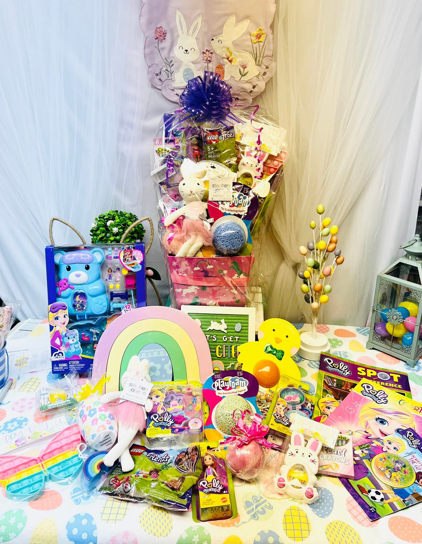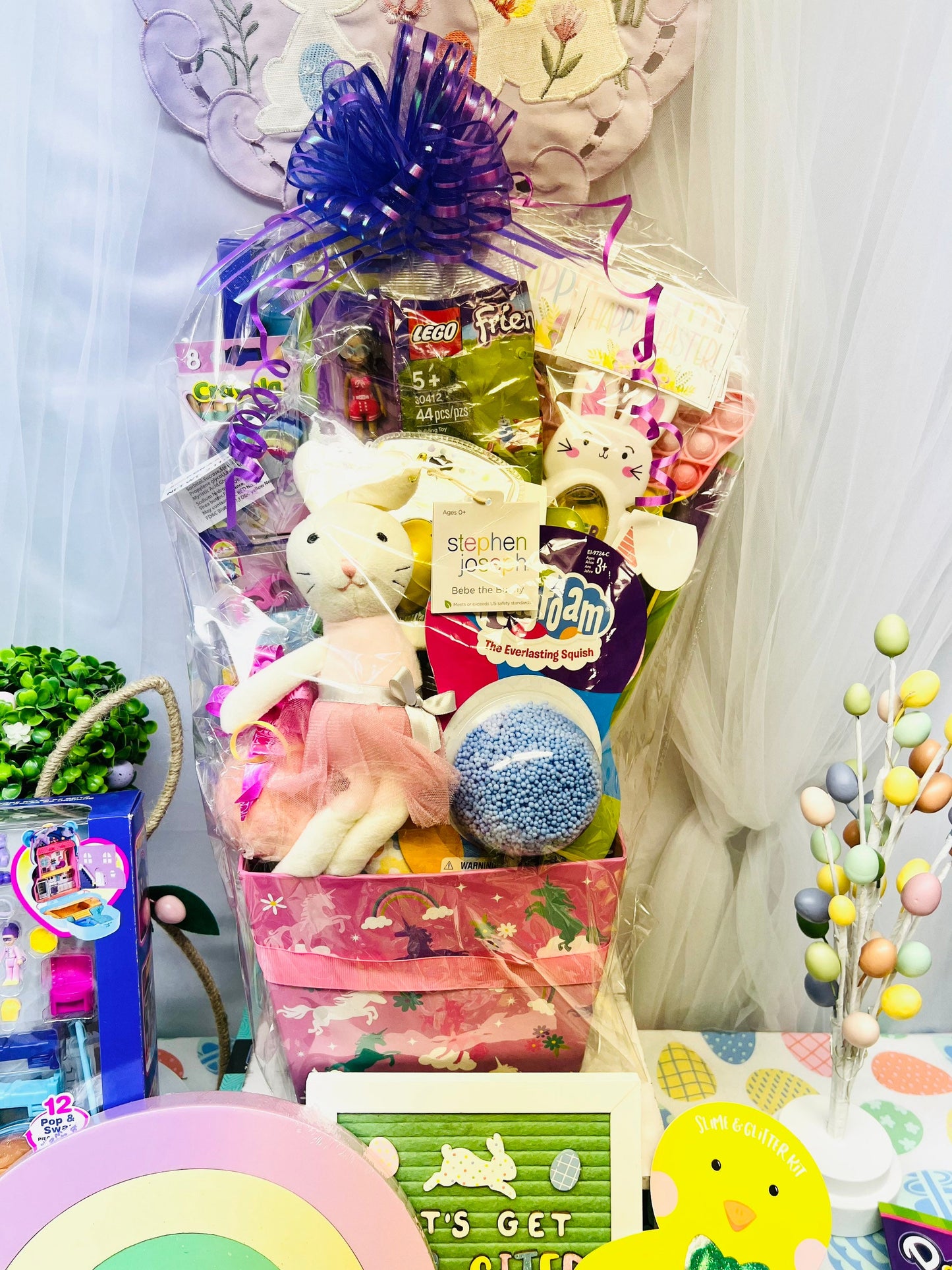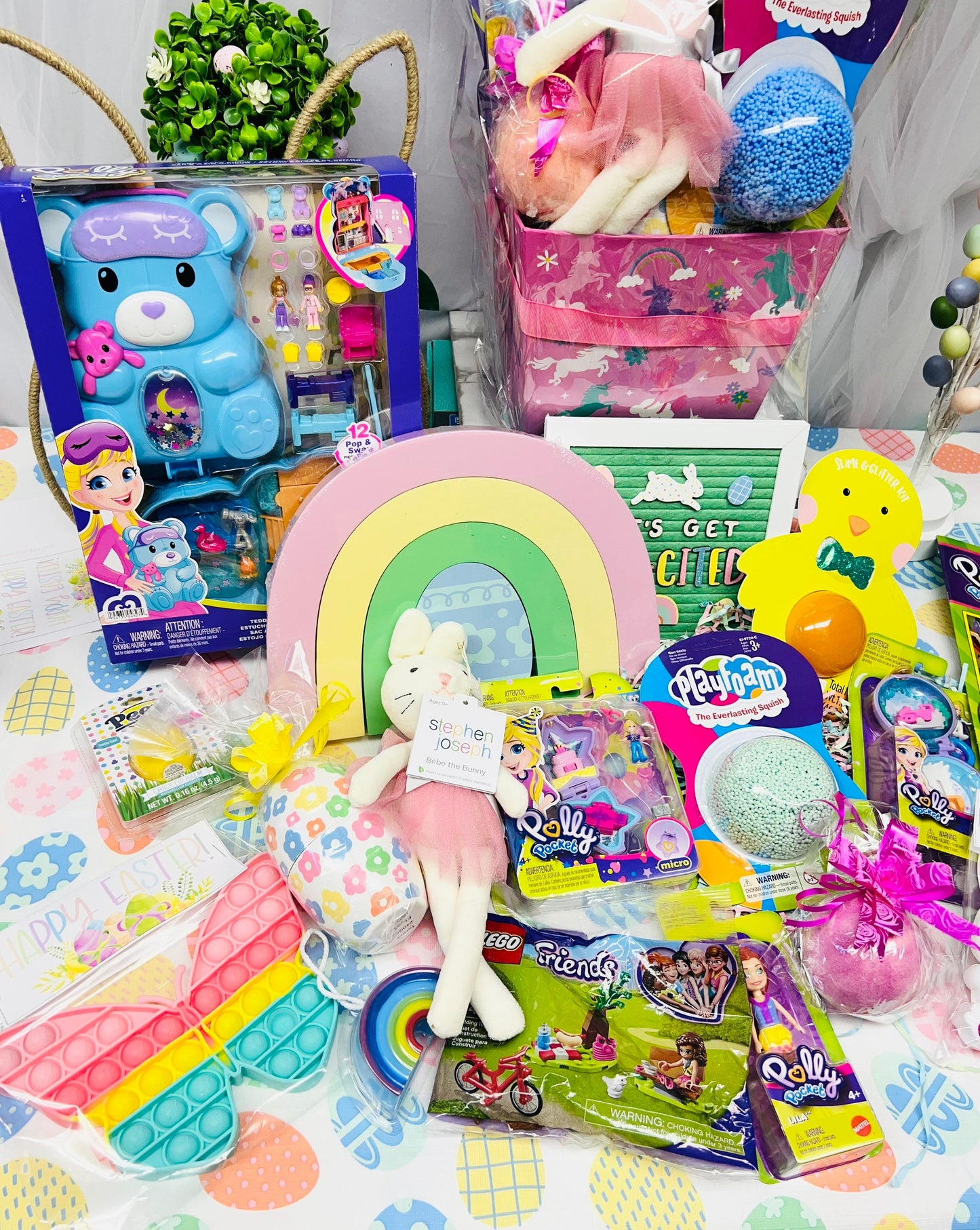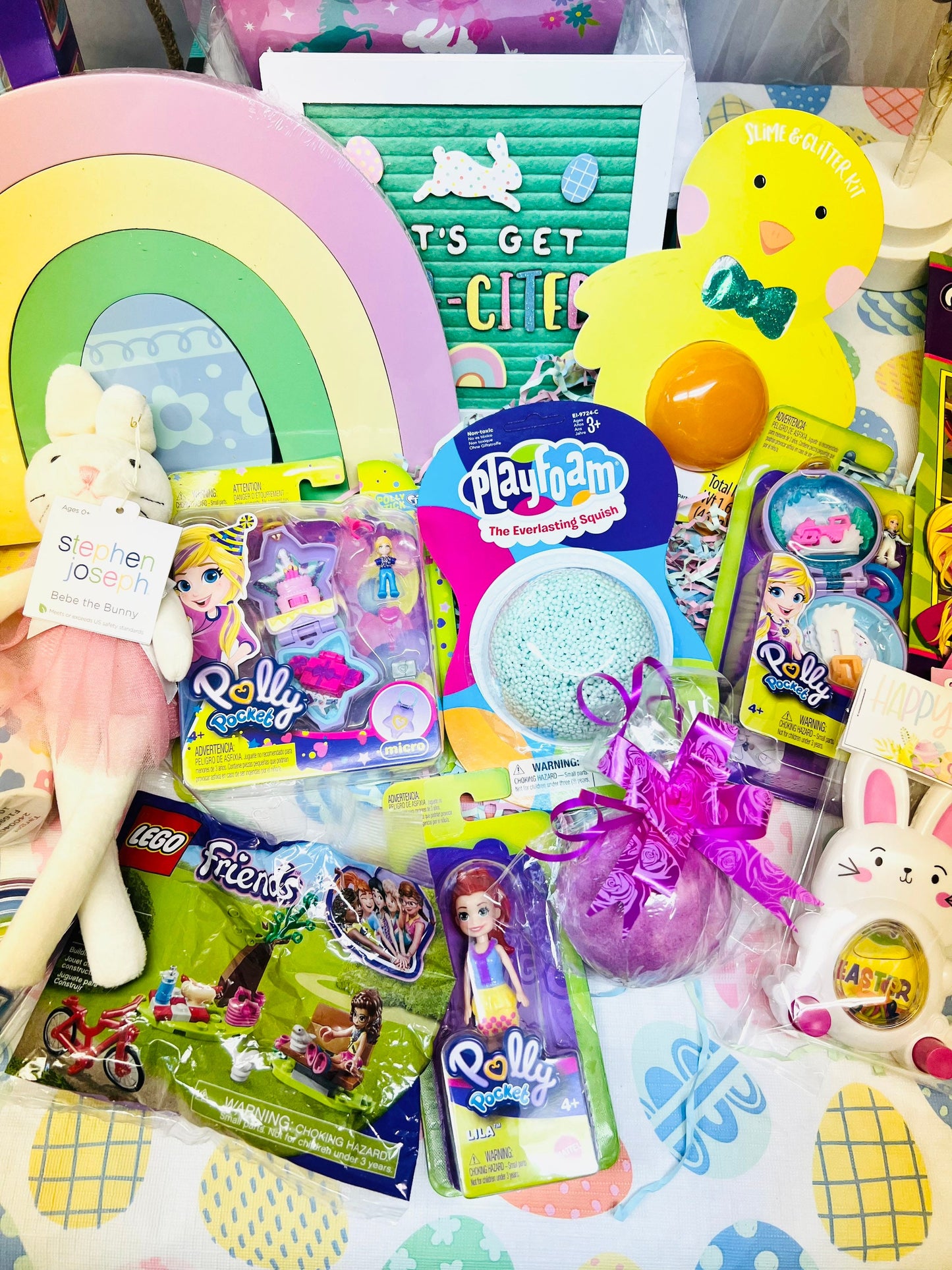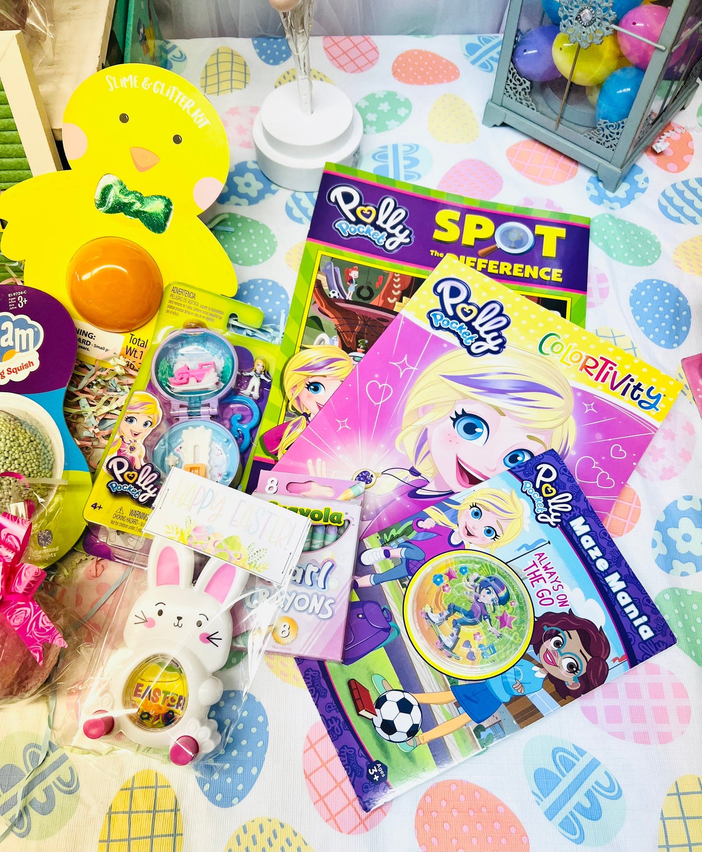 18 piece pre-filled Easter basket, Polly pocket themed. This basket is wrapped in clear cellophane and topped with a large bow. This basket includes a Polly pocket bear playset, wooden rainbow nesting toy, stuffed Easter bunny in a tutu, miniature poly doll, micro poly, playset, pop it fidget toy, Scented bath fizzie, slime, coloring book, Polly pets playset, Easter bunny water game, Lego friends, and so much more!