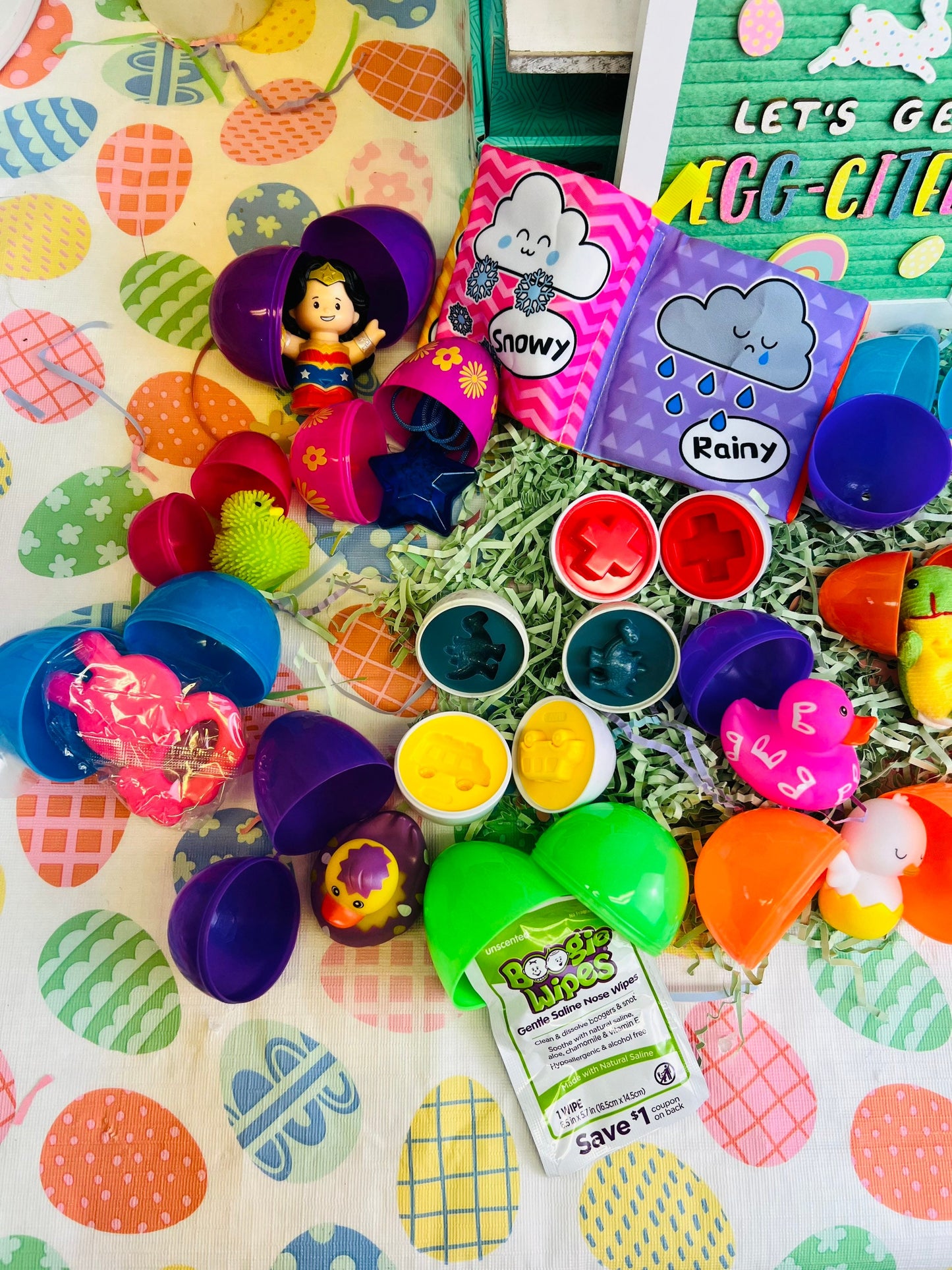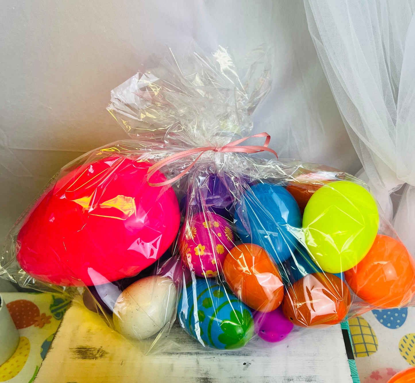 20 piece prefilled easter eggs for toddlers or babies 6 mos+. These eggs are wrapped in clear cellophane. Please note that eggs may pop open during transit.
