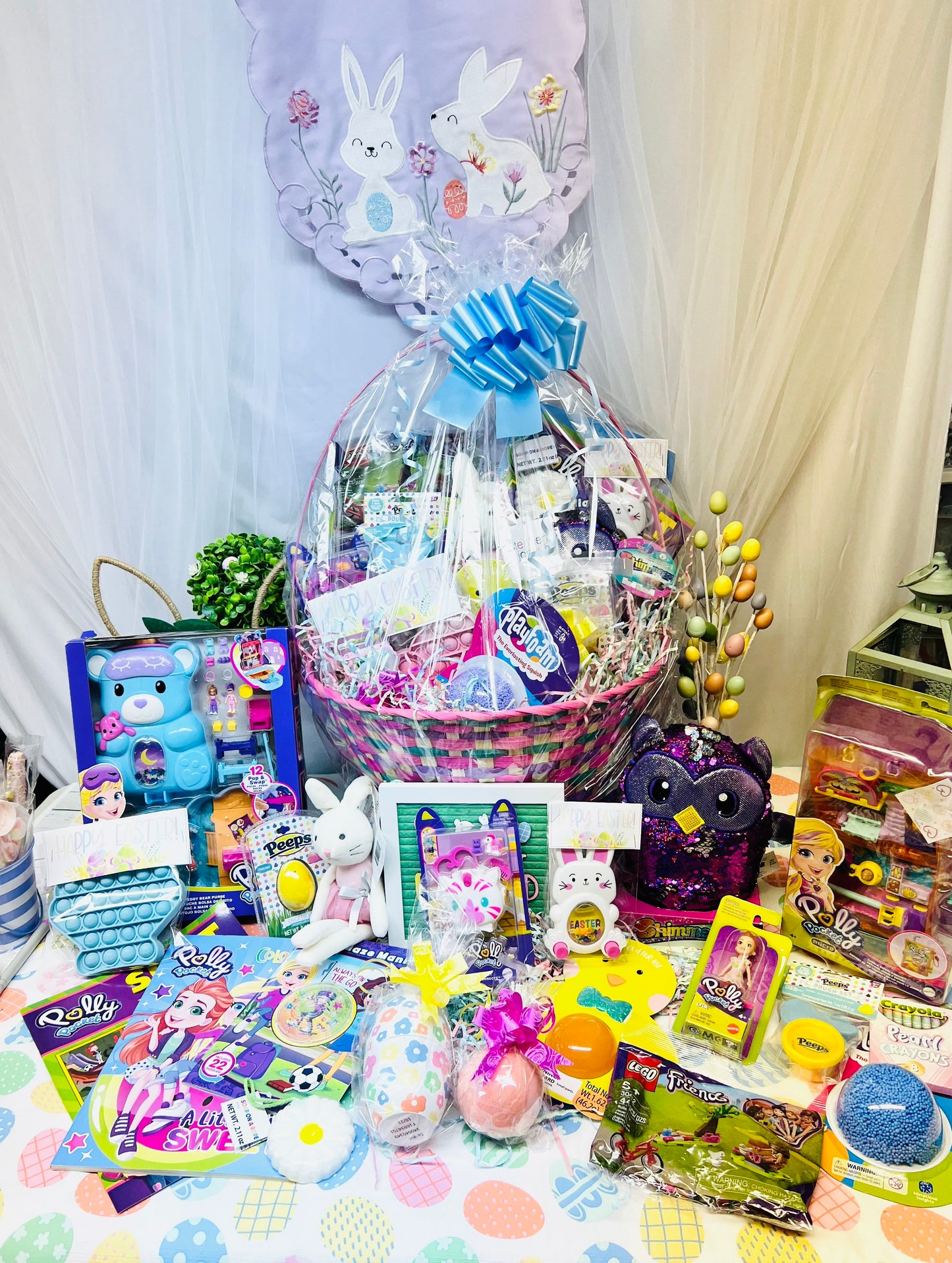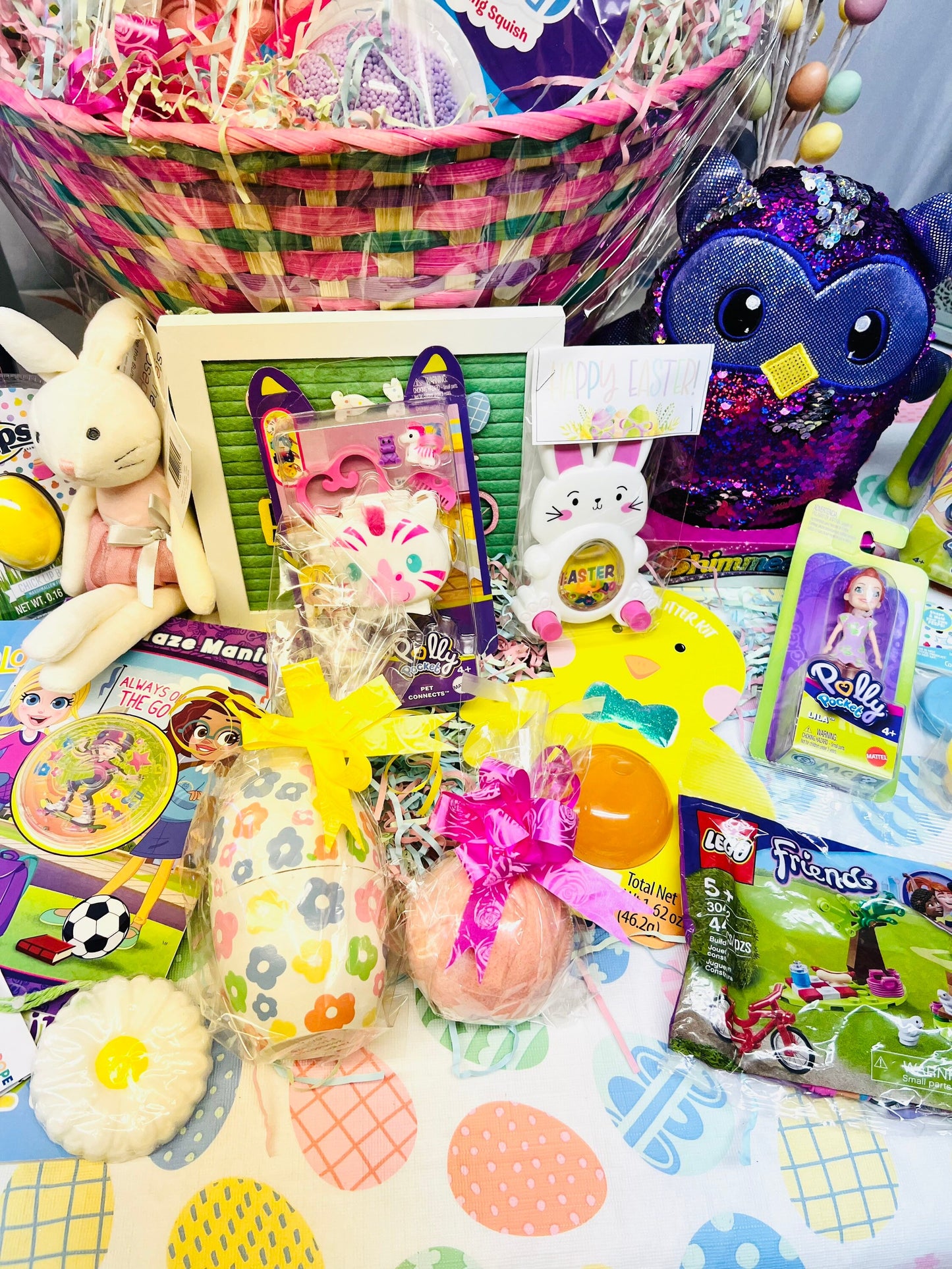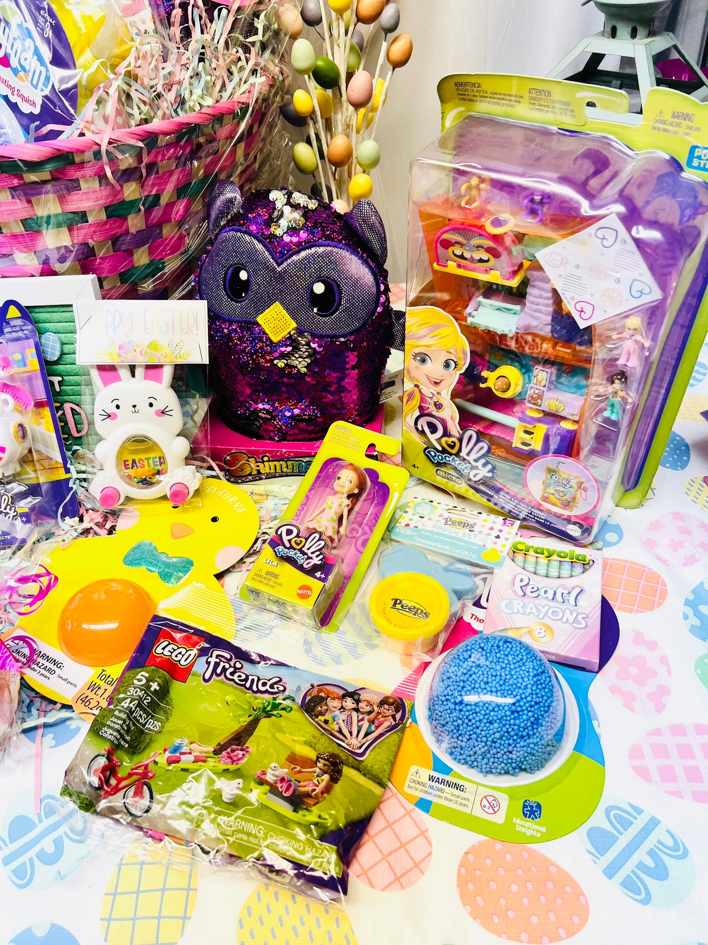 20 piece Polly pocket pre-filled Easter basket. This basket is wrapped in clear, cellophane and topped with a large bell. This basket includes a large sequined Shimrez doll, Easter themed nesting egg, pop it fidget toy, coloring book with crayons, Easter bunny water game, miniature Lego set, Polly pocket play sets, Polly pocket figurines, and adorable Easter bunny with a tutu, and so much more!