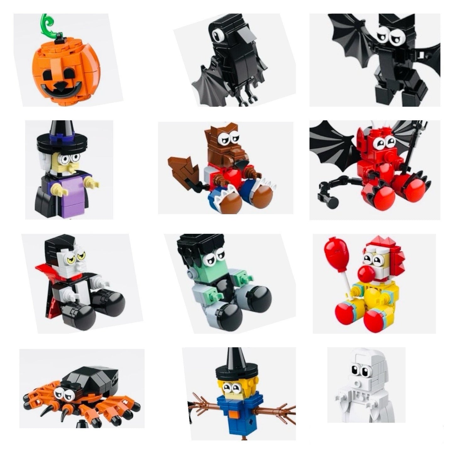 Create your own spooktacular brick character. 12 different characters, each individually wrapped with a cardstock sign in a cellophane bag, topped off with a halloween bag topper. Each kit comes with an instruction sheet to create your character! These are not lego brand, but they are compatible with leading brands!
