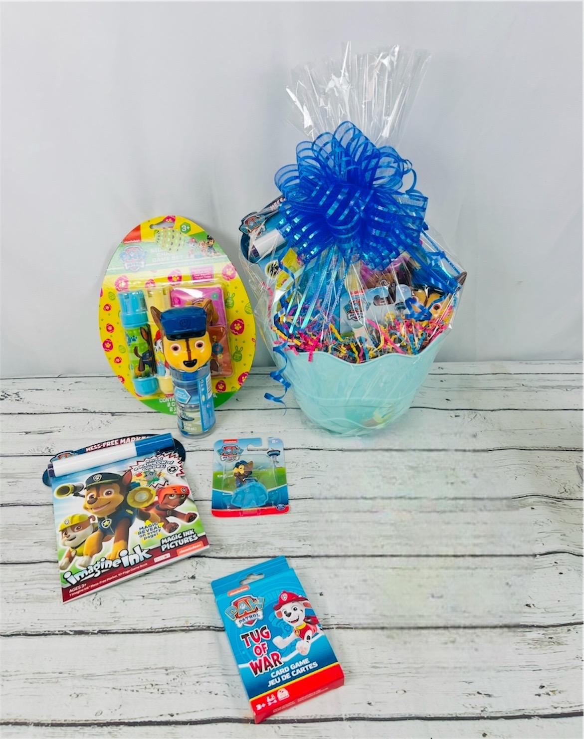 Want to give something simple but fun to a Paw Patrol lover in your life? This mini basket is perfect! Complete with 6 ready to play items, this basket is wrapped in clear cellophane and topped with. Large bow.