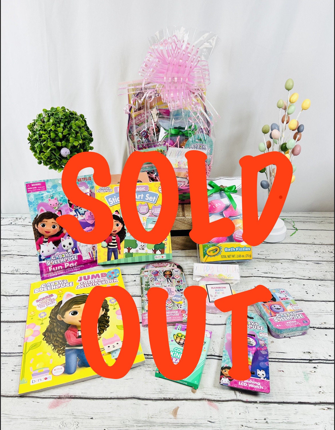 7piece pre filled Gabby's Dollhouse themed Easter Gift Basket. This mini gift basket is wrapped in clear cellophane and topped with a large bow. This basket includes: