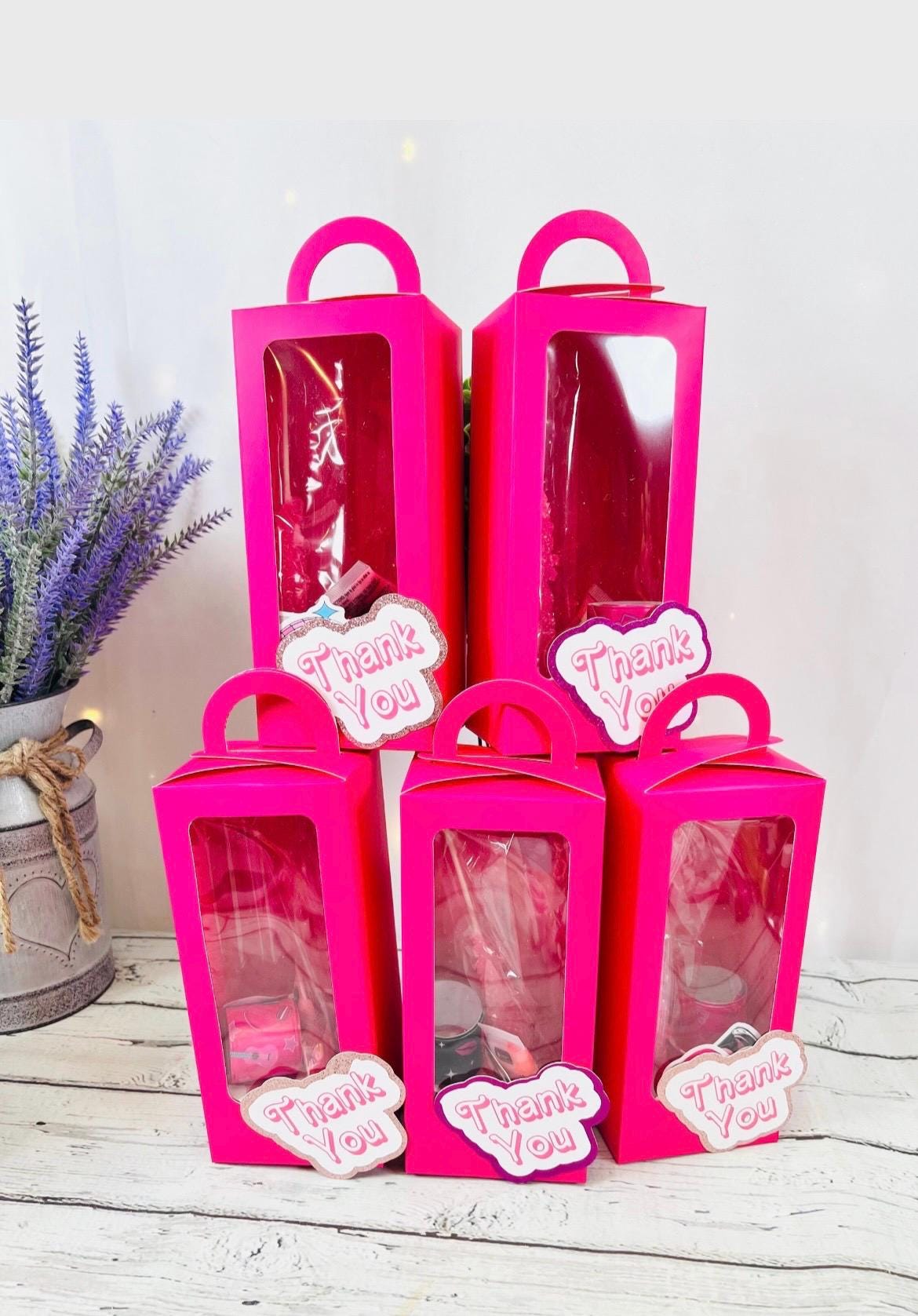 The contents are placed in a preassembled pink window box with lettering saying "Thank You".
