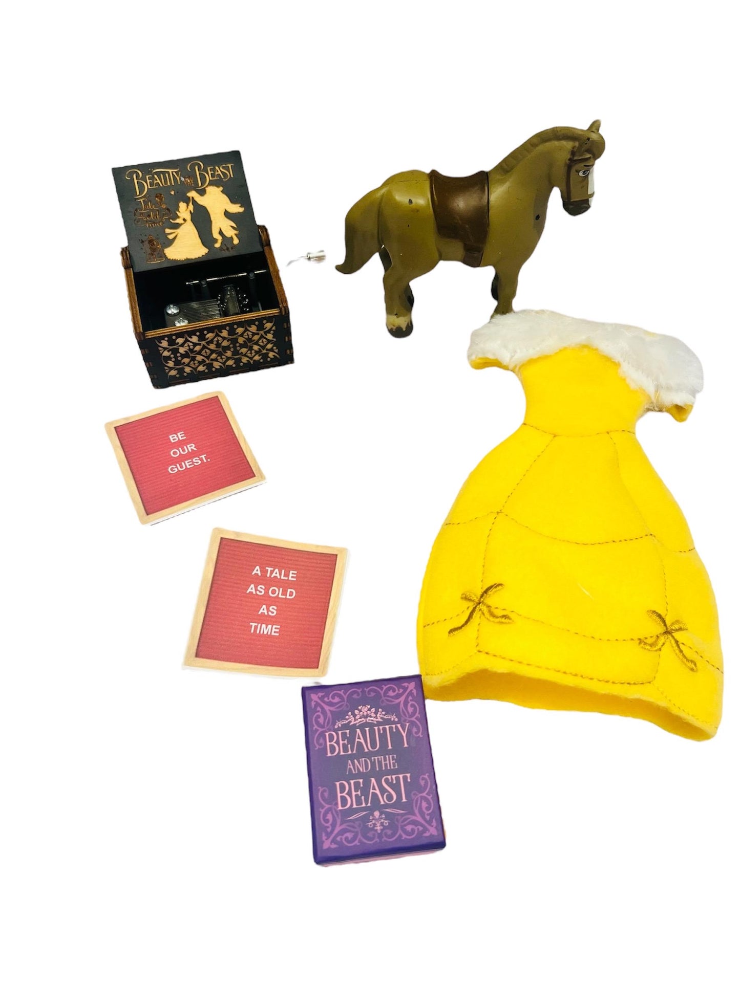 1 miniature wooden music box that plays the "Beauty and the beast" theme song (music box style may vary from that pictured)