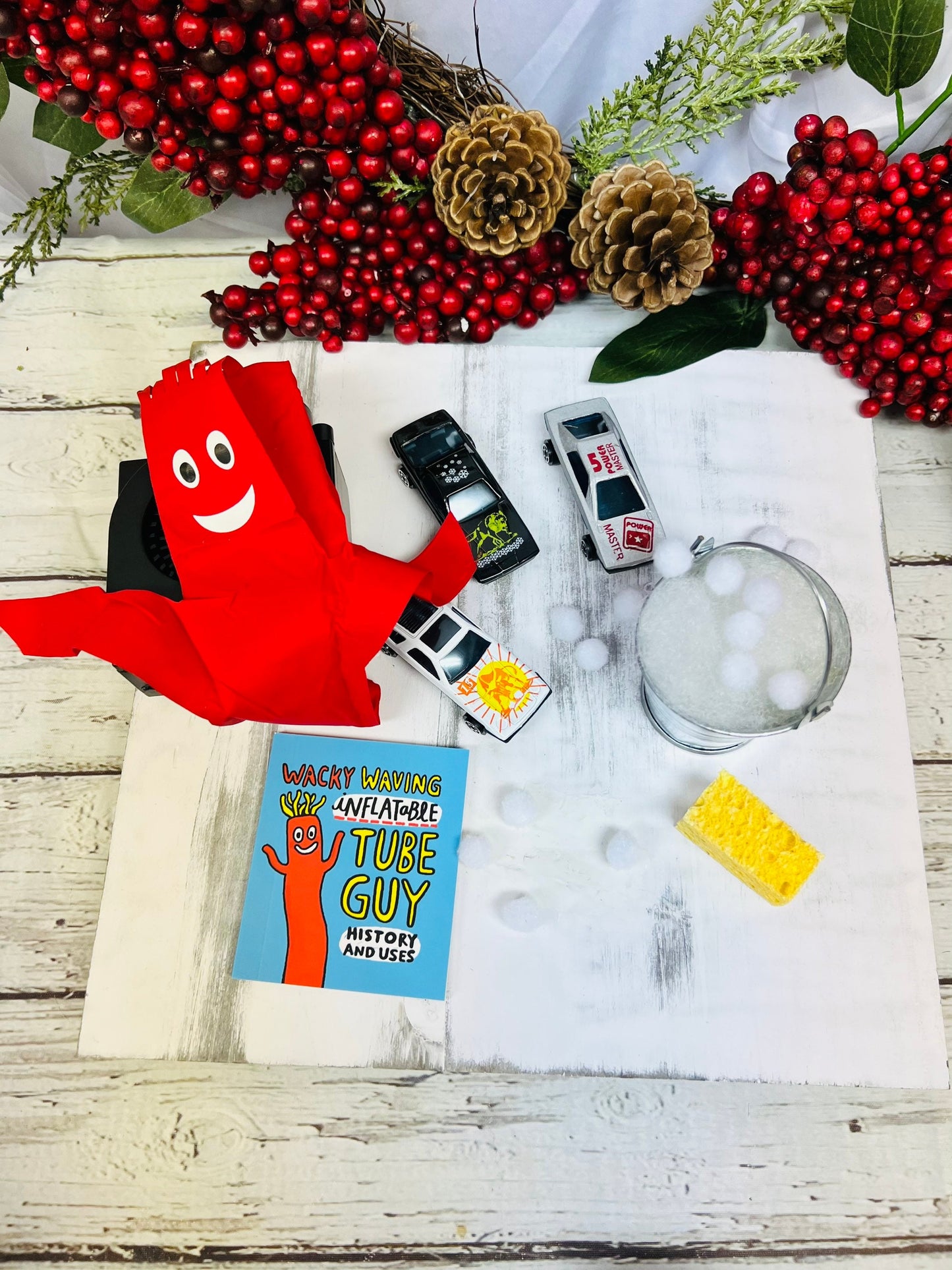 1 Running Press miniature wacky inflatable wavy guy (BATTERIES NOT INCLUDED, NEED 1 9V BATTERY) wavy tube needs room to wave in all directions, or he gets stuck.