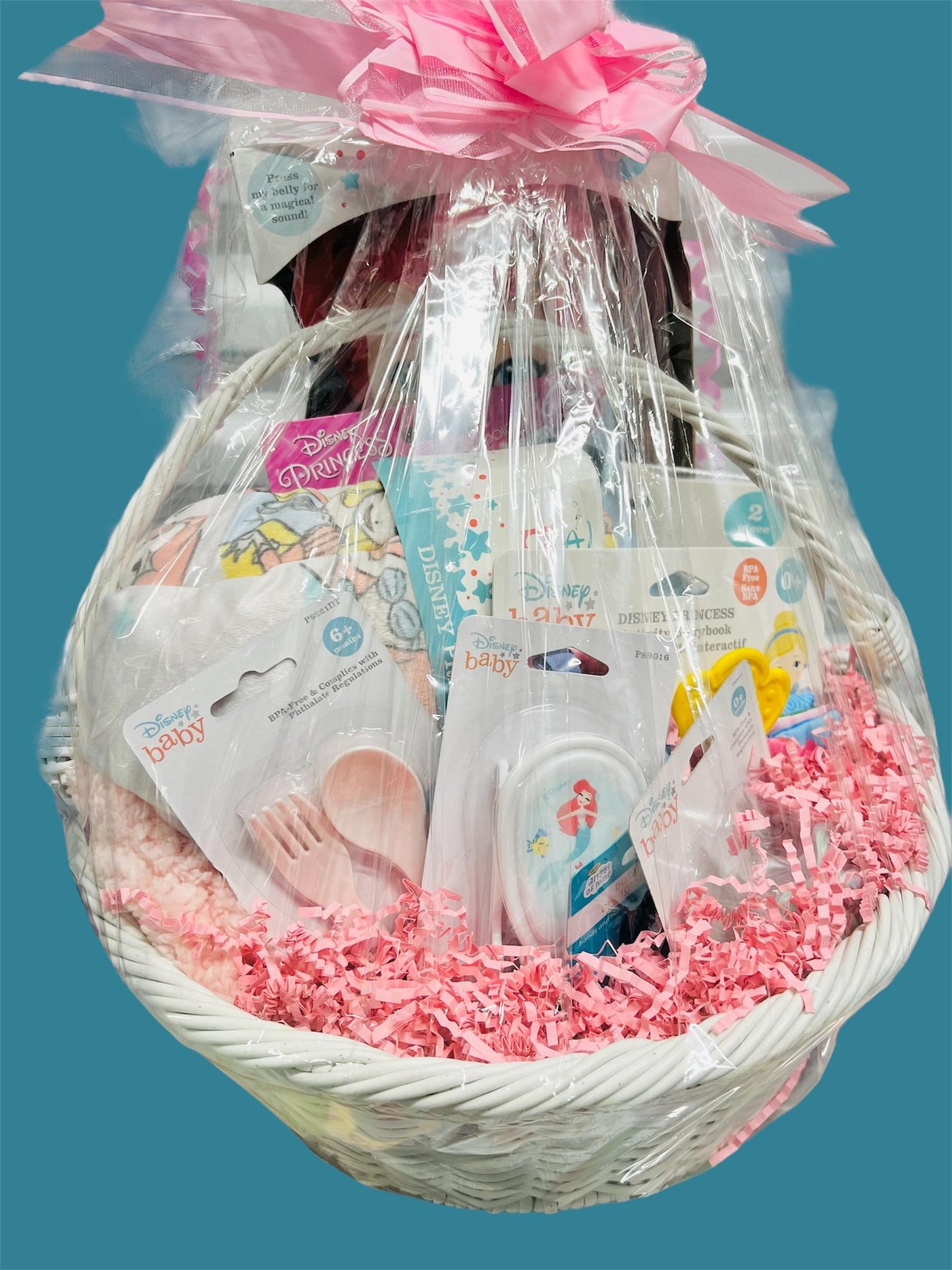 This adorable Disney princess baby gift is sure to make every ooh and aaah! Perfect for Easter, birthdays, baby shower, holidays mix or just because! This adorable gift is wrapped in clear cellophane and topped with a large bow.