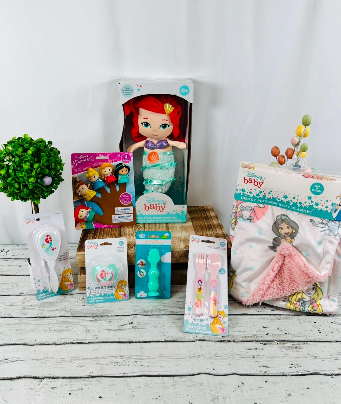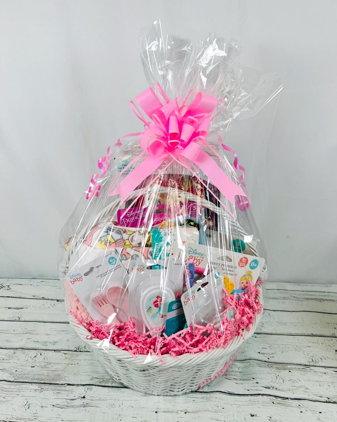 This adorable Disney princess baby gift is sure to make every ooh and aaah! Perfect for Easter, birthdays, baby shower, holidays mix or just because! This adorable gift is wrapped in clear cellophane and topped with a large bow.