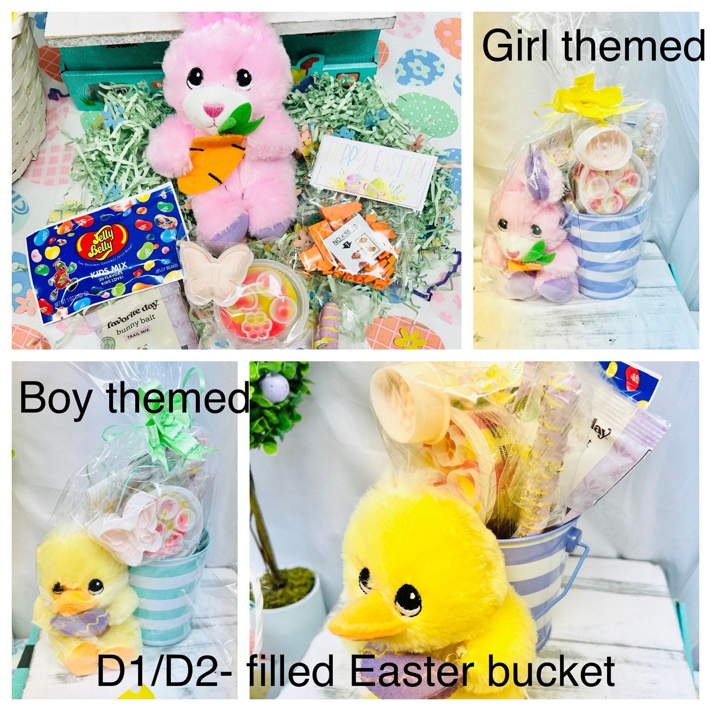 D2-BOYS COLOR filled bucket with treats, playdoh lollipop and Easter stamp, Easter building brick kit (with instructions-non lego), & Easter stuffed character