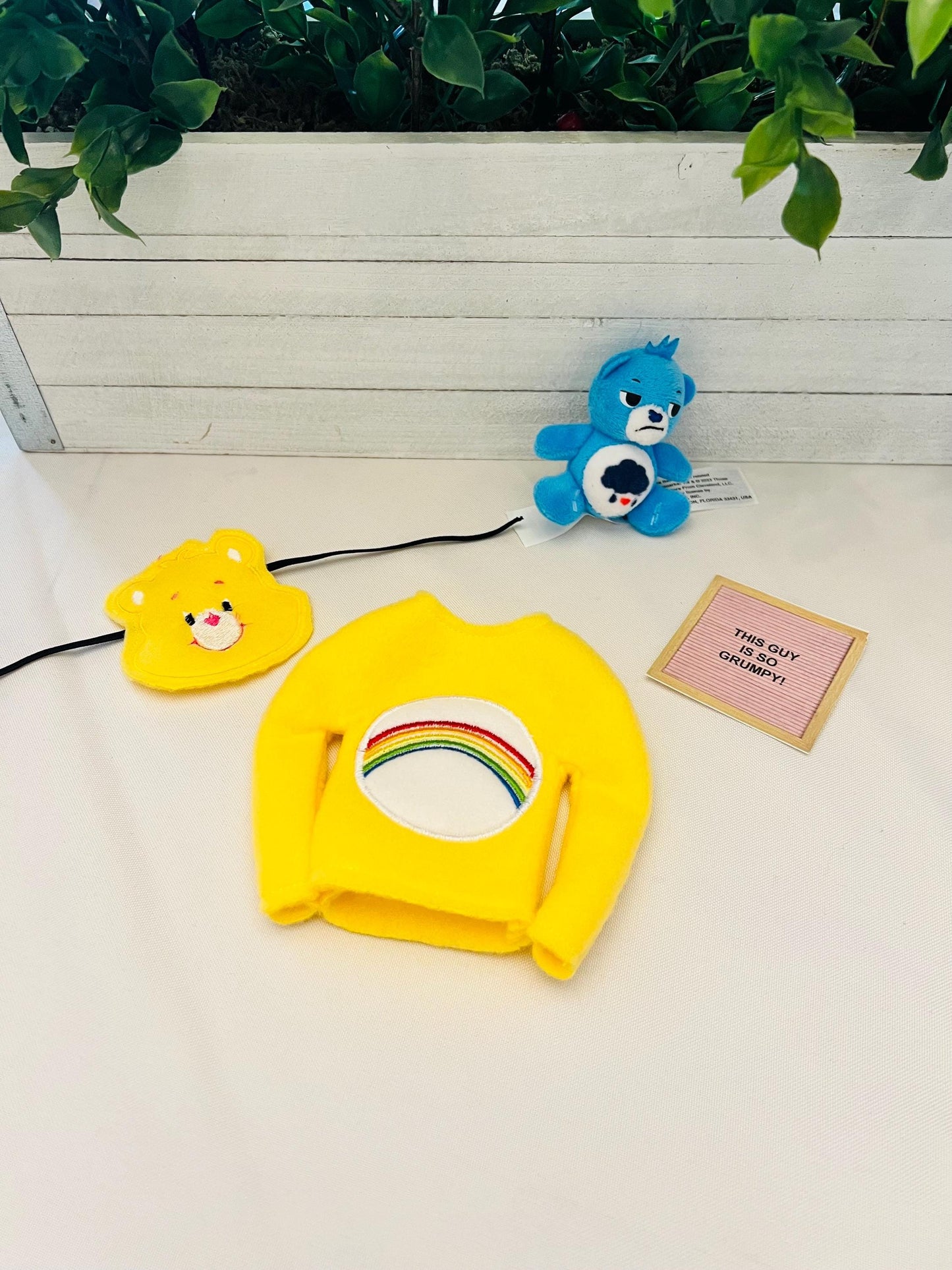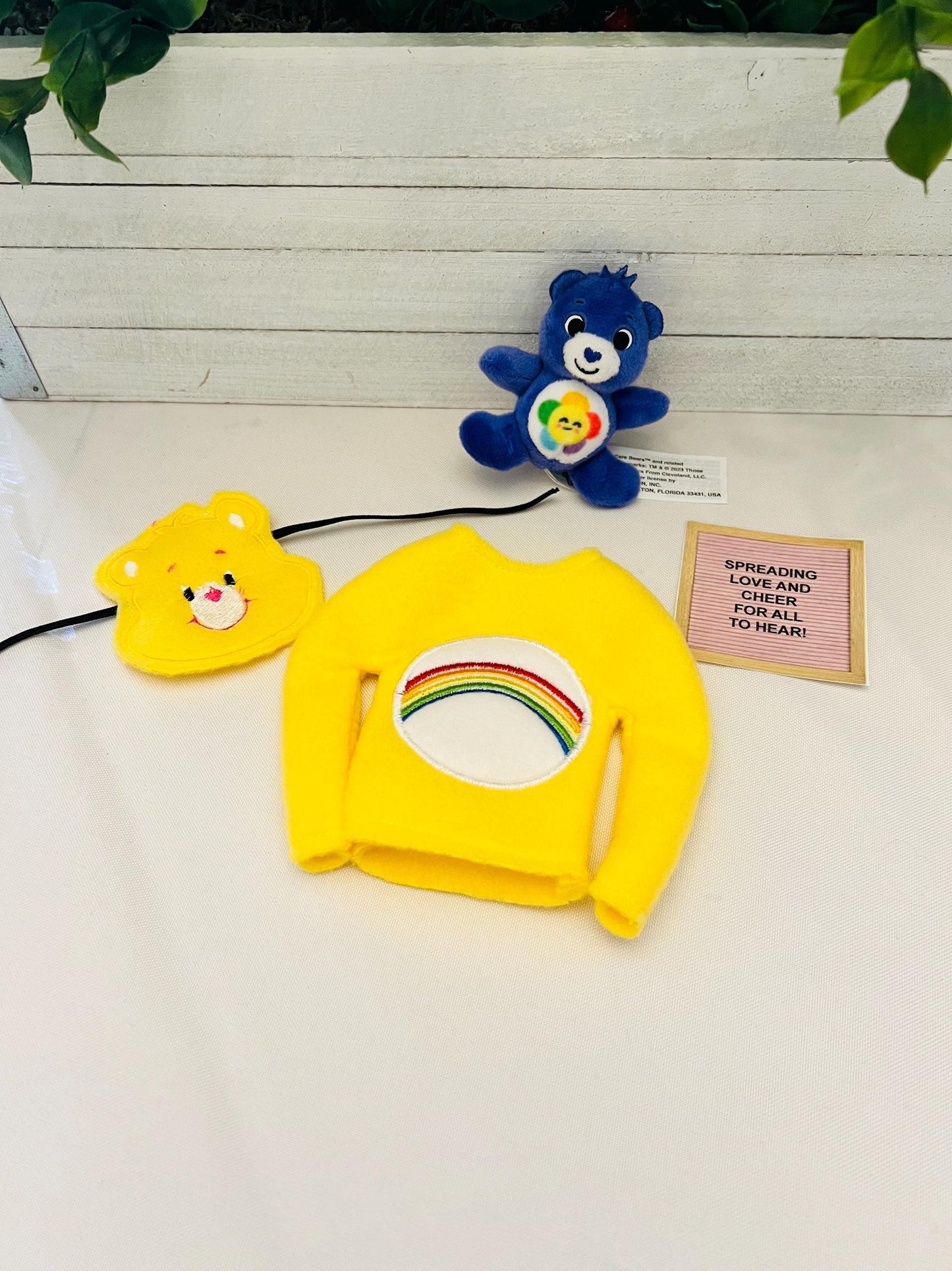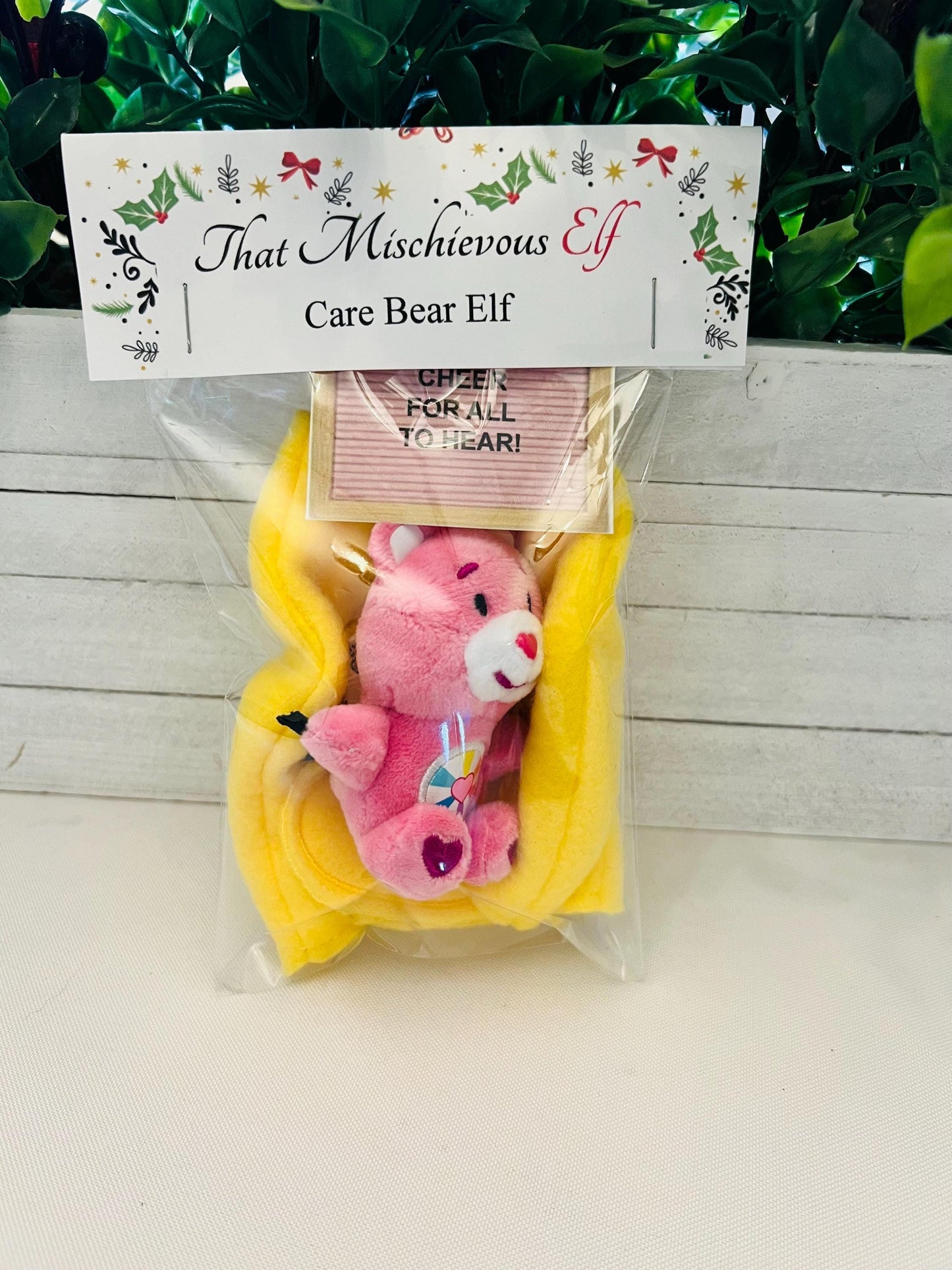 Your elf loves to dress up as a bear! This it includes one rainbow cheer shirt for your elf and mask (tie ends around elfs head), 1 miniature Care Bear (style varies unless you want grumpy bear) and a cardstock sign that reads "Spreading love and cheer for all to hear" Or grumpy bears sign "This guy is so grumpy!"