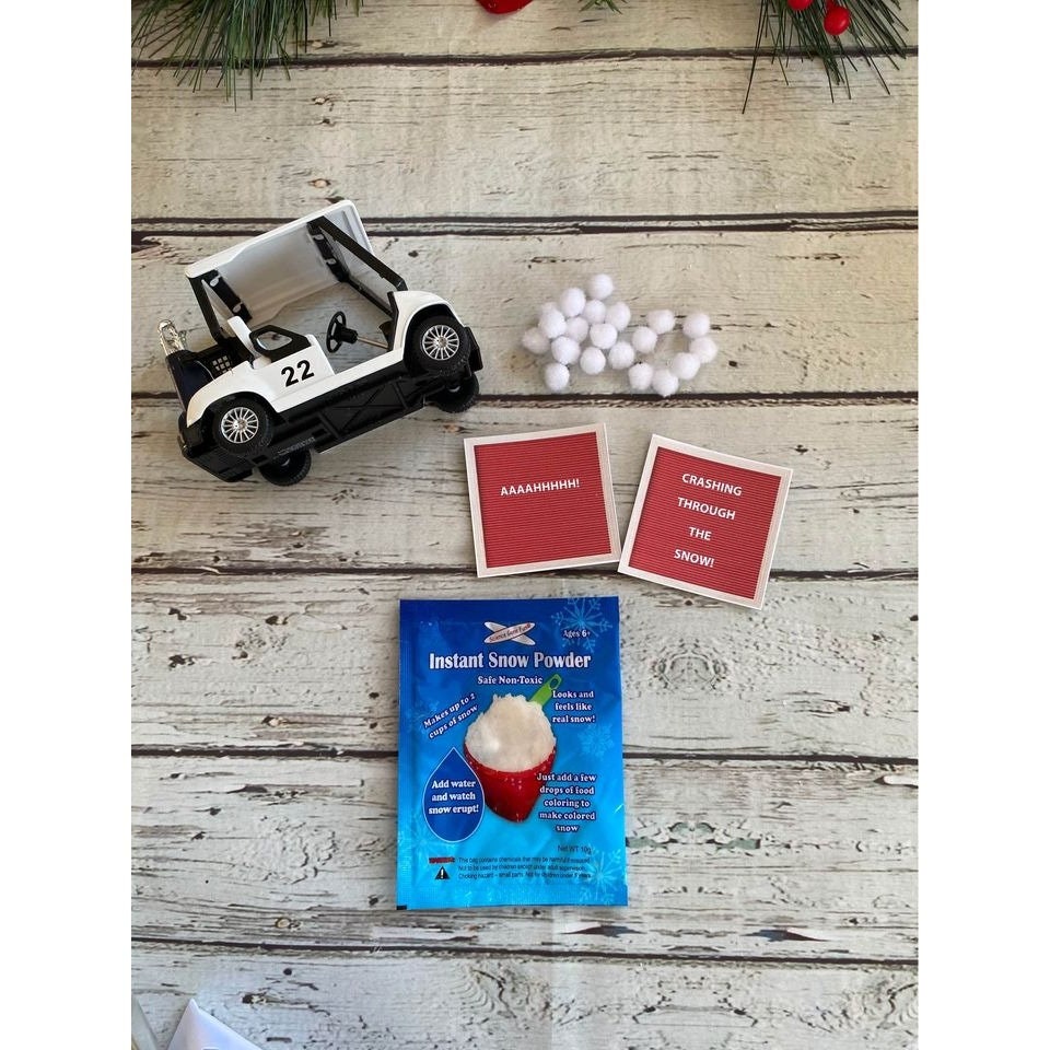 For this kit, put your elf doll on top of the cart so it looks like the cart is out of control and is "Crashing" through the fake snow!