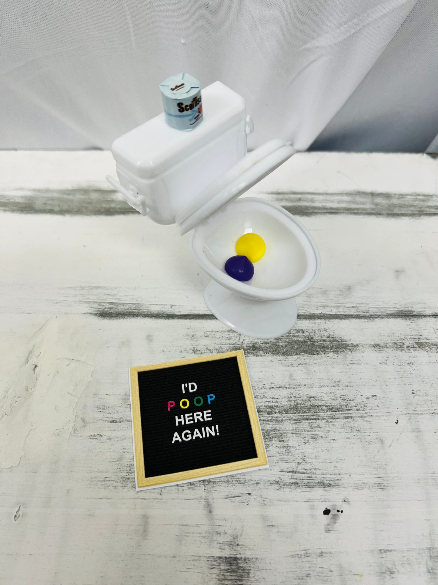 1 plastic toilet with "poopies" (mini resin chocolate chips) and attached toilet paper roll