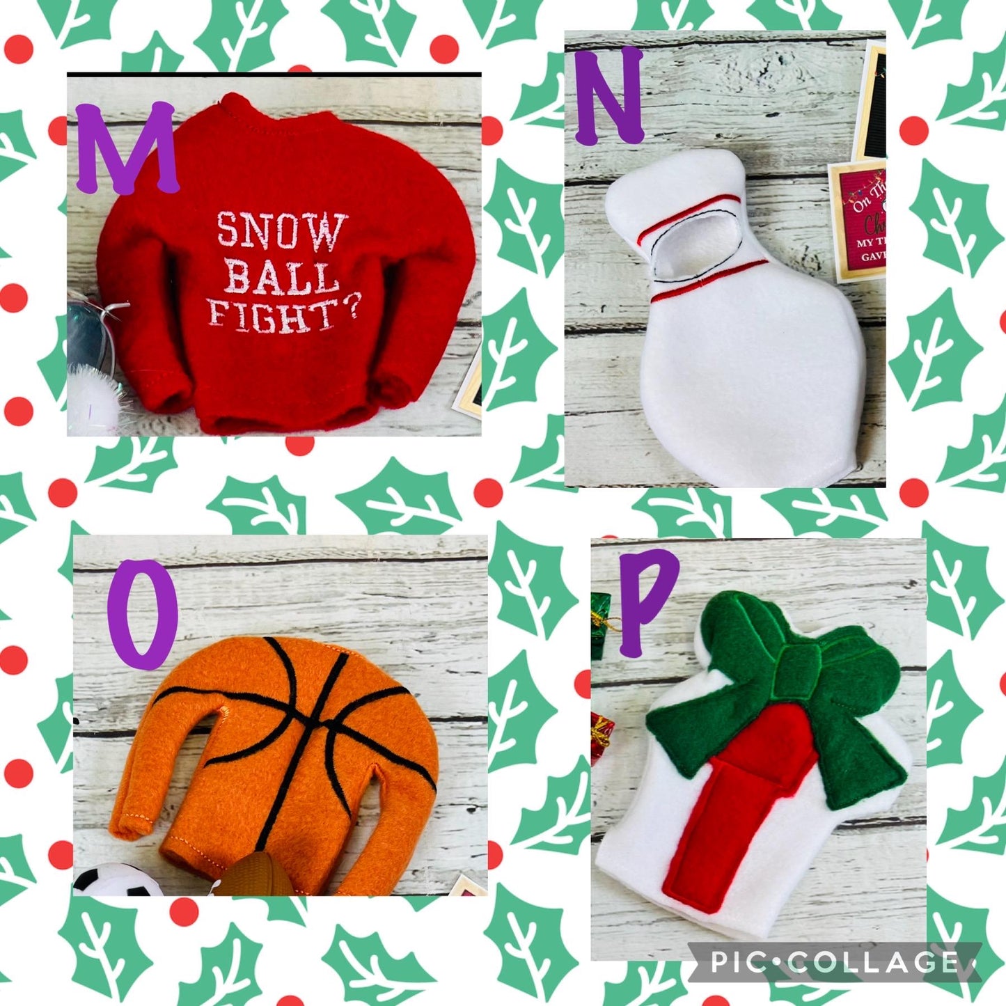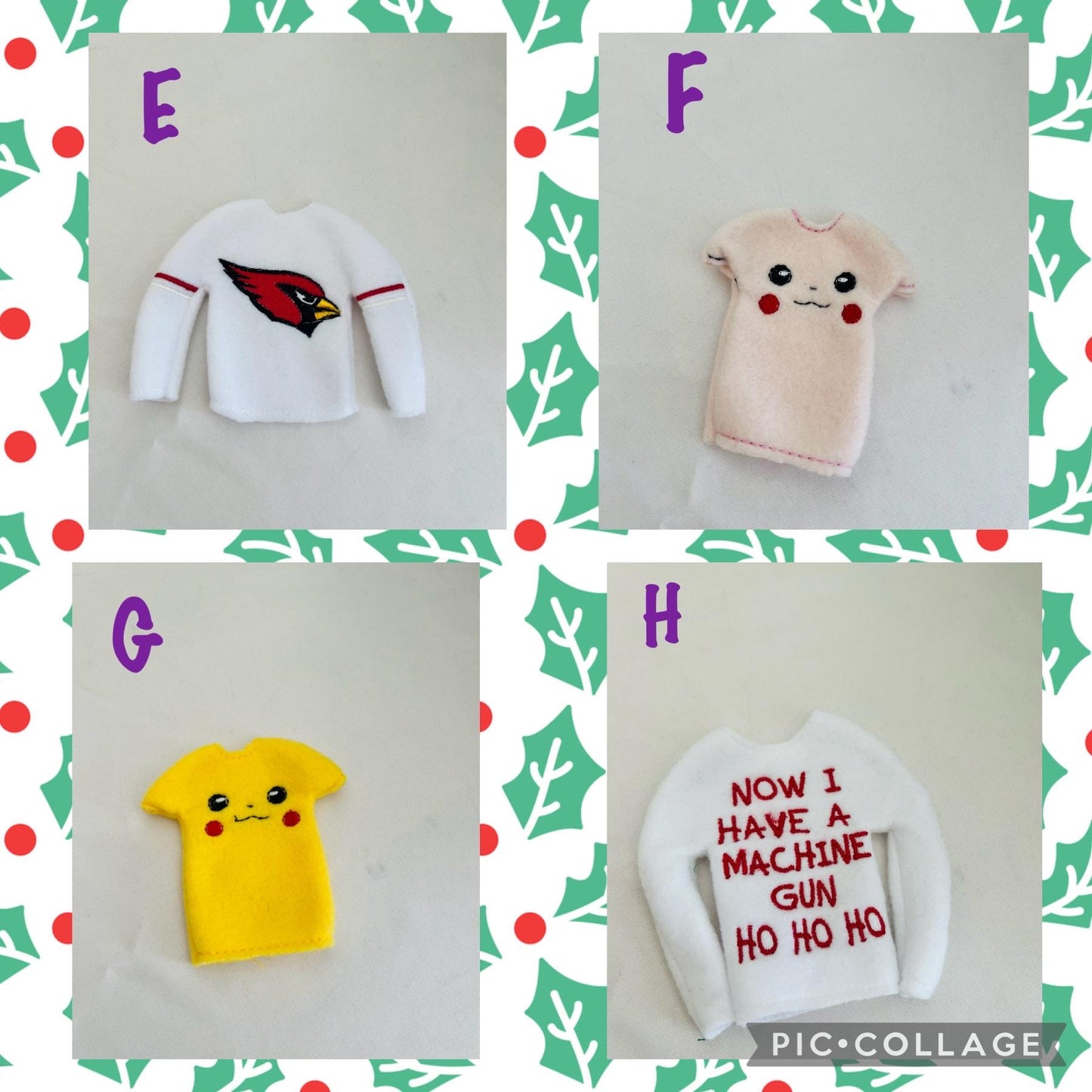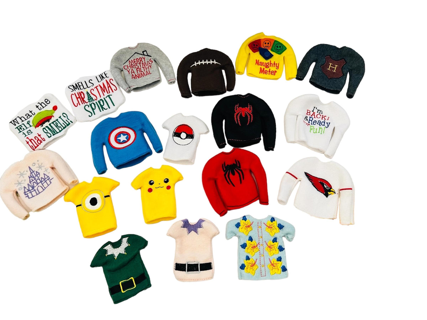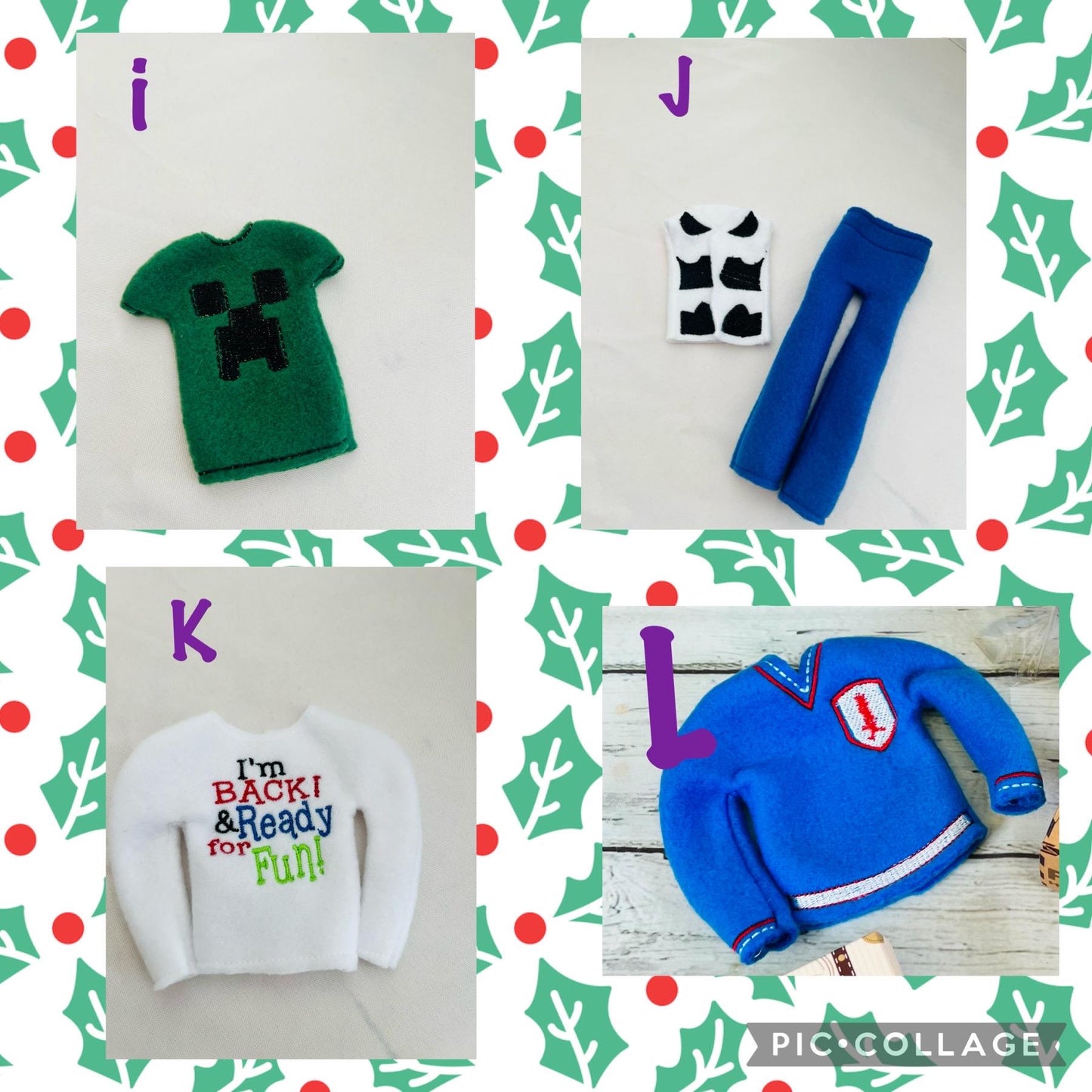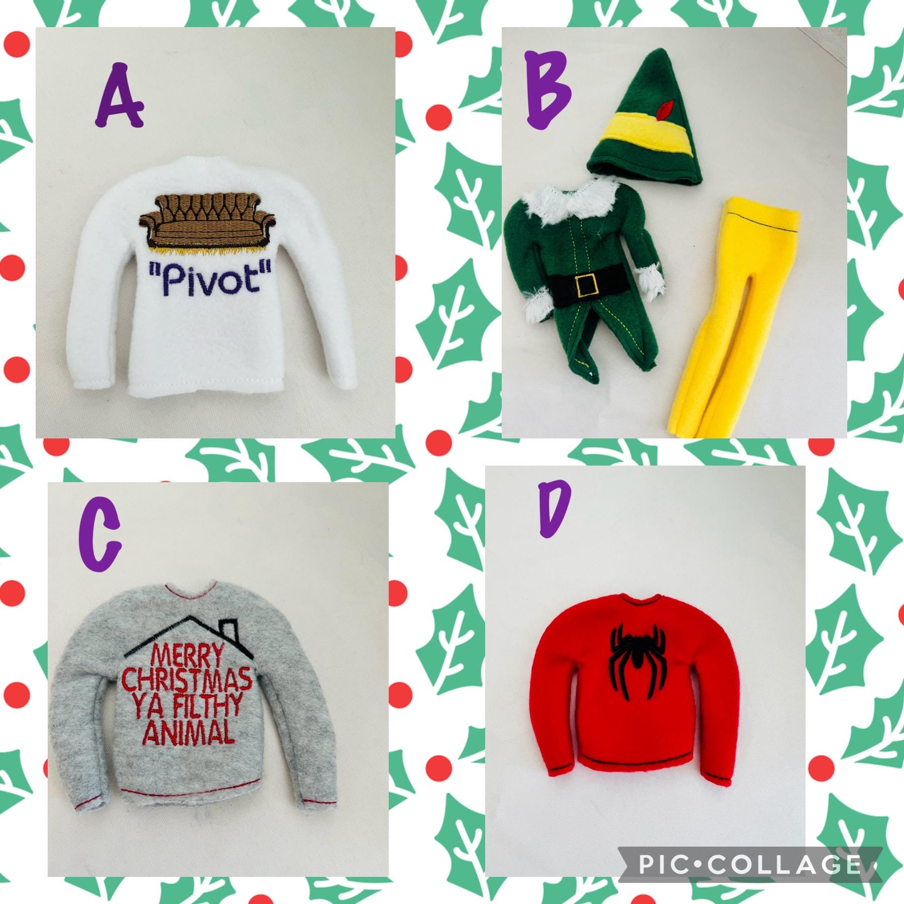 Give your little mischevious elf some clothes this holiday season! With a wide variety to choose from, your elf is sure to be stylish! These outfits are designed to fit an elf with hands that are free from one another. Simply shimmy his body through the top of the shirt or pants and dress him!
