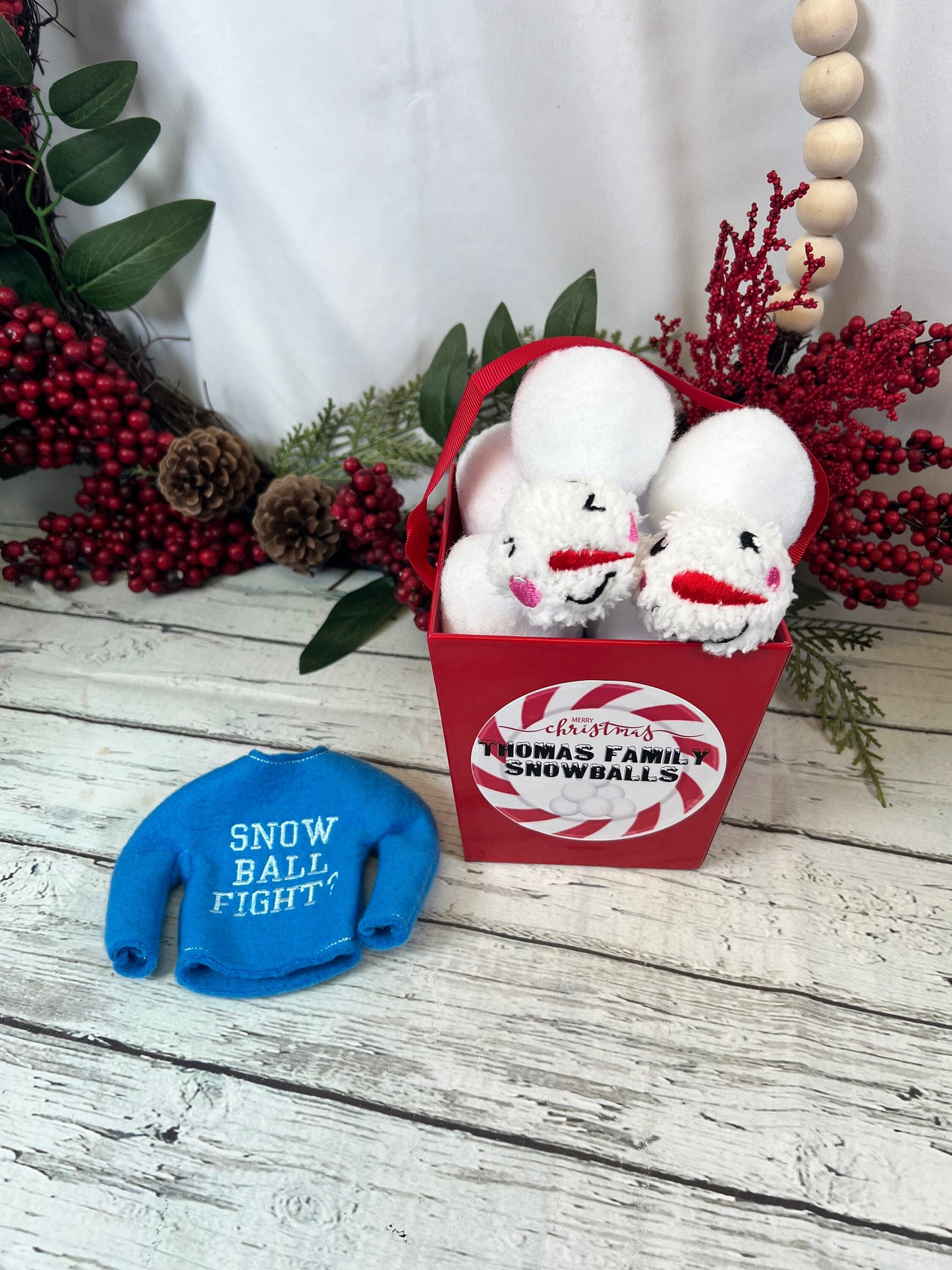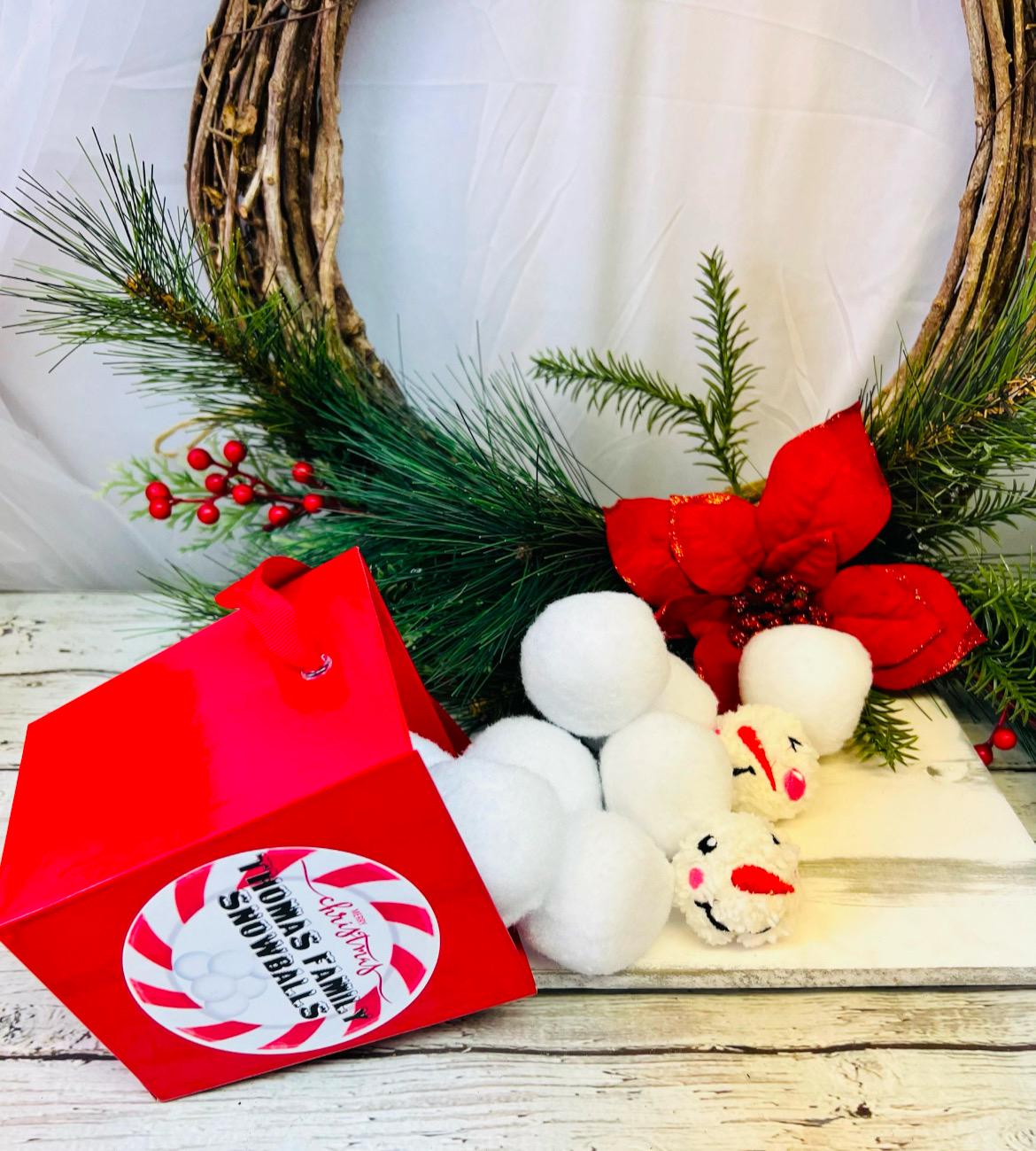 1 personalized bucket saying “*your last name* family snowballs” filled with soft snowballs and 2 snowman face snowballs