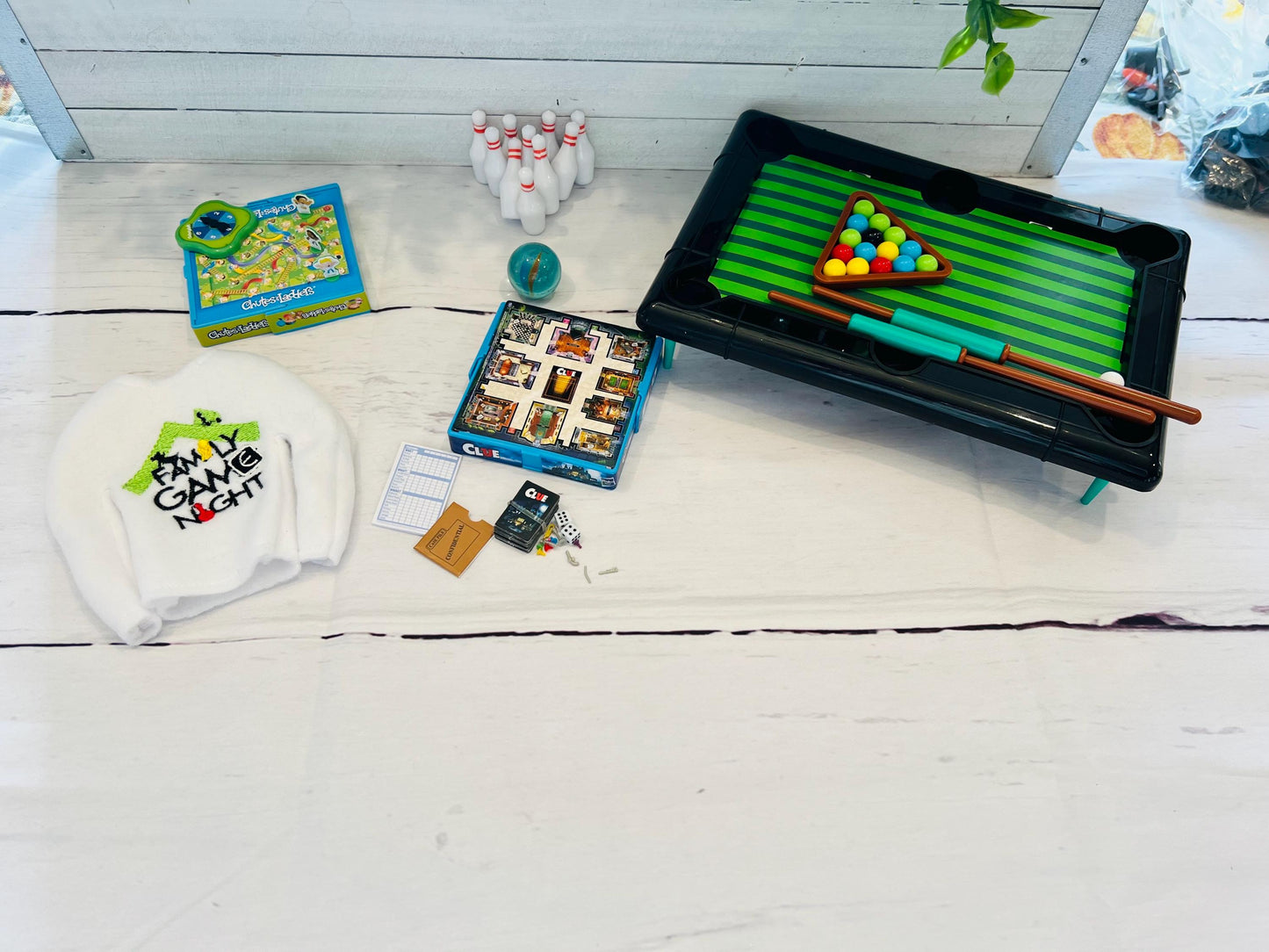 It’s family game night and your elf is here to play! Choose which games you want to play and your elf with bring them for display!