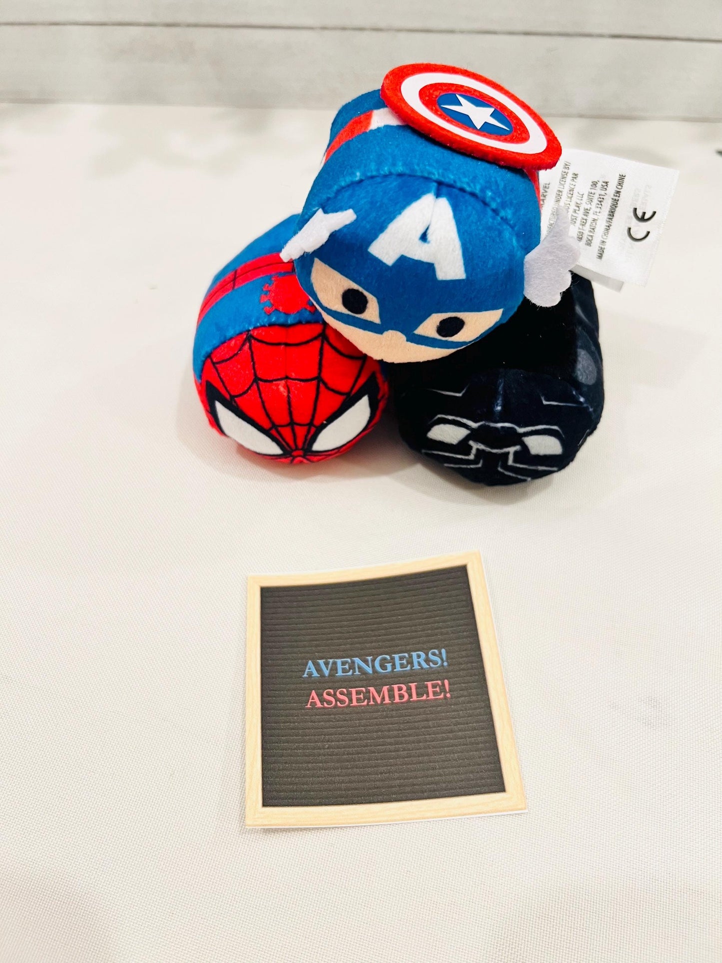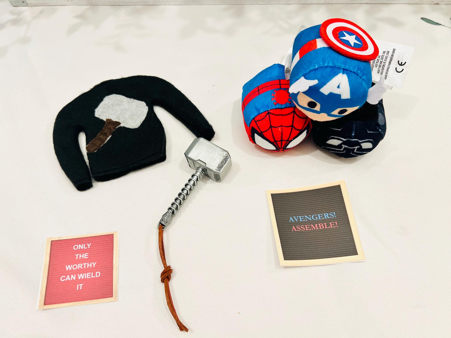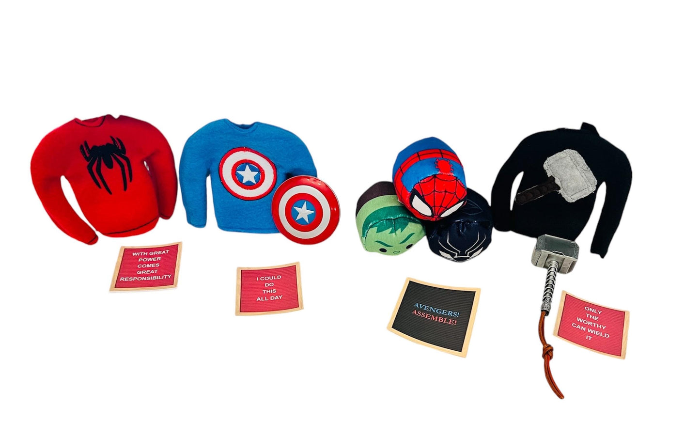 AVENGERS ASSEMBLE! Have your Elf help fight bad guys with this prime ensemble of avenger fighters! Choose your elf's theme! Each theme will come with an outfit for your elf, a themed accessory, and a cardstock sign specific to your character. Also included are three (3) stackable tsum tsum Marvel characters which will vary from that shown. Each kit will also come with one cardstock sign that say "Avengers! Assemble!"