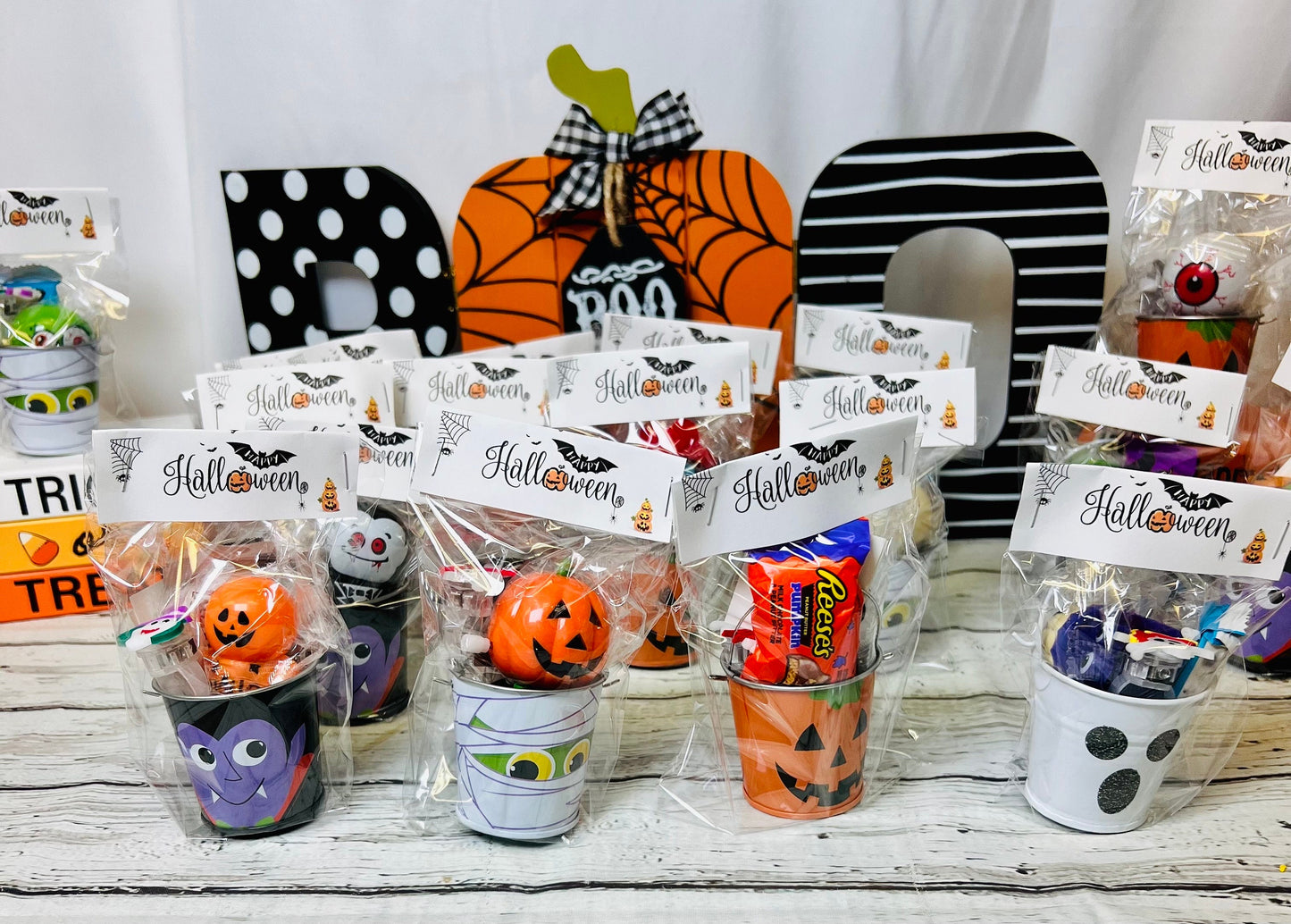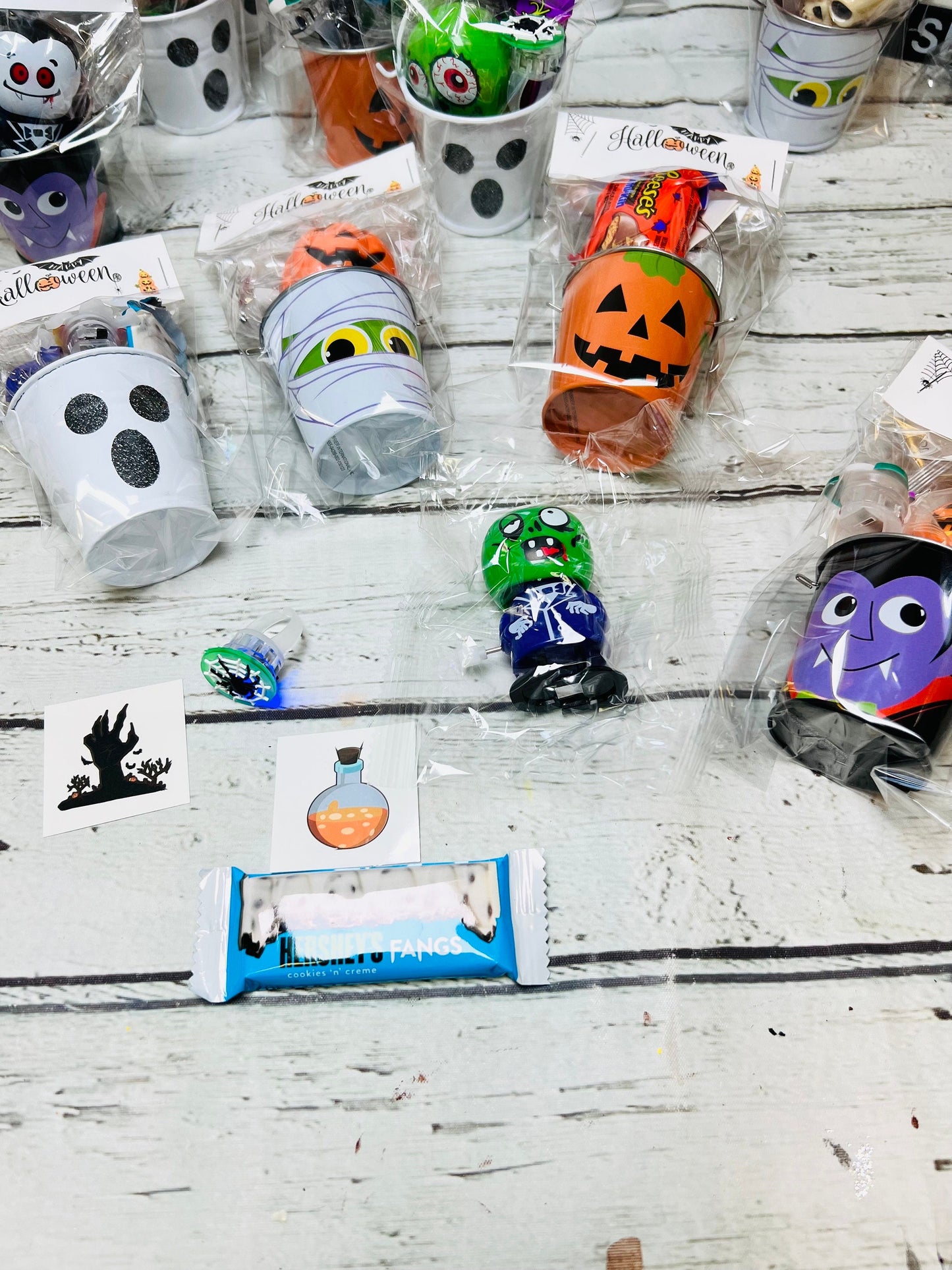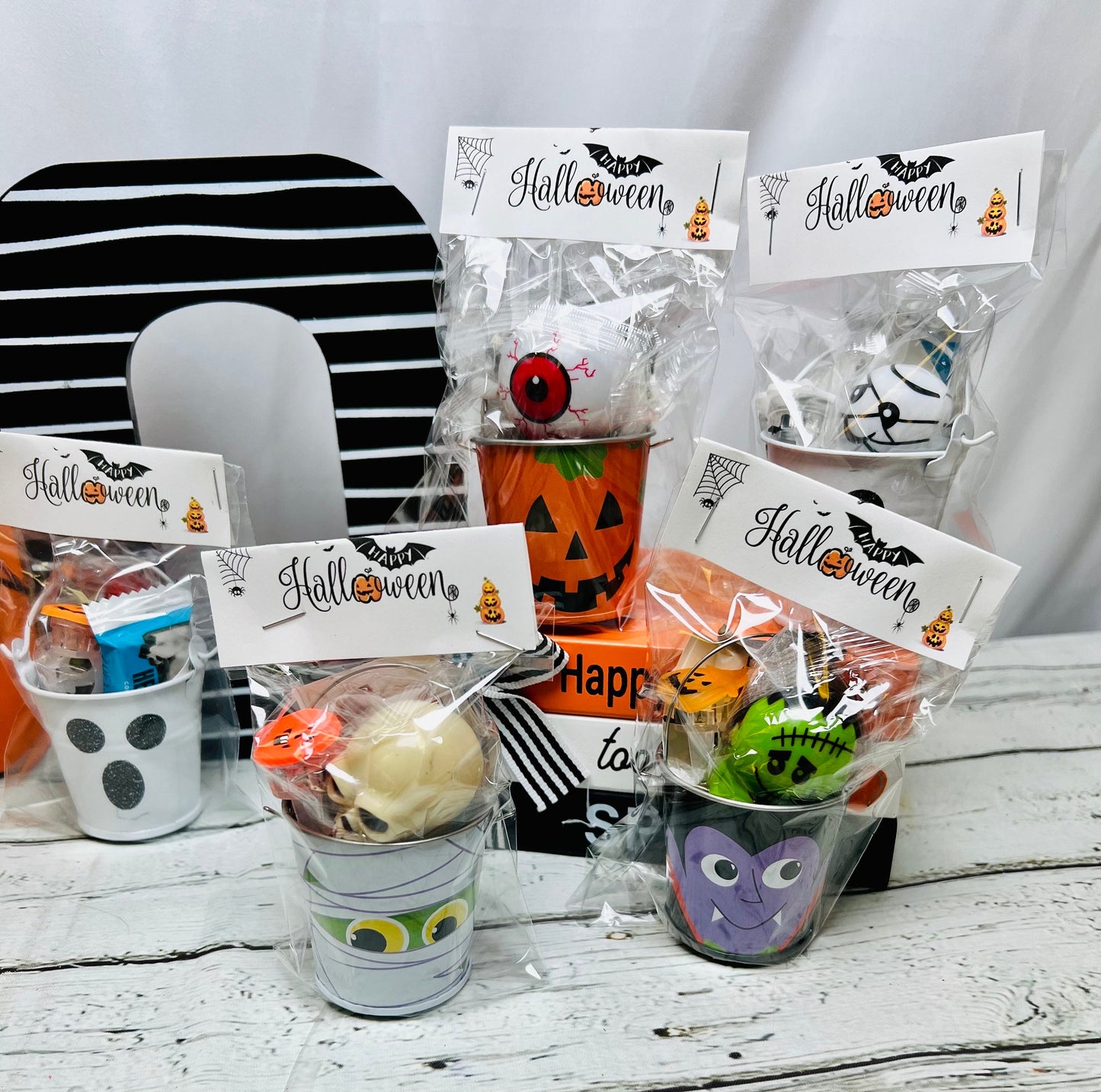 Want to give out a special one of a kind trick or treat this year? Look no further. These mini monster buckets are perfectly spooky, filled with a Halloween themed wind up toy, a Halloween themed treat (MAY CONTAIN NUTS!!), light up Halloween ring, & Halloween tattoos. Each mini bucket is wrapped in clear cellophane and topped with a Halloween bag topper.