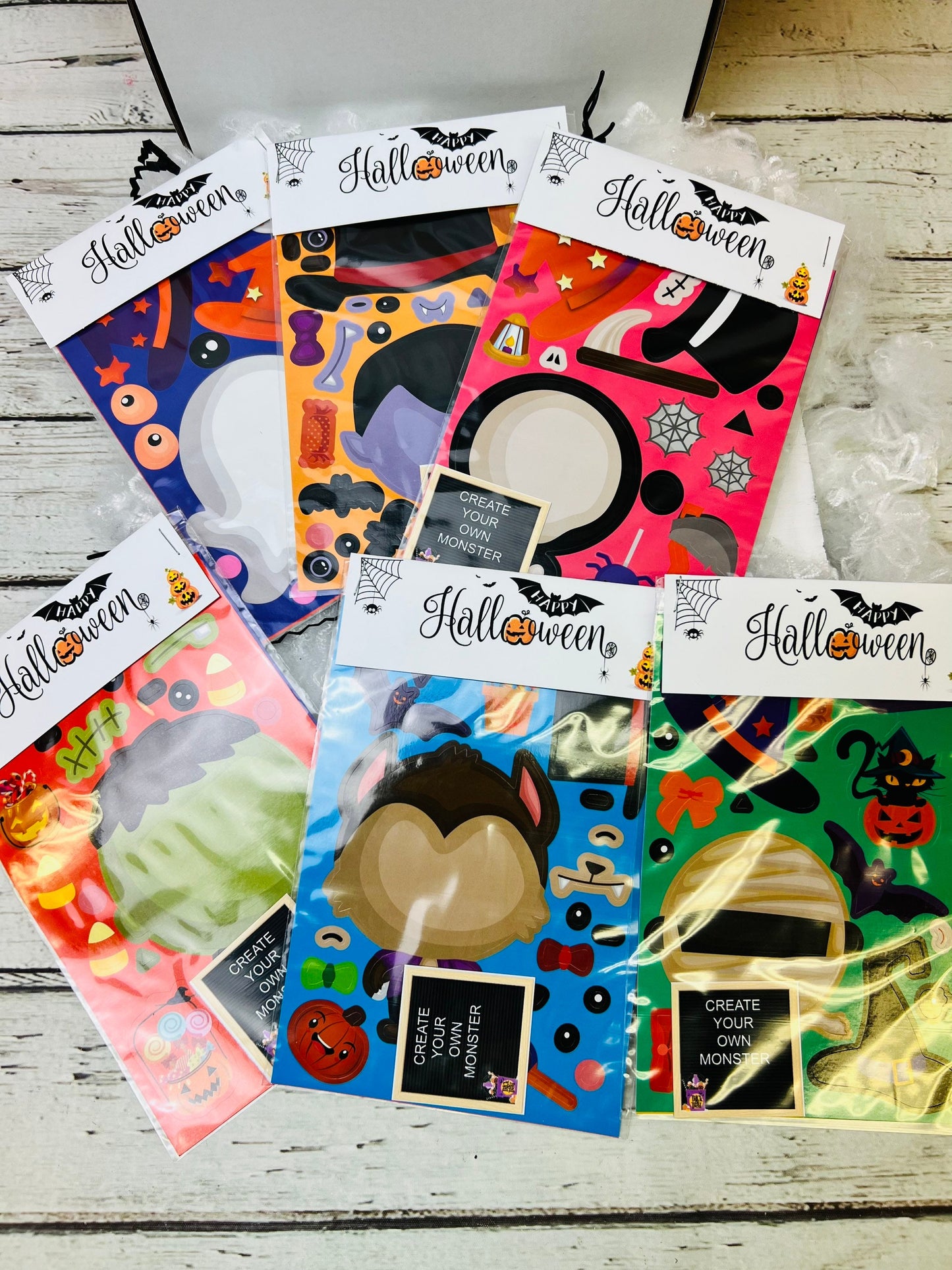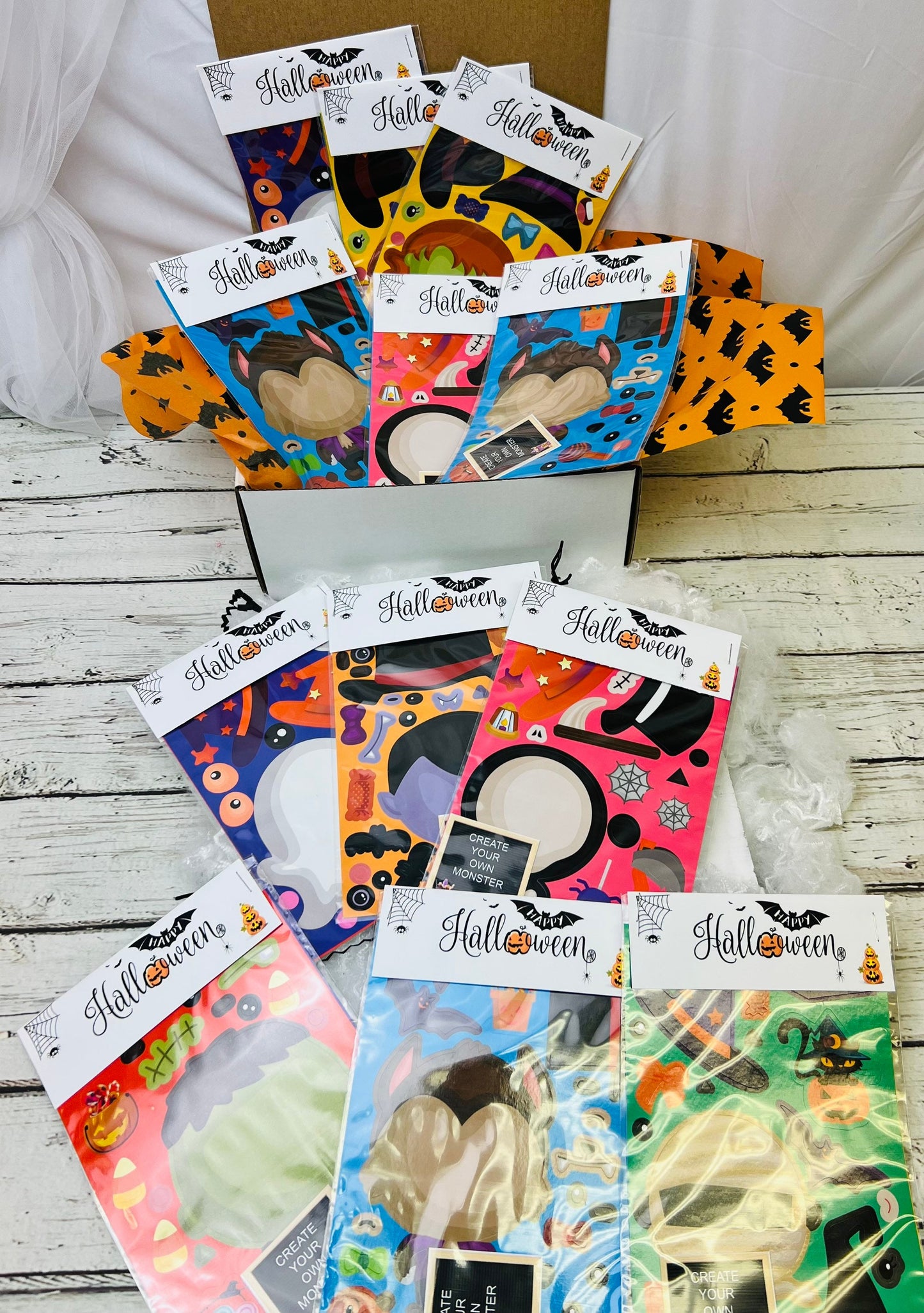 Create your own spooktacular character face. These are sticker sheets with a Halloween character and accessory stickers to create your own creature. Two character sticker sheets per bag, each individually wrapped with a cardstock sign in a cellophane bag, topped off with a halloween bag topper. These Halloween party favors are perfect for Trick or Treaters or just use as a Halloween craft.