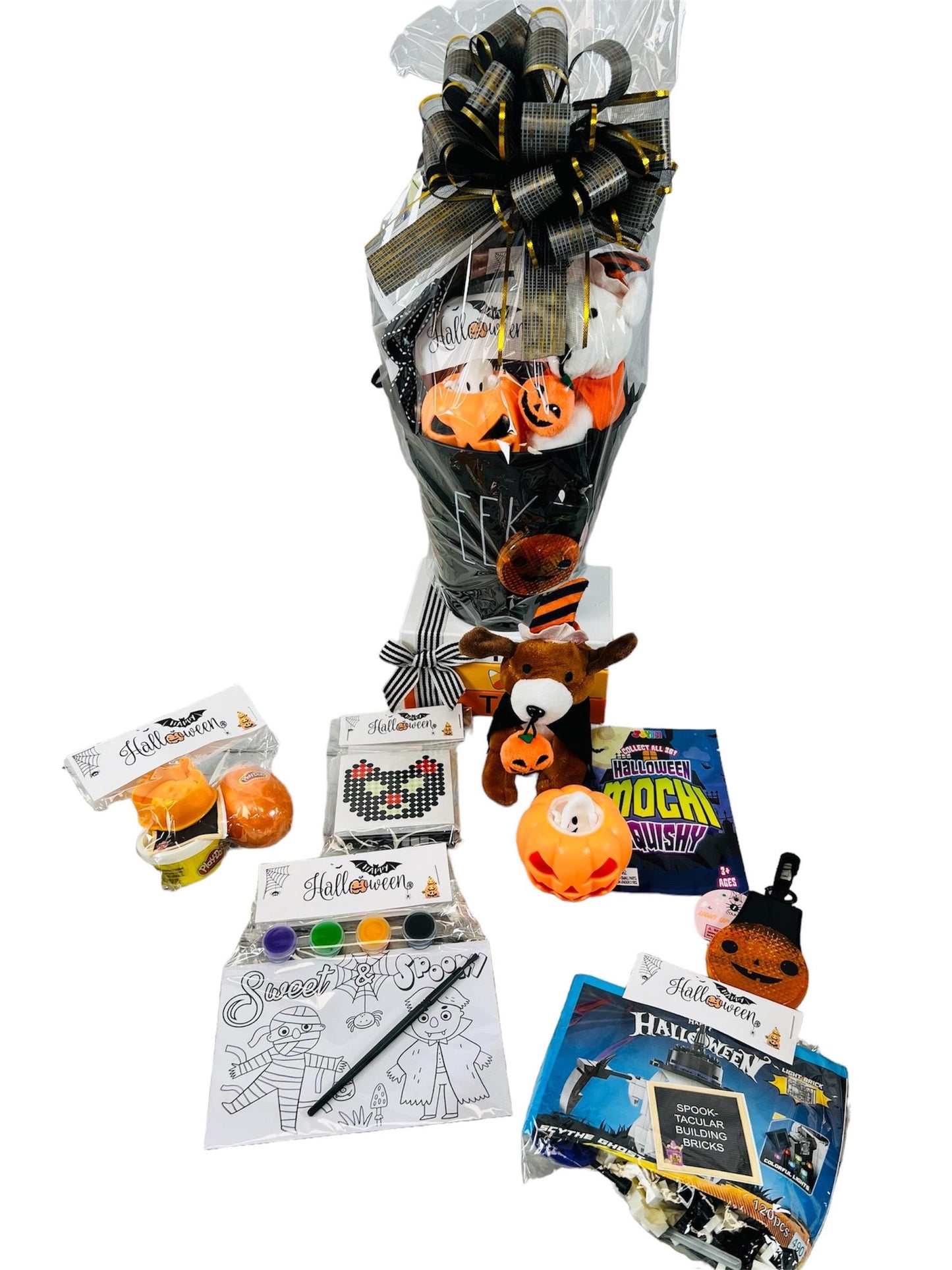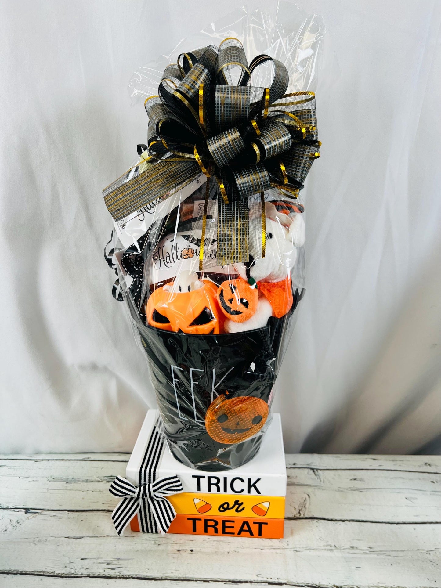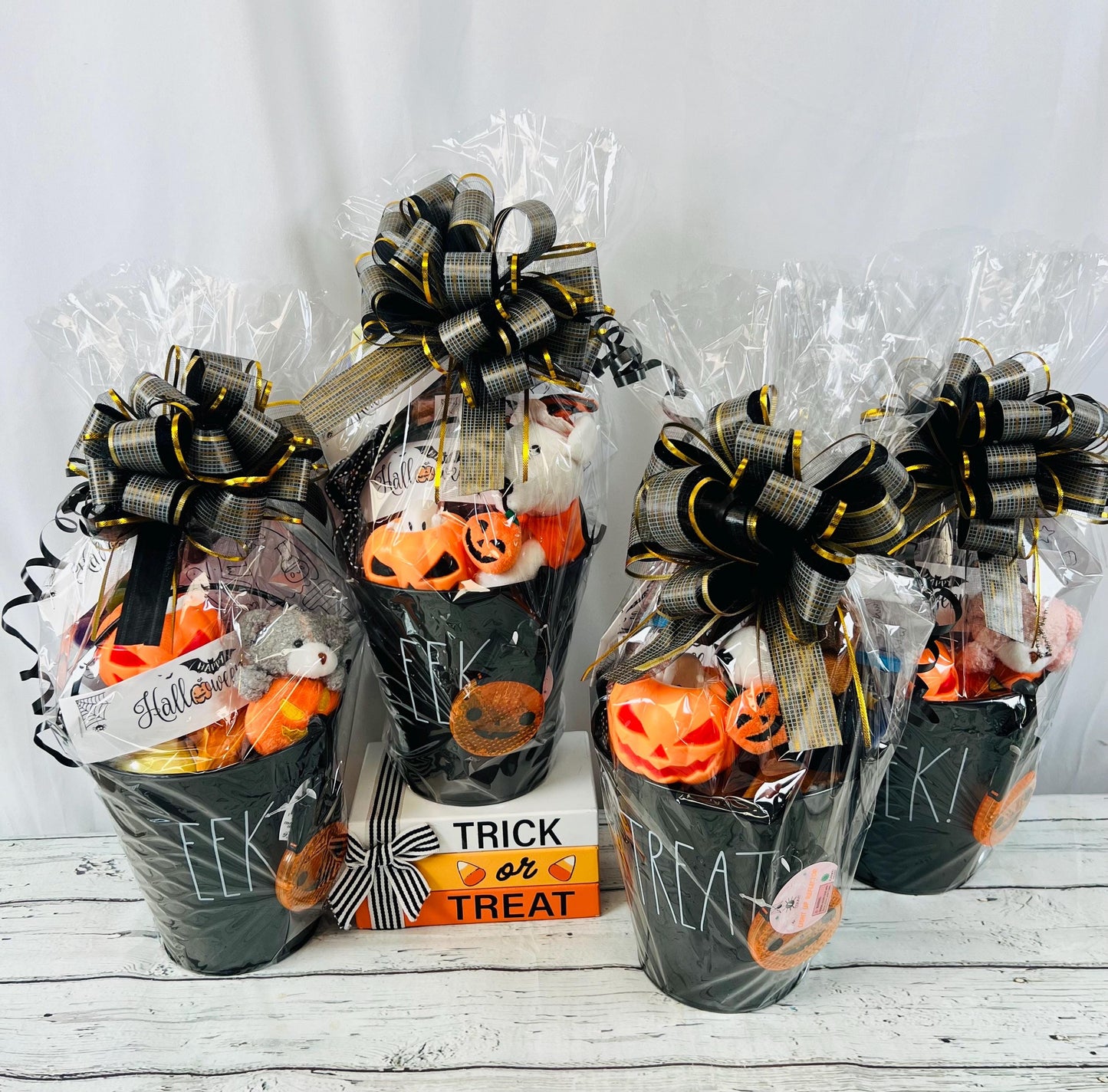 This Halloween Bucket for kids is sure to make your little boys and ghouls eek with excitement. This 4.5" bucket is filled with Spook-tacular Halloween tricks and toys! Each Bucket is wrapped in clear cellophane and topped with a large bow.