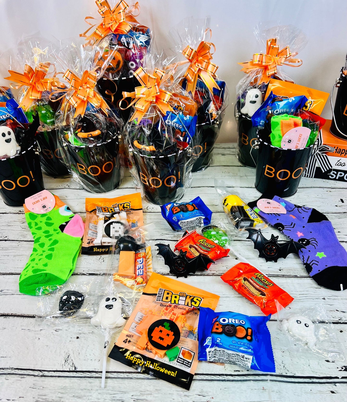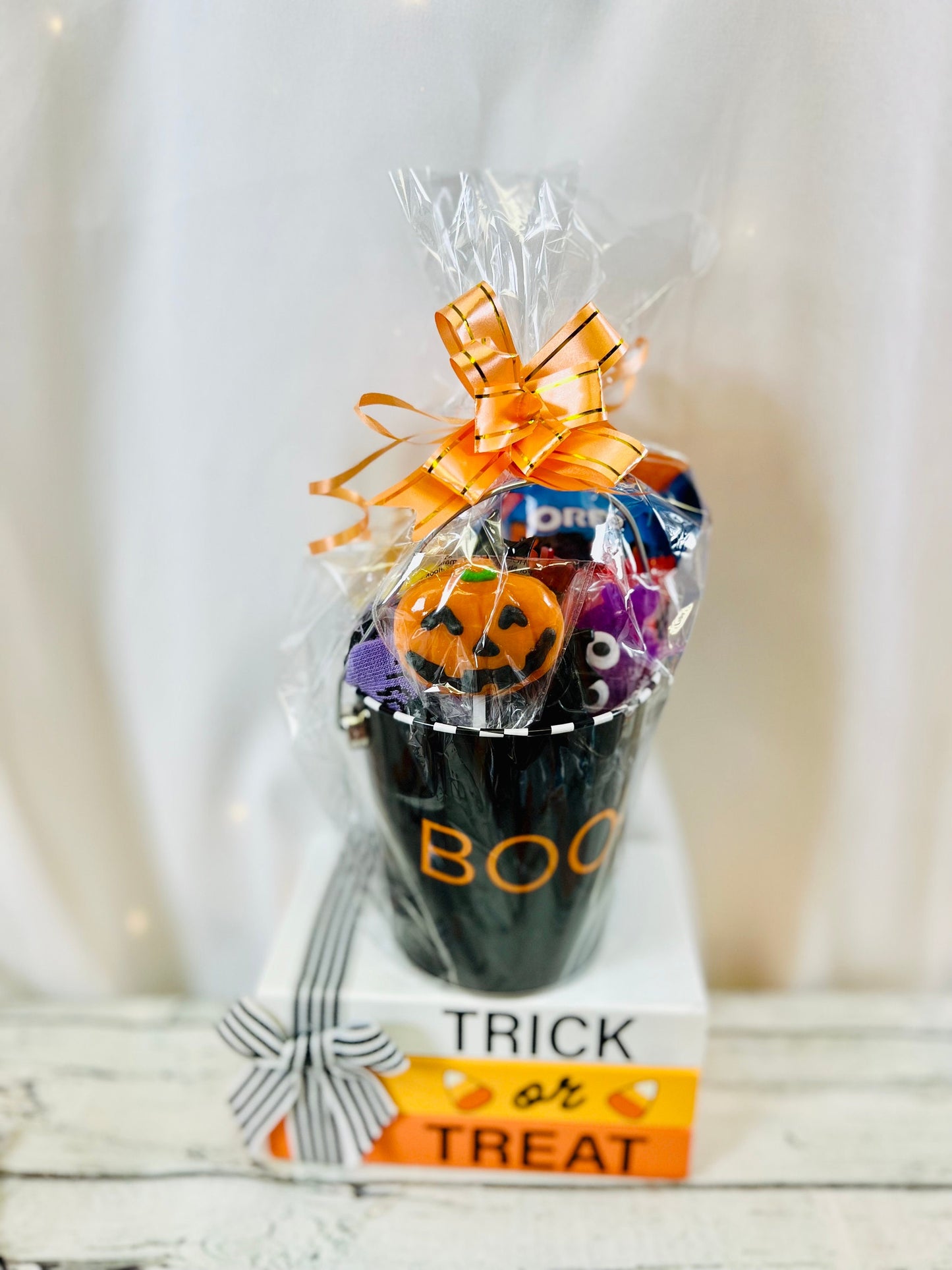 Gift your little boy or ghoul something fun, spooktacular and tasty this Halloween! Choose your bucket pail style and your socks. Each pail is filled with 10 fun Halloween tricks and treats. Each Pail is wrapped in clear cellophane and topped with a bow.