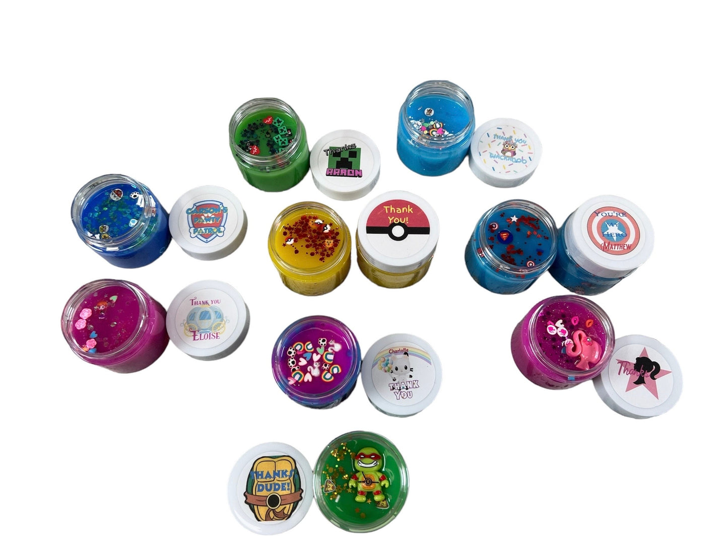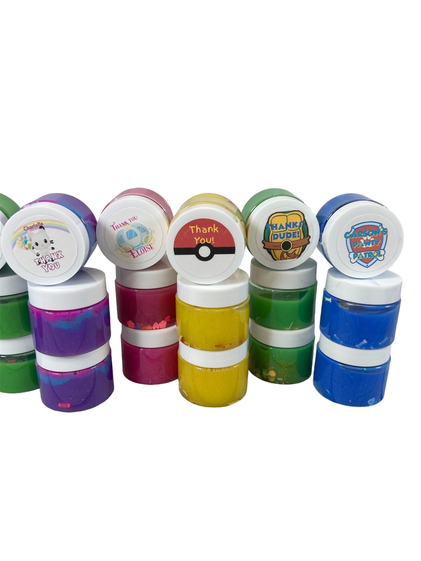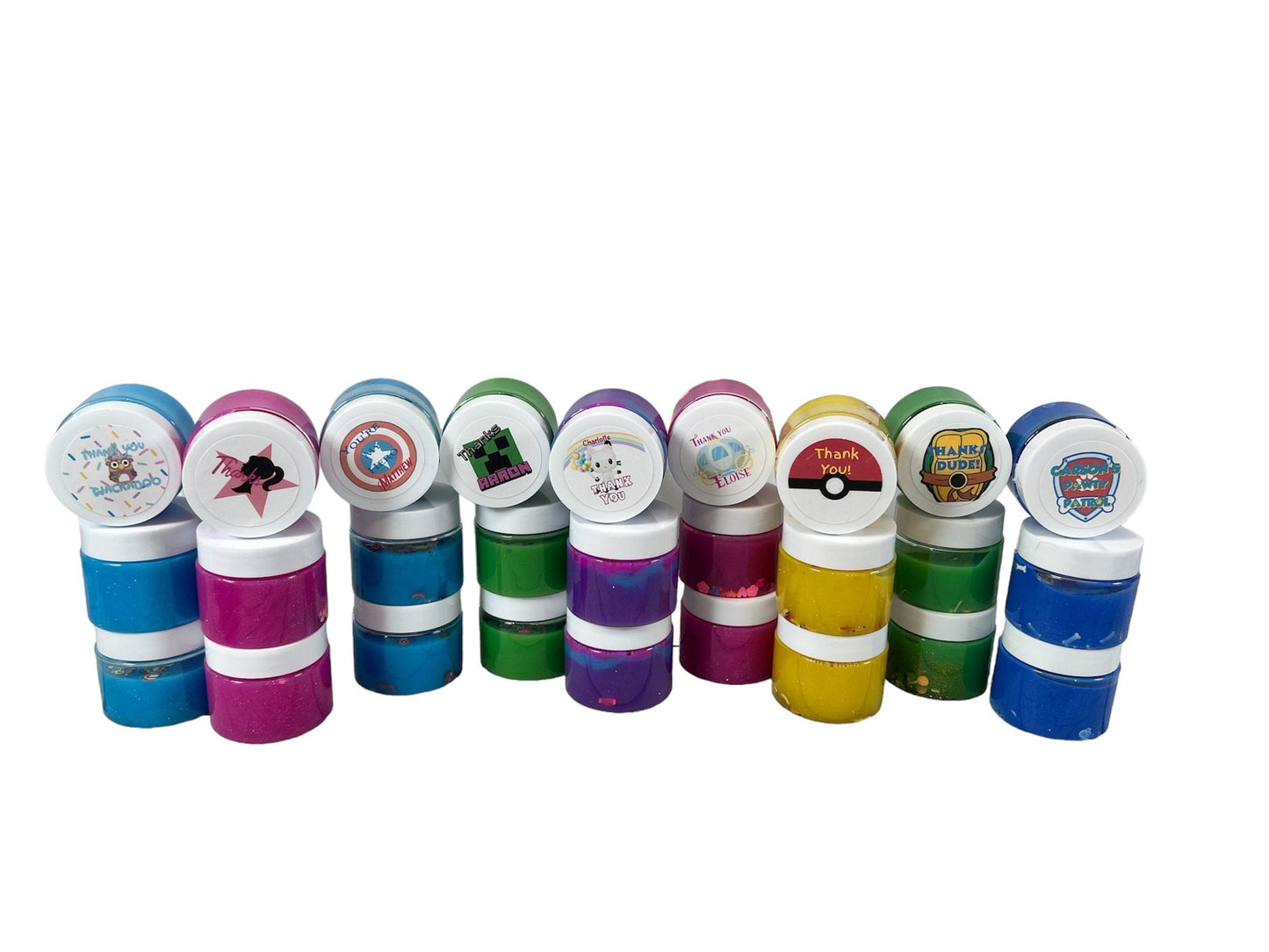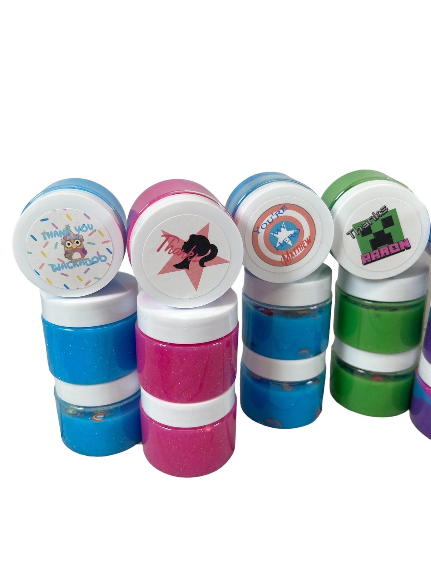 Give your little ones birthday party an extra dash of pizzazz with these personalized themed party favors. Each slime container is personalized with a themed party sticker with your little ones name on it, see photos for reference. These 2 oz individual slime containers are a perfect addition to your party favor bags! Or if you don't want to create your own bags, please visit my other listing for completed party favors and I will do all the work for you!