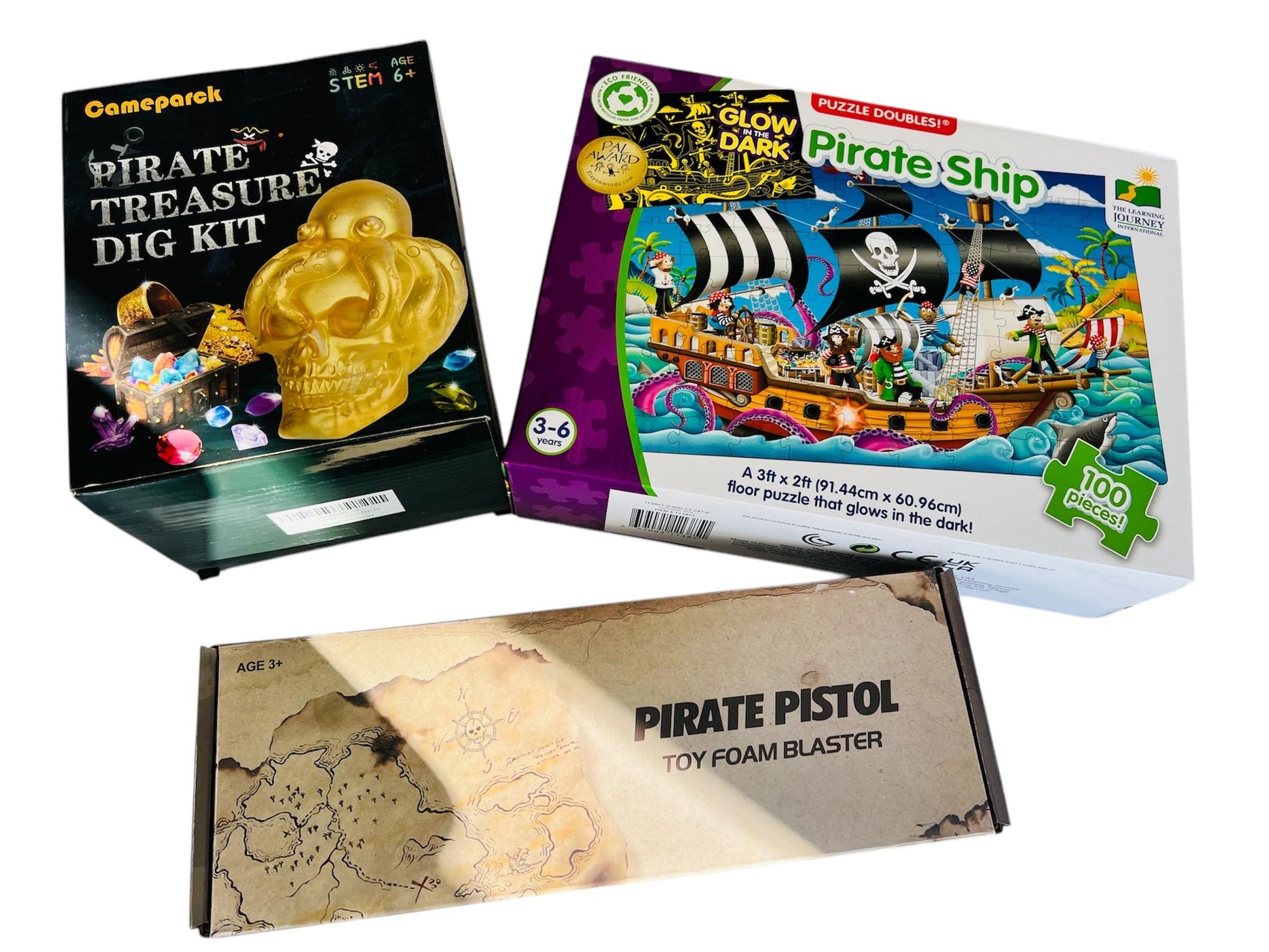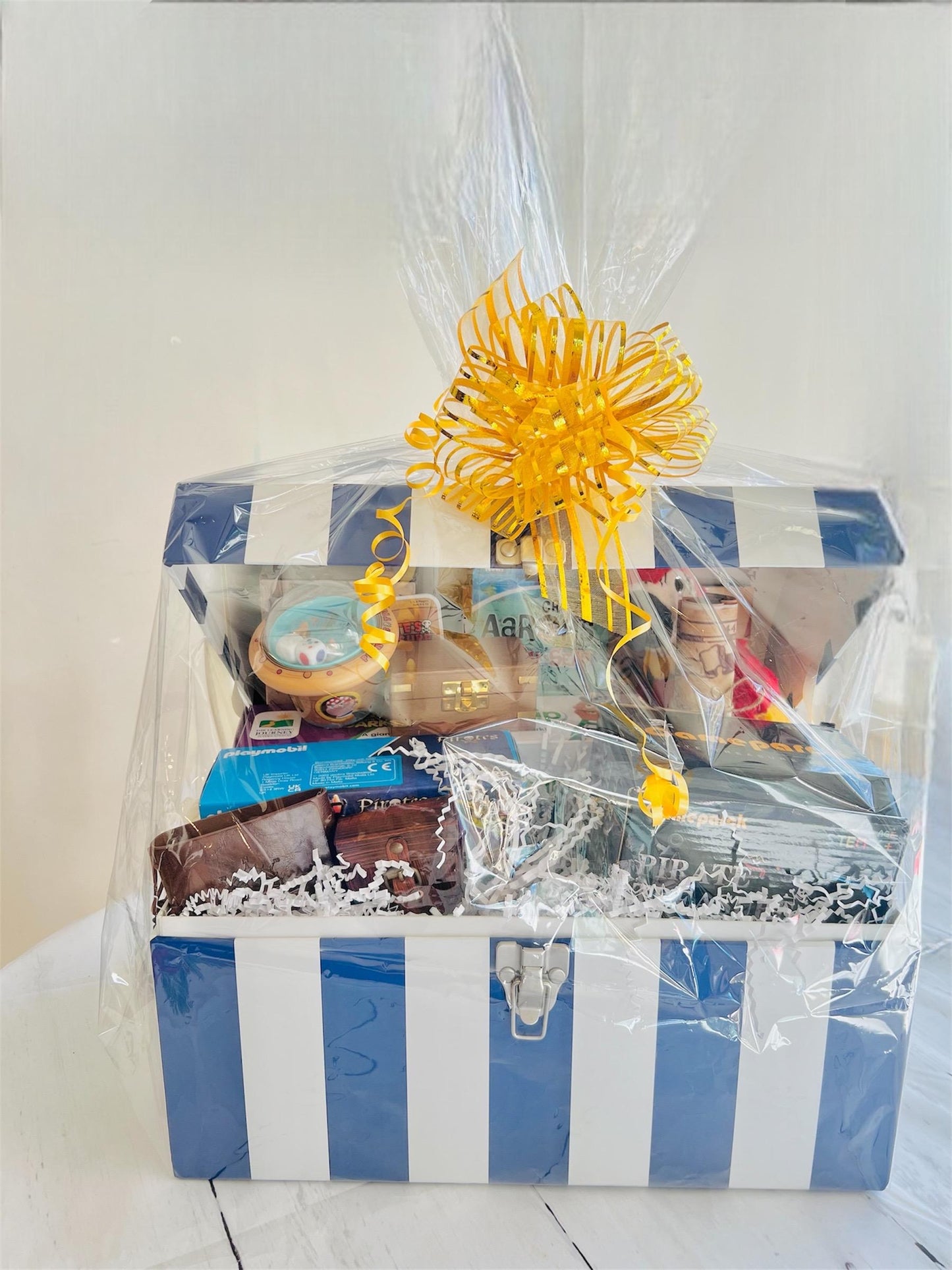 Have a little scallywag that loves an adventure? Argh! This pirate themed gift basket is sure please! With 14 pirate themed gifts, the fun never ends! This basket is heavy, so be aw-argh! Wrapped in clear cellophane and topped with a large bow, this basket includes: