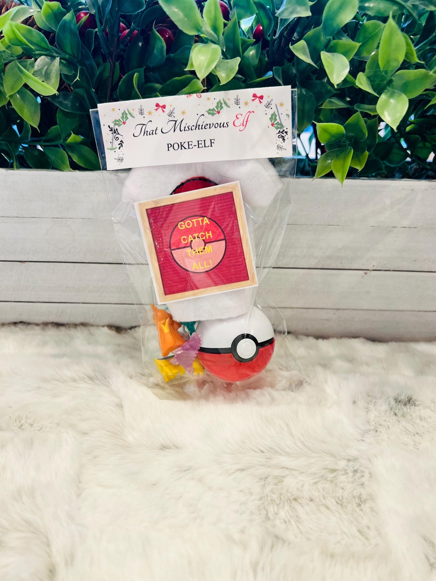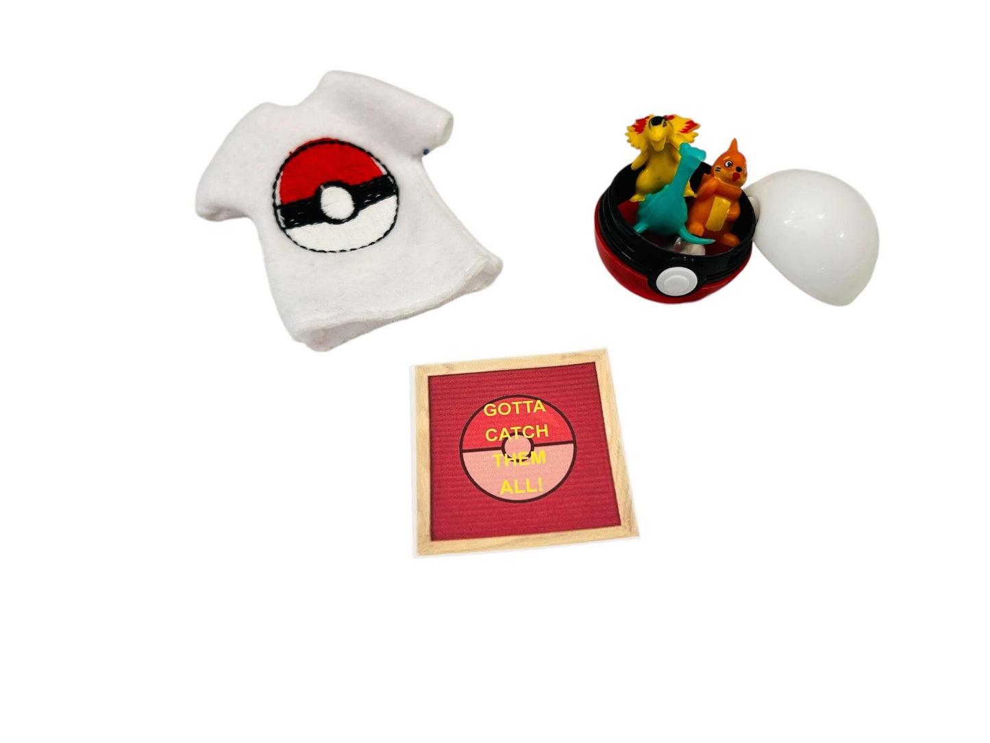 Gotta catch them all! Delight your little pokemon lover with cute prop kit for your elf. This kit comes with a shirt for your elf (choose your style) a mini pokeball, 5 miniature pokemon figurines and a cardstock sign “gotta catch them all”