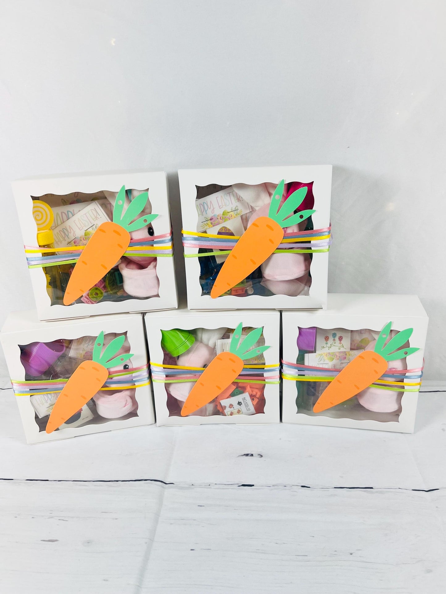 Each box is wrapped in colorful ribbon and topped with a paper stock carrot!