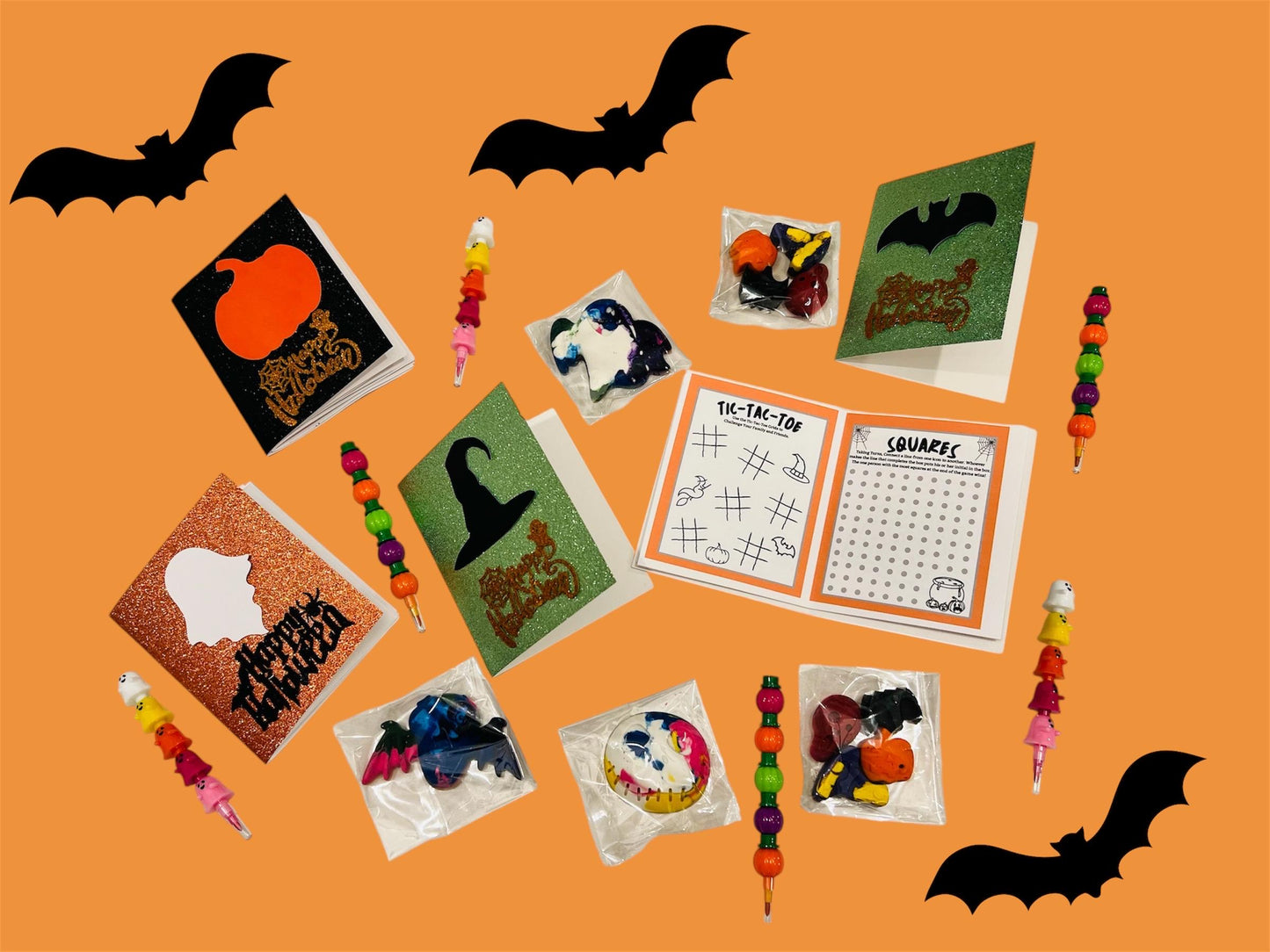 Give spooktacular fun this Halloween with these handcrafted Halloween activity coloring books with homemade non toxic themed crayon and stackable Halloween crayons (pumpkin or ghost, style will vary).