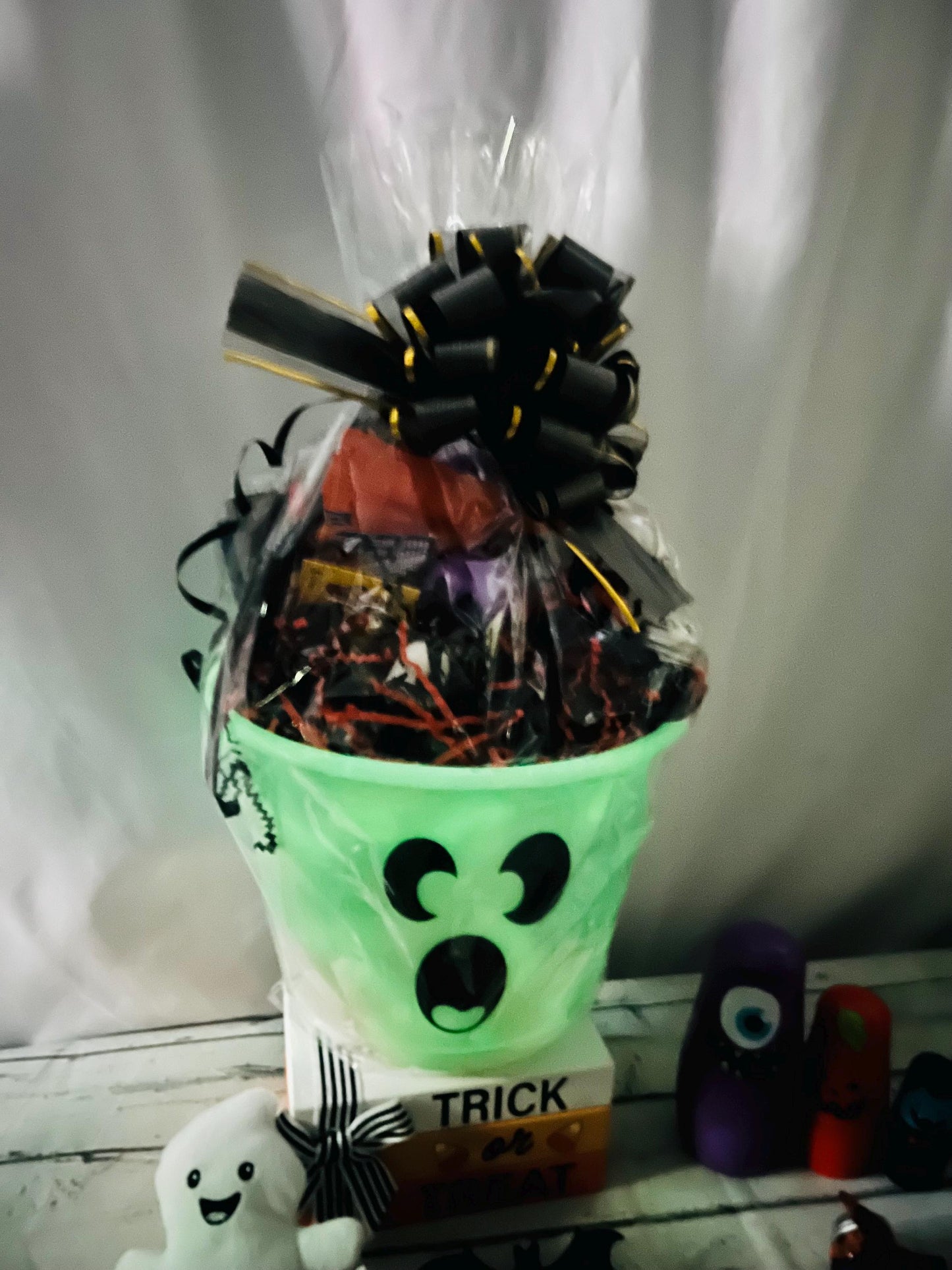 Give your little Ghoul or Goblin this spook-tacular Halloween themed gift bucket to make them scream with delight! Choose your theme- Pumpkin or Glow in the Dark Ghost- each theme comes different goodies! Add personalization to your bucket in the following matte vinyl lettering - black, green. orange, or Glow in the dark (**glow in the dark may not show up on the glow in the dark ghost bucket**).