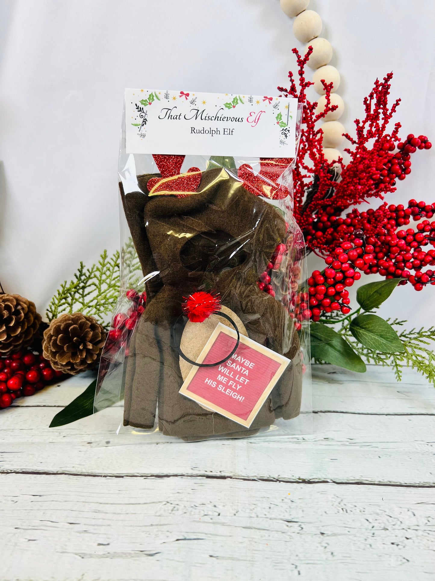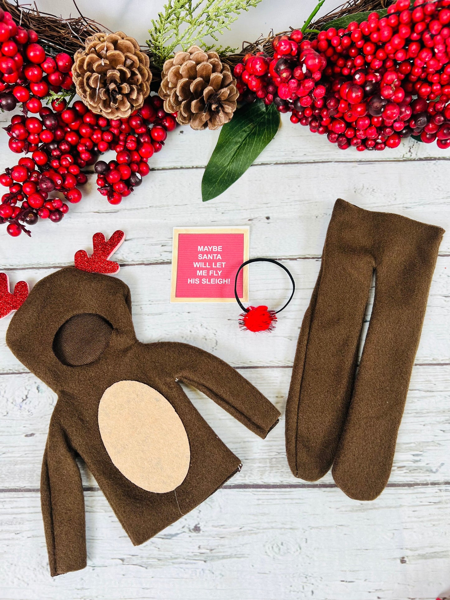 This kit is perfect for your nightly elf shenanigans! Your elf will look so cute in this reindeer outfit and “shining” nose! (Elf doll is not included in kit)