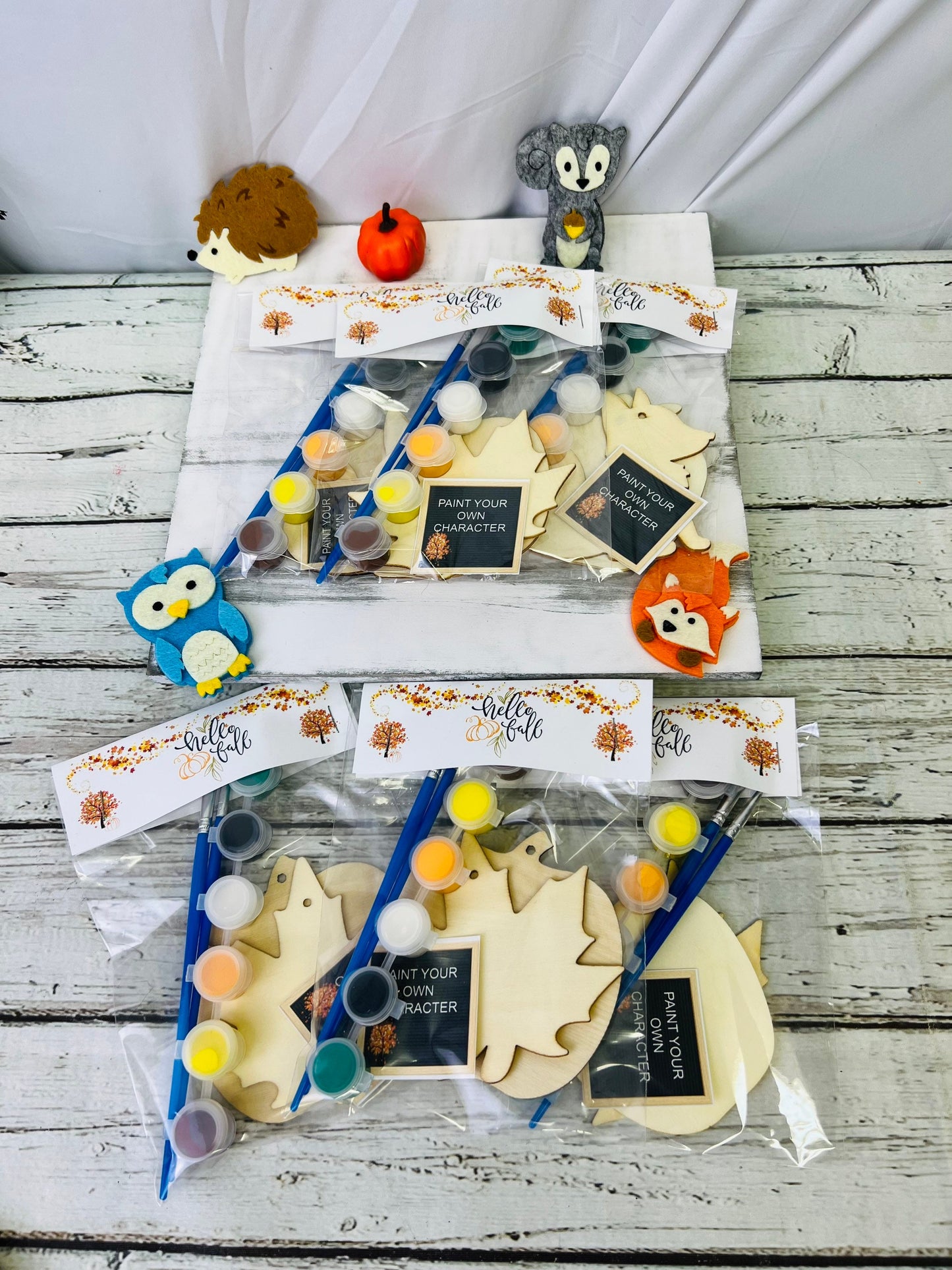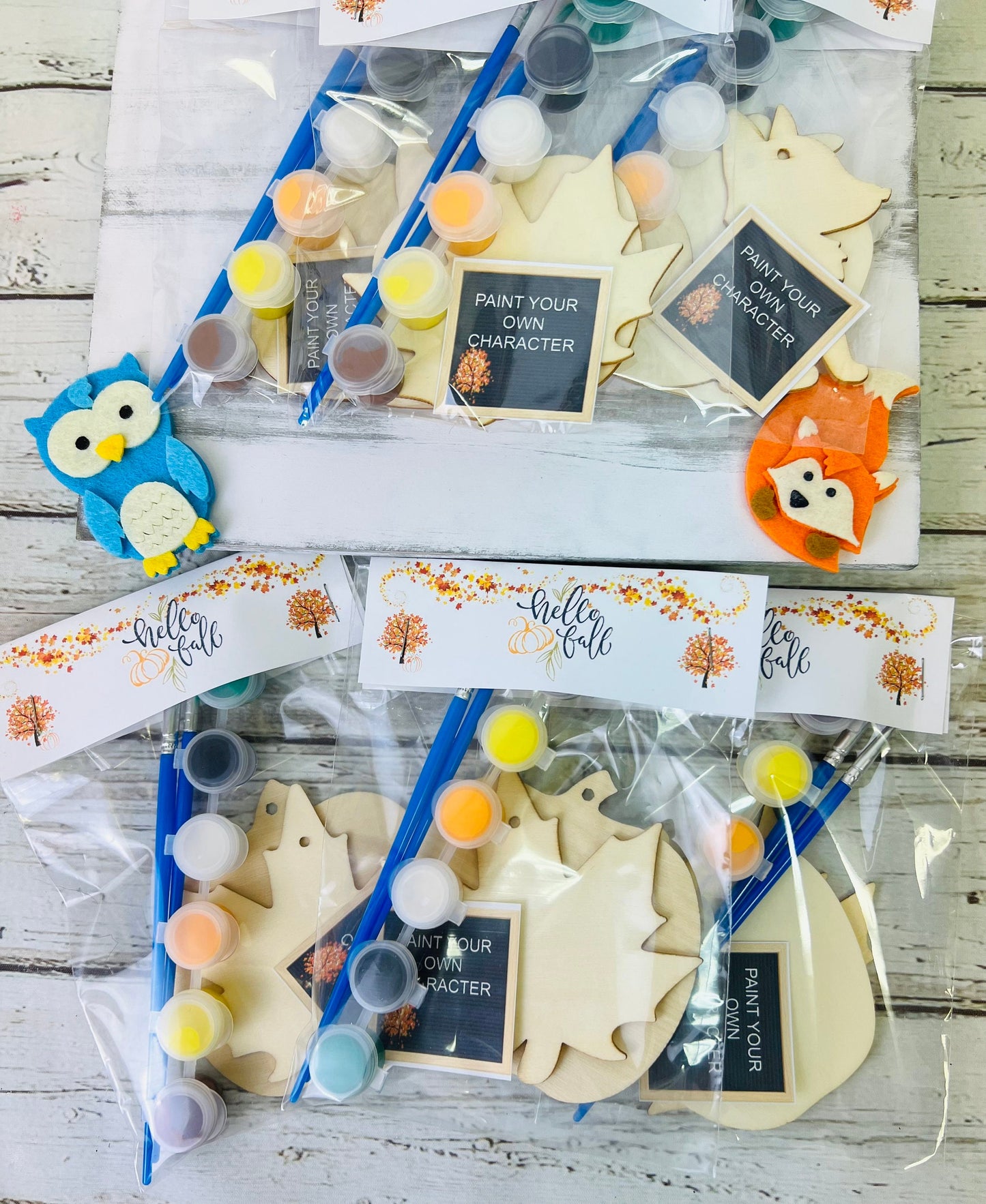 Paint your own Fall themed wooden character. Kit includes 2 wooden Fall characters, 2 paintbrushes, and 6 Fall colored paints. Each kit is individually wrapped with a cardstock sign in a cellophane bag, topped off with a "hello fall" bag topper. These Fall party favors are perfect for classroom parties, holiday boredom busters or take on the go!