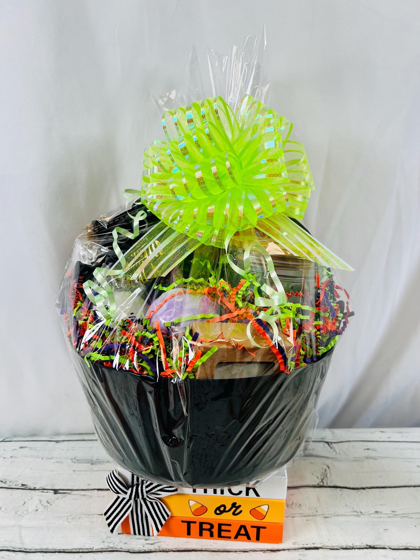 Give that special someone a Halloween themed gift basket complete with all things spooky! This basket is perfect for relaxing or even just for giggles!